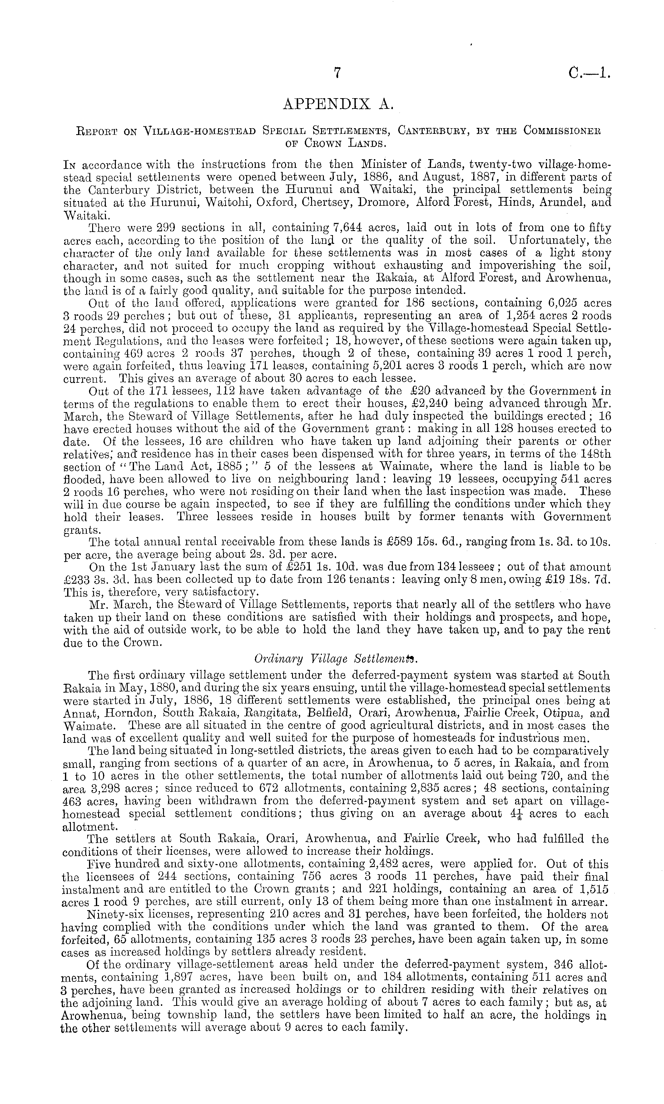 APPENDIX A. Eepobt on Village-homestead Special Settlements, Cantekbuky, by the Commissionek op Ckown Lands. In accordance with the instructions from the then Minister of Lands, twenty-two village-home-stead special settlements were opened between July, 1886, and August, 1887, in different parts of the Canterbury District, between the Hurunui and Waitaki, the principal settlements being situated at the Hurunui, Waitohi, Oxford, Chertsey, Dromore, Alford Forest, Hinds, Arundel, and Waitaki. There were 299 sections in all, containing 7,644 acres, laid out in lots of from one to fifty acres each, according to the position of the land or the quality of the soil. Unfortunately, the character of the only land available for these settlements was in most cases of a light stony character, and not suited for much cropping without exhausting and impoverishing the soil, though in some cases, such as the settlement near the Eakaia, at Alford Forest, and Arowhenua, the land is of a fairly good quality, and suitable for the purpose intended. Out of the land offered, applications wore granted for 186 sections, containing 6,025 acres 3 roods 29 perches ; but out of these, 31 applicants, representing an area of 1,254 acres 2 roods 24 perches, did not proceed to occupy the laud as required by the Village-homestead Special Settlement Regulations, and the leases were forfeited ; 18, however, of these sections were again taken up, containing 469 acres 2 roods 37 perches, though 2 of those, containing 39 acres 1 rood 1 perch, were again forfeited, thus leaving 171 leases, containing 5,201 acres 3 roods 1 perch, which are now current. This gives an average of about 30 acres to each lessee. Out of the 171 lessees, 112 have taken advantage of the £20 advanced by the Government in terms of the regulations to enable them to erect their houses, £2,240 being advanced through Mr. March, the Steward of Village Settlements, after he had duly inspected the buildings erected ; 16 have erected houses without the aid of the Government grant: making in all 128 houses erected to date. Of the lessees, 16 are children who have taken up land adjoining their parents or other relatives,' and residence has in their cases been dispensed with for three years, in terms of the 148 th section of "The Land Act, 1885 ; " 5 of the lessees at "Waimate, where the land is liable to be flooded, have been allowed to live on neighbouring land : leaving 19 lessees, occupying 541 acres 2 roods 16 perches, who were not residing on their land when the last inspection was made. These will in due course be again inspected, to see if they are fulfilling the conditions under which they hold their leases. Three lessees reside in houses built by former tenants with Government grants. The total annual rental receivable from these lands is £589 15s. 6d., ranging from Is. 3d. to 10s. per acre, the average being about 2s. 3d. per acre. On the Ist January last the sum of £251 Is. lOd. was due from 134 lessees ; out of that amount £233 3s. 3d. has been collected up to date from 126 tenants : leaving only 8 men, owing £19 18s. 7d. This is, therefore, very satisfactory. Mr. March, the Steward of Village Settlements, reports that nearly all of the settlers who have taken up their land on these conditions are satisfied with their holdings and prospects, and hope, with the aid of outside work, to be able to hold the land they have taken up, and to pay the rent due to the Crown. Ordinary Village Settlements. The first ordinary village settlement under the deferred-payment system was started at South Eakaia in May, 1880, and during the six years ensuing, until the village-homestead special settlements were started in July, 1886, 18 different settlements were established, the principal ones being at Annat, Horndon, South Eakaia, Eangitata, Belfield, Orari, Arowhenua, Fairlie Creek, Otipua, and Waimate. These are all situated in the centre of good agricultural districts, and in most cases the land was of excellent quality and well suited for the purpose of homesteads for industrious men. The land being situated in long-settled districts, the areas given to each had to be comparatively small, ranging from sections of a quarter of an acre, in Arowhenua, to 5 acres, in Eakaia, and from 1 to 10 acres in the other settlements, the total number of allotments laid out being 720, and the area 3,298 acres; since reduced to 672 allotments, containing 2,835 acres; 48 sections, containing 463 acres, having been withdrawn from the deferred-payment system and set apart on villagehomestead special settlement conditions; thus giving on an average about 4J acres to each allotment. The settlers at South Eakaia, Orari, Arowhenua, and Fairlie Creek, who had fulfilled the conditions of their licenses, were allowed to increase their holdings. Five hundred and sixty-one allotments, containing 2,482 acres, were applied for. Out of this the licensees of 244 sections, containing 756 acres 3 roods 11 perches, have paid their final instalment and are entitled to the Crown grants ; and 221 holdings, containing an area of 1,515 acres 1 rood 9 perches, are still current, only 13 of them being more than one instalment in arrear. Ninety-six licenses, representing 210 acres and 31 perches, have been forfeited, the holders not having complied with the conditions under which the land was granted to them. Of the area forfeited, 65 allotments, containing 135 acres 3 roods 23 perches, have been again taken up, in some cases as increased holdings by settlers already resident. Of the ordinary village-settlement areas held under the deferred-payment system, 346 allotments, containing 1,897 acres, have been built on, and 184 allotments, containing 511 acres and 3 perches, have been granted as increased holdings or to children residing with their relatives on the adjoining land. This would give an average holding of about 7 acres to each family; but as, at Arowhenua, being township land, the settlers have b