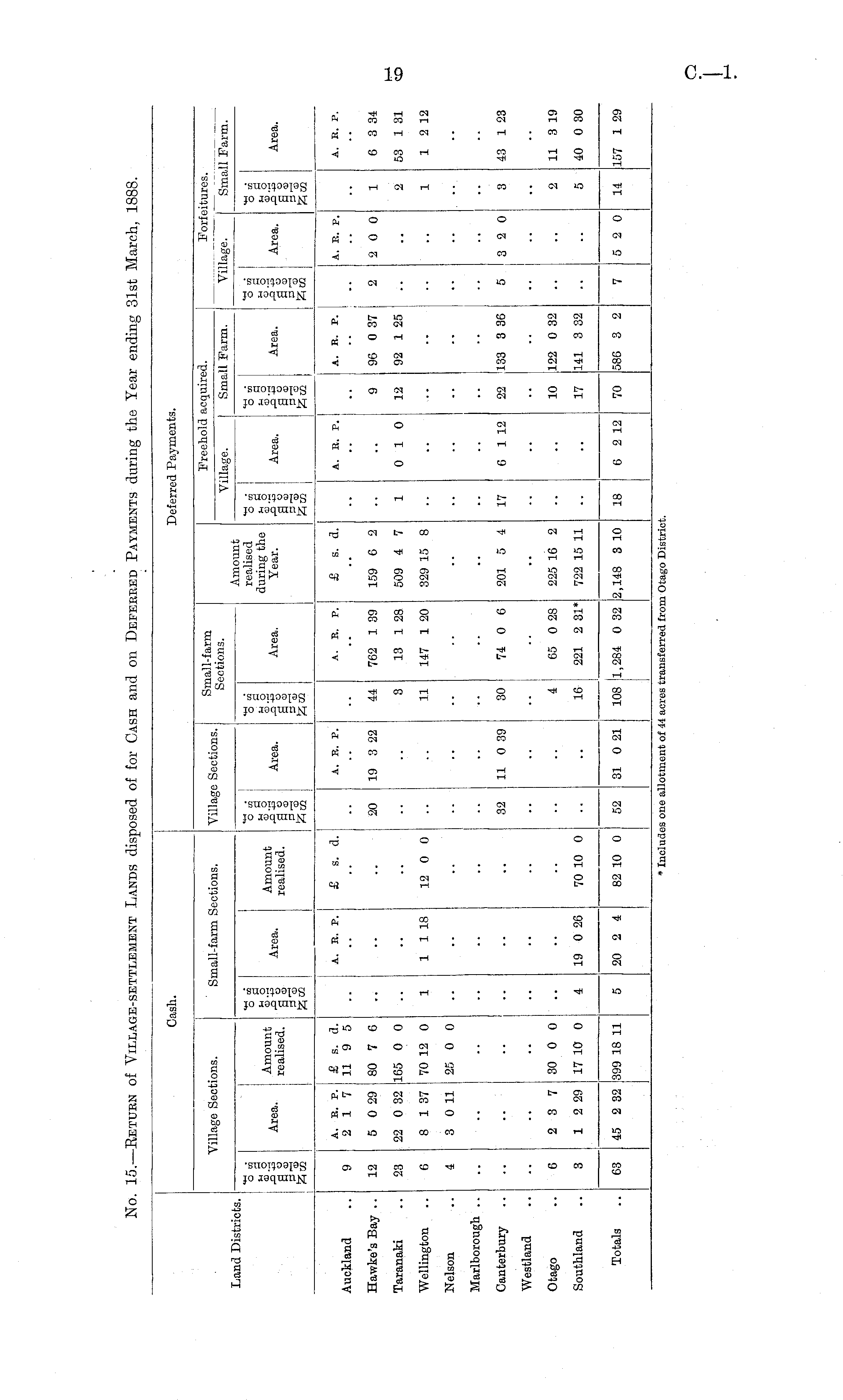 Cash. Deferred Payments. Small-farm Sections. Freehold acquired. Forfeitures. Village Sections. Small-farm Sections. Village Sections. i~iVillage. Small Farm. Village. Small Farm. si ■g-5 9 CD Area. Amount realised. CD *-h 0 CD Area. Amount realised. O en So 3CQ Area. si CD .3 ■§■§ Area. realised during the Year. O cfl I IS Area. 81 Area. O CQ j •5 -S ! Area. S CD 1 "o en S 2 -Si Area. Auckland 9 A. E. P. 2 17 £ s. a. 11 9 5 A. E. p. £ s. d. A. R. P. A. B. P. I £ s. a. A. B. P. i A. B. P. A. B. P. a. b. r. •■ Hawke's Bay .. 12 5 0 29 80 7 6 20 19 3 22 44 762 1 39 159 6 2 9 96 0 37 2 2 0 0 1 6 3 34 Taranaki 23 22 0 32 165 0 0 3 13 1 28 509 4 7 1 0 10 12 92 1 25 2 53 1 31 Wellington 6 8 1 37 70 12 0 1 1 1 18 12 0 0 11 147 1 20 329 15 8 1 1 2 12 Nelson 4 3 0 11 25 0 0 I i I i Marlborough .. I i I Canterbury 32 11 0 39 30 74 0 6 201 5 4 17 6 1 12 22 133 3 36 5 I 3 2 0 | 3 43 1 23 Westland Otago 6 2 3 7 30 0 0 4 65 0 28 225 16 2 10 122 0 32 2 11 3 19 Southland 3 1 2 29 17 10 0 4 19 0 26 70 10 0 16 221 2 31* 722 15 11 17 141 3 32 5 40 0 30 Totals I i 03 45 2 32 |399 18 11 5 20 2 4 82 10 0 52 31 0 21 108 1,284 0 32 2.H8 3 10 18 6 2 12 70 5S6 3 2 7 5 2 0 14 157 1 29 * Includes one allotment of 44 acres transferred from Otago District.