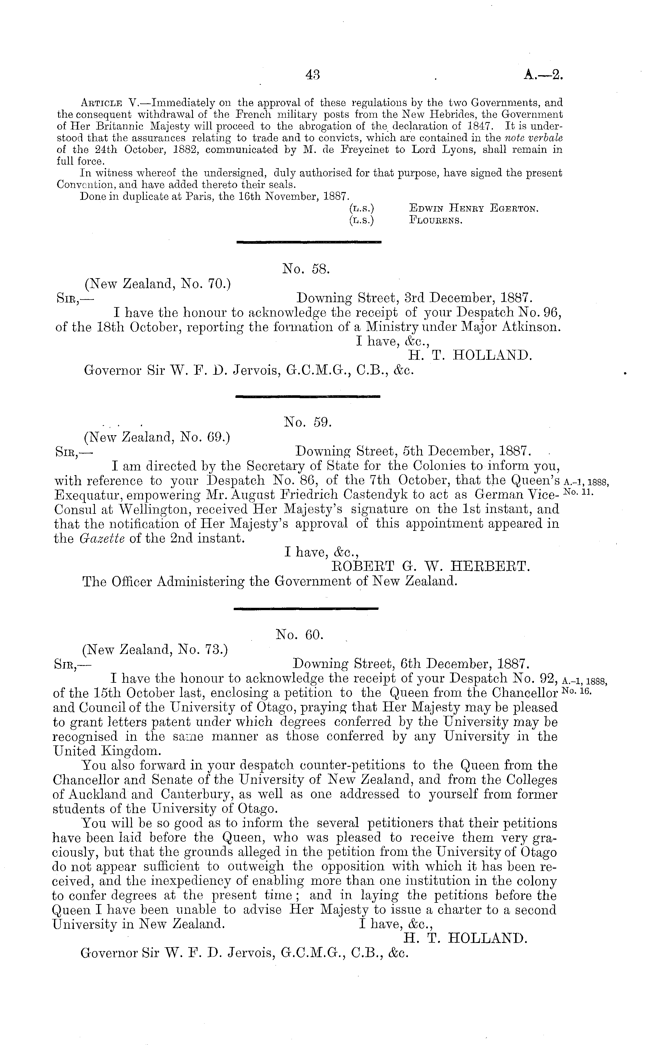 Article V.—lmmediately on the approval of these regulations by the two Governments, and the consequent withdrawal of the French military posts from the New Hebrides, the Government of Her Britannic Majesty will proceed to the abrogation of the declaration of 1847. It is understood that the assurances relating to trade and to convicts, which are contained in the note verbale of the 24th October, 1882, communicated by M. de Freycinet to Lord Lyons, shall remain in full force. In witness whereof the undersigned, duly authorised for that purpose, have signed the present Convention, and have added thereto their seals. Done in duplicate at Paris, the 16th November, 1887. (1.5.) Edwin Heney Egebton. (1.5.) Floueens.