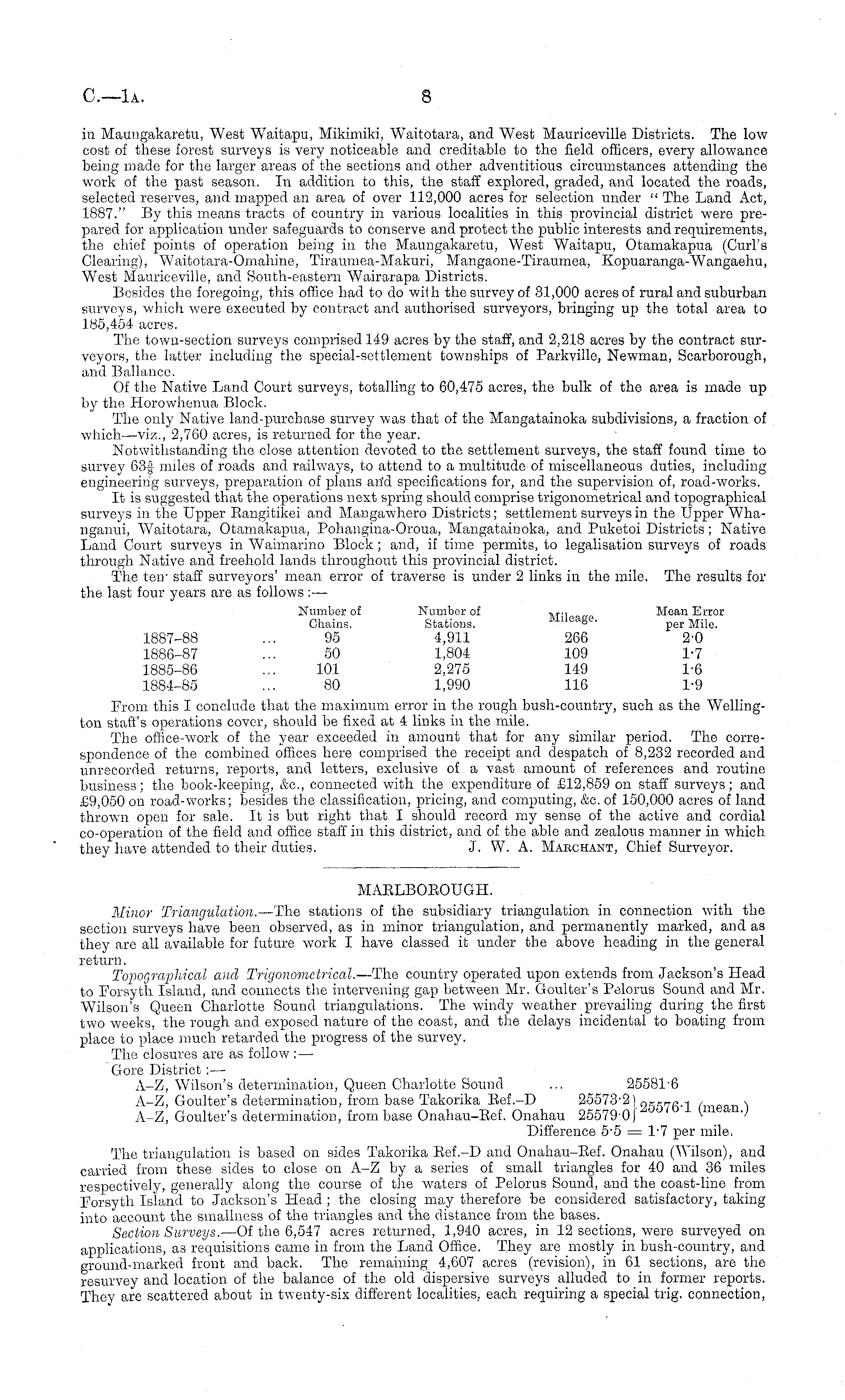 in Maungakaretu, West Waitapn, Mikimiki, Waitotara, and West Mauriceville Districts. The low cost of these forest surveys is very noticeable and creditable to the field officers, every allowance being made for the larger areas of the sections and other adventitious circumstances attending the work of the past season. In addition to this, the staff explored, graded, and located the roads, selected reserves, and mapped an area of over 112,000 acres for selection under " The Land Act, 1887." By this means tracts of country in various localities in this provincial district were prepared for application under safeguards to conserve and protect the public interests and requirements, the chief points of operation being in the Maungakaretu, West Waitapu, Otamakapua (Curl's Clearing), Waitotara-Omahine, Tiraumea-Makuri, Mangaone-Tiraumea, Kopuaranga-Wangaehu, West Mauriceville, and South-eastern Wairarapa Districts. Besides the foregoing, this office had to do with the survey of 31,000 acres of rural and suburban surveys, which were executed by contract and authorised surveyors, bringing up the total area to 185,454 acres. The town-section surveys comprised 149 acres by the staff, and 2,218 acres by the contract surveyors, the latter including the special-settlement townships of Parkville, Newman, Scarborough, and Ballanco. Of the Native Land Court surveys, totalling to 60,475 acres, the bulk of the area is made up by the Horowhenua Block. The only Native land-purchase survey was that of the Mangatainoka subdivisions, a fraction of which —viz., 2,760 acres, is returned for the year. Notwithstanding the close attention devoted to the settlement surveys, the staff found time to survey 63f miles of roads and railways, to attend to a multitude of miscellaneous duties, including engineering surveys, preparation of plans arid specifications for, and the supervision of, road-works. It is suggested that the operations next spring should comprise trigonometrical and topographical surveys in the Upper Bangitikei and Mangawhero Districts; settlement surveys in the Upper Whanganui, Waitotara, Otamakapua, Pohangina-Oroua, Mangatainoka, and Puketoi Districts; Native Land Court surveys in Waimarino Block; and, if time permits, to legalisation surveys of roads through Native and freehold lands throughout this provincial district. The ten , staff surveyors' mean error of traverse is under 2 links in the mile. The results for the last four years are as follows: — Number of Number of , r . Mean Error Chains. Stations. Mileage. per Mile. 1887-88 ... 95 4,911 266 2-0 1886-87 ... 50 1,804 109 1-7 1885-86 ... 101 2,275 149 1-6 1884-85 ... 80 1,990 116 1-9 From this I conclude that the maximum error in the rough bush-country, such as the Wellington staff's operations cover, should be fixed at 4 links in the mile. The office-work of the year exceeded in amount that for any similar period. The correspondence of the combined offices here comprised the receipt and despatch of 8,232 recorded and unrecorded returns, reports, and letters, exclusive of a vast amount of references and routine business; the book-keeping, &c, connected with the expenditure of £12,859 on staff surveys; and £9,050 on road-works; besides the classification, pricing, and computing, &c. of 150,000 acres of land thrown open for sale. It is but right that I should record my sense of the active and cordial co-operation of the field and office staff in this district, and of the able and zealous manner in which they have attended to their duties. J. W. A. Marchant, Chief Surveyor.