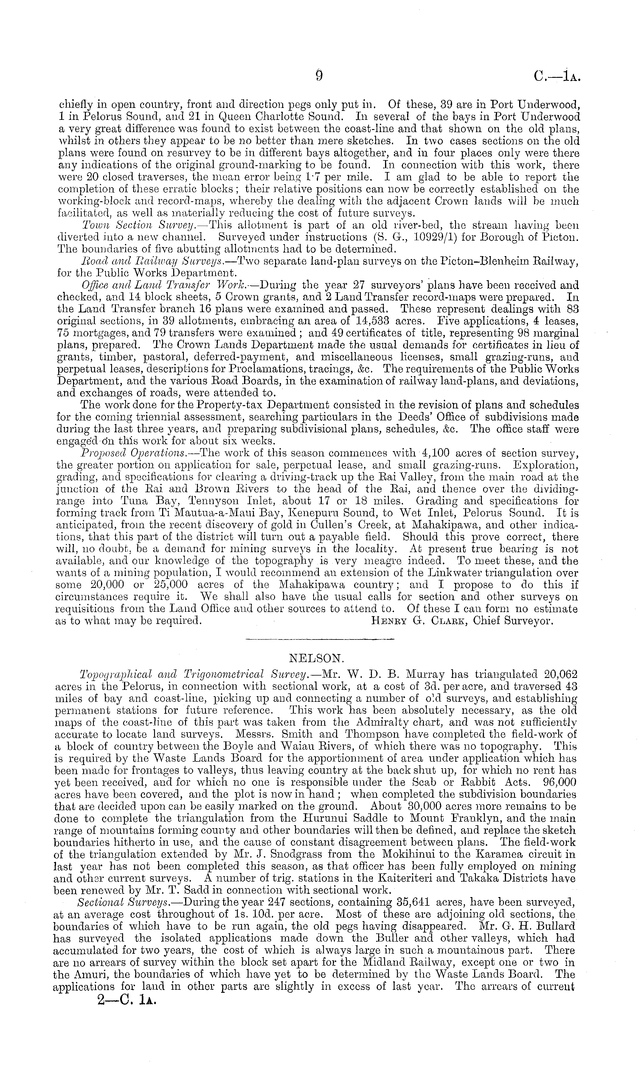 chiefly in open country, front and direction pegs only put in. Of these, 39 are in Port Underwood, lin Pelorus Sound, and 21 in Queen Charlotte Sound. In several of the bays in Port Underwood a very great difference was found to exist between the coast-line and that shown on the old plans, whilst in others they appear to be no better than mere sketches. In two cases sections on the old plans were found on resurvey to be in different bays altogether, and in four places only were there any indications of the original ground-marking to be found. In connection with this work, there were 20 closed traverses, the mean error being 1-7 per mile. I am glad to be able to report the completion of these erratic blocks ; their relative positions can now be correctly established on the working-block and record-maps, whereby the dealing with the adjacent Crown lands will be much facilitated, as well as materially reducing the cost of future surveys. Town Section Survey. —This allotment is part of an old river-bed, the stream having been diverted into a new channel. Surveyed under instructions (S. G., 10929/1) for Borough of Picton. The boundaries of five abutting allotments had to be determined. lioacl and Bail/way Surveys. —Two separate land-plan surveys on the Picton-Blenheini Railway, for the Public Works Department. Office and Land Transfer Work. —During the year 27 surveyors' plans have been received and checked, and 14 block sheets, 5 Crown grants, and 2 Land Transfer record-maps were prepared. In the Land Transfer branch 16 plans were examined and passed. Those represent dealings with 83 original sections, in 39 allotments, embracing an area of 14,533 acres. Five applications, 4 leases, 75 mortgages, and 79 transfers were examined ; and 49 certificates of title, representing 98 marginal plans, prepared. The Crown Lands Department made the usual demands for certificates in lieu of grants, timber, pastoral, deferred-payment, and miscellaneous licenses, small grazing-runs, and perpetual leases, descriptions for Proclamations, tracings, &c. The requirements of the Public Works Department, and the various Eoad Boards, in the examination of railway land-plans, and deviations, and exchanges of roads, were attended to. The work done for the Property-tax Department consisted in the revision of plans and schedules for the corning triennial assessment, searching particulars in the Deeds' Office of subdivisions made during the last three years, and preparing subdivisional plans, schedules, &c. The office staff were engaged dn this work for about six weeks. Proposed Operations. —The work of this season commences with 4,100 acres of section survey, the greater portion on application for sale, perpetual lease, and small grazing-runs. Exploration, grading, and specifications for clearing a driving-track up the Eai Valley, from the main road at the junction of the Eai and Brown Eivers to the head of the Eai, and theuco over the dividingrange into Tuna Bay, Tennyson Inlet, about 17 or 18 miles. Grading and specifications for forming track from Ti Mautua-a-Maui Bay, Kenepuru Sound, to Wet Inlet, Pelorus Sound. It is anticipated, from the recent discovery of gold in Cullen's Creek, at Mahakipawa, and other indications, that this part of the district will turn out a payable field. Should this prove correct, there will, no doubt, be a demand for mining surveys in the locality. At present true bearing is not available, and our knowledge of the topography is very meagre indeed. To meet these, and the wants of a mining population, I would recommend an extension of the Linkwater triai:gulation over some 20,000 or 25,000 acres of the Mahakipawa country; and I propose to do this if circumstances require it. We shall also have the usual calls for section and other surveys on requisitions from the Land Office and other sources to attend to. Of these I can form no estimate as to what may be required. Plenby G. Clark, Chief Surveyor.