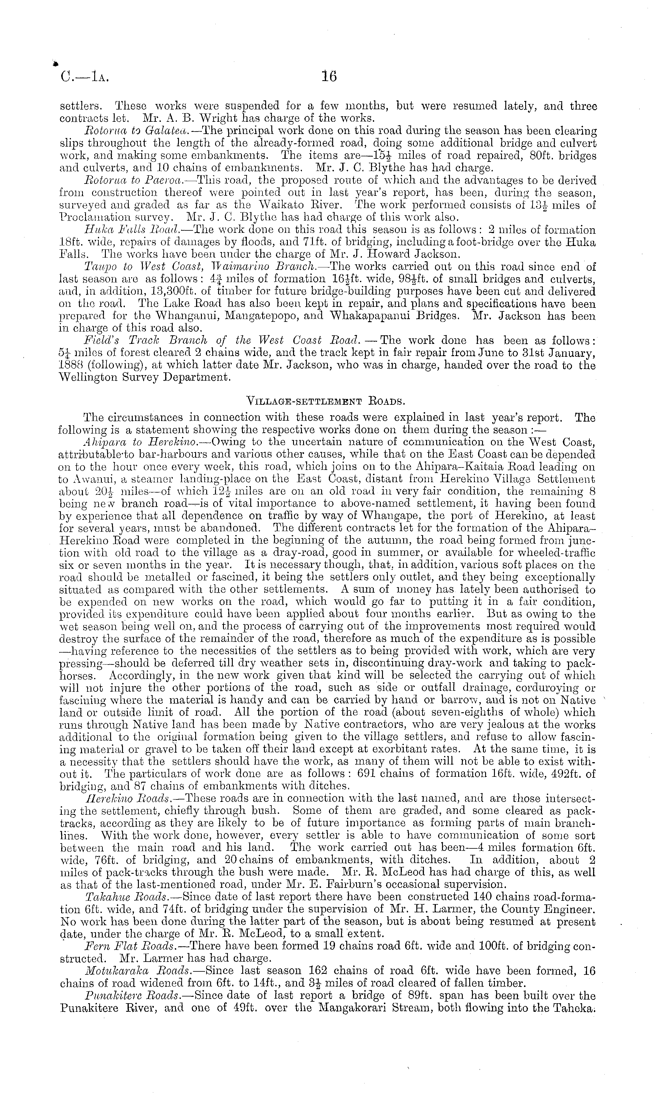 settlers. These works were suspended for a few mouths, but were resumed lately, and three contracts let. Mr. A. B. Wright has charge of the works. Botorua to Galatea. —The principal work done on this road during the season has been clearing slips throughout the length of the already-formed road, doing some additional bridge and culvert work, and making some embankments. The items are—l's-J miles of road repaired, 80ft. bridges and culverts, and 10 chains of embankments. Mr. J. C. Blythe has had charge. Botorua to Paeroa. —This road, the proposed route of which and the advantages to be derived from construction thereof were pointed out in last year's report, has been, during the season, surveyed and graded as far as the Waikato Eiver. The work performed consists of 13-J- miles of Proclamation survey. Mr. J. G. Blythe has had charge of this work also. Huka Falls Road. —The work done on this road this season is as follows : 2 miles of formation 18ft. wide, repairs of damages by floods, and 71ft. of bridging, including a foot-bridge over the Huka Falls. The works have been under the charge of Mr. J. Howard Jackson. Taupo to West Coast, Wai/marino Branch. —The works carried out on this road since end of last season are as follows : 4f miles of formation 16-Jffc. wide, 98-Jft. of small bridges and culverts, and, in addition, 13,300 ft. of timber for future bridge-building purposes have been cut and delivered on the road. The Lake Road has also been kept in repair, and plans and specifications have been prepared for the Whanganui, Maugatepopo, and Whakapapanui Bridges. Mr. Jackson has been in charge of this road also. Field's Track Branch of the West Coast Road. —The work done has been as follows: 5f miles of forest cleared 2 chains wide, and the track kept in fair repair from June to 31st January, 1888 (following), at which latter date Mr. Jackson, who was in charge, handed over the road to the Wellington Survey Department. Village-settlement Eoads. The circumstances in connection with these roads were explained in last year's report. The following is a statement showing the respective works done on them during the season :— Ahipara to Herekino. —Owing to the uncertain nature of communication on the West Coast, attributable'to bar-harbours and various other causes, while that on the Bast Coast can be depended on to the hour once every week, this road, which joins on to the Abipara-Kaitaia Road leading on to Awanui, a steamer landing-place on the East Coast, distant from Herekino Village Settlement about 20tj miles —of which 12-J miles are on an old road in very fair condition, the remaining 8 being new branch road —is of vital importance to above-named settlement, it having been found by experience that all dependence on traffic by way of Whangape, the port of Herekino, at least for several years, must be abandoned. The different contracts let for the formation of the Ahipara— Herekino Eoad were completed in the beginning of the autumn, the road being formed from junction with old road to the village as a dray-road, good in summer, or available for wheeled-traffic six or seven months in the year. It is necessary though, that, in addition, various soft places on the road should be metalled or fascined, it being the settlers only outlet, and they being exceptionally situated as compared with the other settlements. A sum of money has lately been authorised to be expended on new works on the road, which would go far to putting it in a fair condition, provided its expenditure could have been applied about four months earlier. But as owing to the wet season being well on, and the process of carrying out of the improvements most required would destroy the surface of the remainder of the road, therefore as much of the expenditure as is possible —having reference to the necessities of the settlers as to being provided with work, which are very pressing—should be deferred till dry weather sets in, discontinuing dray-work and taking to packhorses. Accordingly, in the new work given that kind will be selected the carrying out of which will not injure the other portions of the road, such as side or outfall drainage, corduroying or fascining where the material is handy and can be carried by hand or barrow, and is not on Native land or outside limit of road. All the portion of the road (about seven-eighths of whole) which runs through Native land has been made by Native contractors, who are very jealous at the works additional to the original formation being given to the village settlers, and refuse to allow fascining material or gravel to be taken off their land except at exorbitant rates. At the same time, it is a necessity that the settlers should have the work, as many of them will not be able to exist without it. The particulars of work done are as follows : 691 chains of formation 16ft. wide, 492 ft. of bridging, and 87 chains of embankments with ditches. Herekino Boads. —These roads are in connection with the last named, and are those intersecting the settlement, chiefly through bush. Some of them are graded, and some cleared as packtracks, according as they are likely to be of future importance as forming parts of main branchlines. With the work done, however, every settler is able to have communication of some sort between the main road and his land. The work carried out has been—4 miles formation 6ft. wide, 76ft. of bridging, and 20 chains of embankments, with ditches. In addition, about 2 miles of pack-tracks through the bush were made. Mr. E. McLeod has had charge of this, as well as that of the last-mentioned road, under Mr. E. Fairburn's occasional supervision. Takahue Boads. —Since date of last report there have been constructed 140 chains road-forma-tion 6ft. wide, and 74ft. of bridging under the supervision of Mr. H. Larmer, the County Engineer. No work has been done during the latter part of the season, but is about being resumed at present date, under the ch
