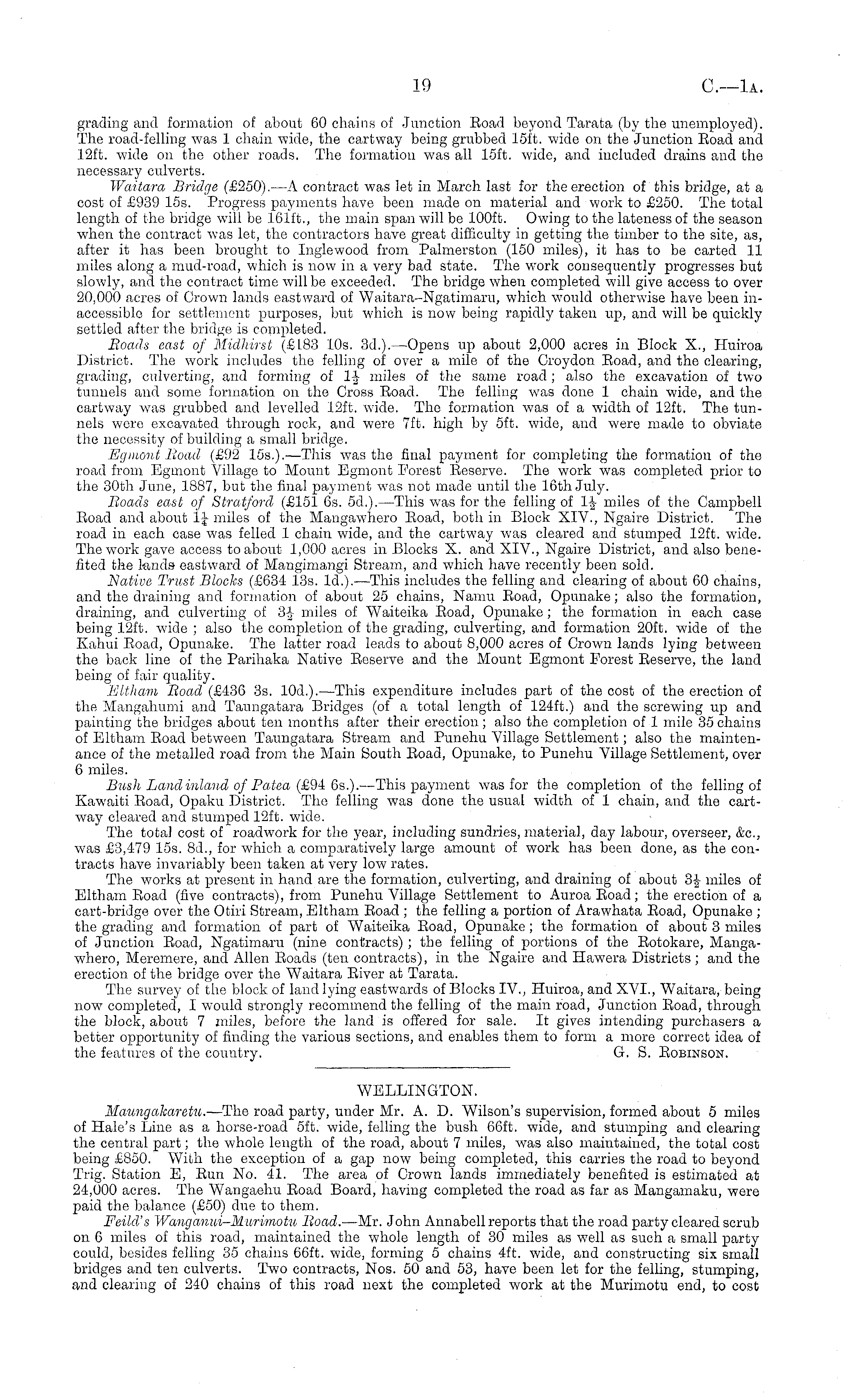 grading and formation of about 60 chains of Junction Boad beyond Tarata (by the unemployed). The road-felling was 1 chain wide, the cartway being grabbed 15ft. wide on the Junction Boad and 12ft. wide on the other roads. The formation was all 15ft. wide, and included drains and the necessary culverts. Waitara Bridge (£250). —A contract was let in March last for the erection of this bridge, at a cost of £939 15s. Progress payments have been made on material and work to £250. The total length of the bridge will be 161 ft., the main span will be 100 ft. Owing to the lateness of the season when the contract was let, the contractors have great difficulty in getting the timber to the site, as, after it has been brought to Inglewood from Palmerston (150 miles), it has to be carted 11 miles along a mud-road, which is now in a very bad state. The work consequently progresses but slowly, and the contract time will be exceeded. The bridge when completed will give access to over 20,000 acres of Crown lands eastward of Waitara-Ngatimaru, which would otherwise have been inaccessible for settlement purposes, but which is now being rapidly taken up, and will be quickly settled after the bridge is completed. Roads east of Midhirst (£1.83 10s. 3d.). —Opens up about 2,000 acres in Block X., Huiroa District. The work includes the felling of over a mile of the Croydon Eoad, and the clearing, grading, culverting, and forming of If miles of the same road; also the excavation of two tunnels and some formation on the Cross Eoad. r The felling was done 1 chain wide, and the cartway was grubbed and levelled 12ft. wide. The formation was of a width of 12ft. The tunnels were excavated through rock, and were 7ft. high by sft. wide, and were made to obviate the necessity of building a small bridge. Egviont Road (£92 155.).' —This was the final payment for completing the formation of the road from Egmont Village to Mount Egmont Forest Eeserve. The work was completed prior to the 30th June, 1887, but the final payment was not made until the 16th July. Roads east of Stratford (£l5l 6s. 5d.). —This was for the felling of 1-J miles of the Campbell Eoad and about ly miles of the Mangawhero Eoad, both in Block XIV., Ngairo District. The road in each case was felled 1 chain wide, and the cartway was cleared and stumped 12ft. wide. The work gave access to about 1,000 acres in Blocks X. and XIV., Ngaire District, and also benefited the kinds- eastward of Mangimangi Stream, and which have recently been sold. Native Trust Blocks (£634 13s. Id.). —This includes the felling and clearing of about 60 chains, and the draining and formation of about 25 chains, Nauru Eoad, Opunake; also the formation, draining, and culverting of 3-J- miles of Waiteika Eoad, Opunake ; the formation in each case being 12ft. wide ; also the completion of the grading, culverting, and formation 20ft. wide of the Kahui Eoad, Opunake. The latter road leads to about 8,000 acres of Crown lands lying between the back line of the Parihaka Native Eeserve and the Mount Egmont Forest Eeserve, the land being of fair quality. Eltham Road (£436 3s. 10d.). —This expenditure includes part of the cost of the erection of the Mangahumi and. Taungatara Bridges (of a total length of 124 ft.) and the screwing up and painting the bridges about ten months after their erection; also the completion of 1 mile 35 chains of Eltham Eoad between Taungatara Stream and Punehu Village Settlement; also the maintenance of the metalled road from the Main South Eoad, Opunake, to Punehu Village Settlement, over 6 miles. Bush Land inland of Patea (£94 65.). —This payment was for the completion of the felling of Kawaiti Eoad, Opaku District. The felling was done the usual width of 1 chain, and the cartway cleared and stumped 12ft. wide. The total cost of roadwork for the year, including sundries, material, day labour, overseer, &c, was £3,479 15s. Bd., for which a comparatively large amount of work has been done, as the contracts have invariably been taken at very low rates. The works at present in hand are the formation, culverting, and draining of about 3-J miles of Eltham Eoad (five contracts), from Punehu Village Settlement to AuroaEoad; the erection of a cart-bridge over the Otiri Stream, Eltham Eoad ; the felling a portion of Arawhata Eoad, Opunake ; the grading and formation of part of Waiteika Eoad, Opunake; the formation of about 3 miles of Junction Eoad, Ngatimaru (nine contracts) ; the felling of portions of the Eotokare, Mangawhero, Meremere, and Allen Eoads (ten contracts), in the Ngaire and Hawera Districts ; and the erection of the bridge over the Waitara Eiver at Tarata. The survey of the block of land lying eastwards of Blocks IV., Huiroa, and XVI., Waitara, being now completed, I would strongly recommend the felling of the main road, Junction Eoad, through the block, about 7 miles, before the land is offered for sale. It gives intending purchasers a better opportunity of finding the various sections, and enables them to form a more correct idea of the features of the country. G. S. Eobinson.