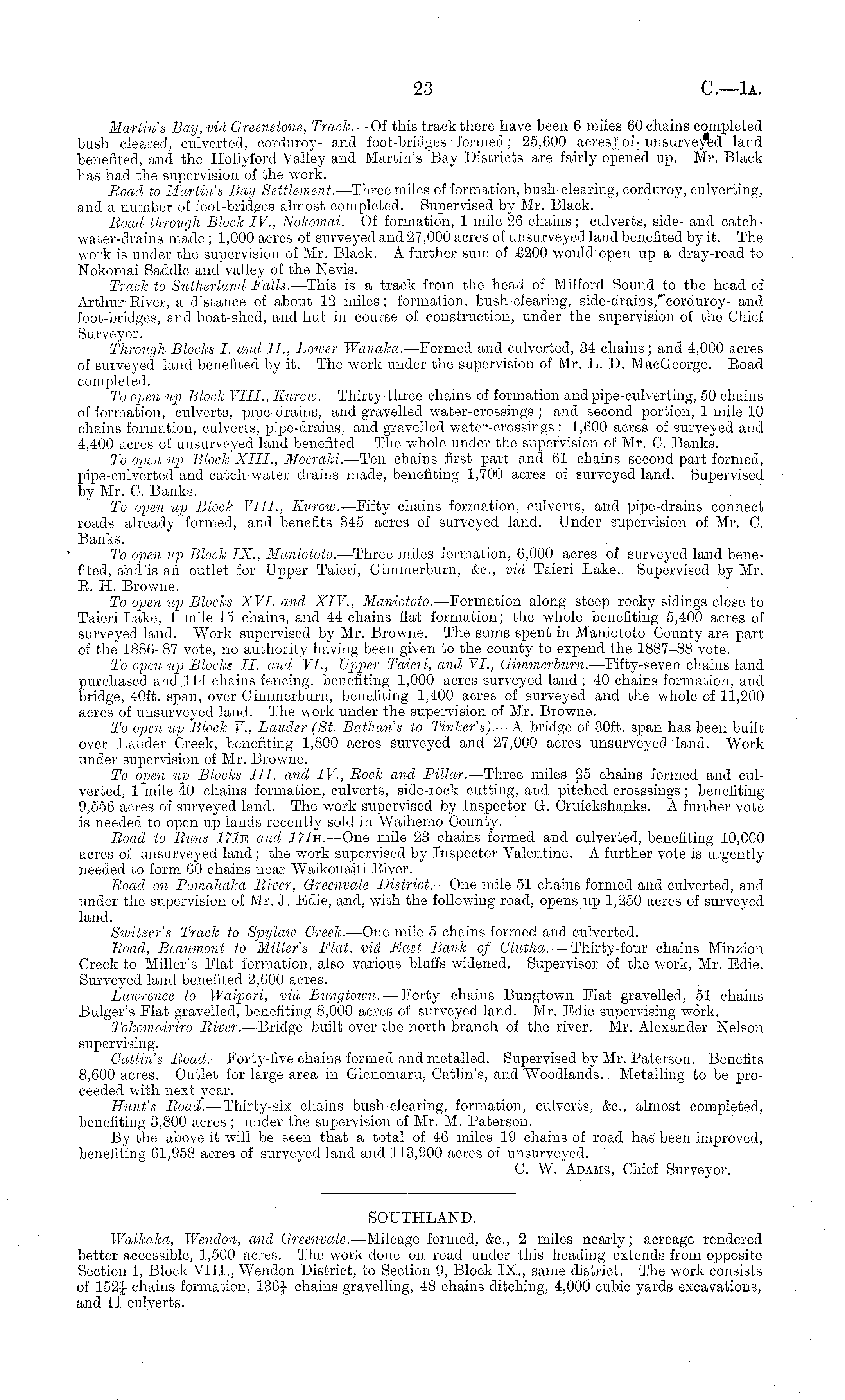 Martin's Bay, via Greenstone, Track. —Of this track there have been 6 miles 60 chains completed bush cleared, culverted, corduroy- and foot-bridges • formed ; 25,600 acres] of- ! unsurveyed land benefited, and the Hollyford Valley and Martin's Bay Districts are fairly opened up. Mr. Black has had the supervision of the work. Boad to Martin's Bay Settlement, —Three miles of formation, bush' clearing, corduroy, culverting, and a number of foot-bridges almost completed. Supervised by Mr. Black. Boad through Block IV., Nokomai. —Of formation, 1 mile 26 chains; culverts, side- and catch-water-drains made ; 1,000 acres of surveyed and 27,000 acres of unsurveyed land benefited by it. The work is under the supervision of Mr. Black. A further sum of £200 would open up a dray-road to Nokomai Saddle and valley of the Nevis. Track to Sutherland Falls. —This is a track from the head of Milford Sound to the head of Arthur Biver, a distance of about 12 miles; formation, bush-clearing, side-drains,''corduroy- and foot-bridges, and boat-shed, and hut in course of construction, under the supervision of the Chief Surveyor. Through Blocks I. and 11,, Lower Wanaka. — Formed and culverted, 34 chains; and 4,000 acres of surveyed land benefited by it. The work under the supervision of Mr. L. D. Mac George. Boad completed. To open up Block VIII., Rurow. —Thirty-three chains of formation and pipe-culverting, 50 chains of formation, culverts, pipe-drains, and gravelled water-crossings ; and second portion, 1 mile 10 chains formation, culverts, pipe-drains, and gravelled water-crossings : 1,600 acres of surveyed and 4,400 acres of unsurveyed land benefited. The whole under the supervision of Mr. C. Banks. To open up Block XIII., Mocraki. —Ten chains first part and 61 chains second part formed, pipe-culverted and catch-water drains made, benefiting 1,700 acres of surveyed land. Supervised by Mr. C. Banks. To open up Block VIII., Kuroiv. —Fifty chains formation, culverts, and pipe-drains connect roads already formed, and benefits 345 acres of surveyed land. Under supervision of Mr. C. Banks. To open up Block IX., Maniototo. —Three miles formation, 6,000 acres of surveyed land benefited, a'nd'is ari outlet for Upper Taieri, Gimmerburn, &c, via Taieri Lake. Supervised by Mr. B. H. Browne. To open up Blocks XVI. and XIV., Maniototo. —Formation along steep rocky sidings close to Taieri Lake, 1 mile 15 chains, and 44 chains flat formation; the whole benefiting 5,400 acres of surveyed land. Work supervised by Mr. Browne. The sums spent in Maniototo County are part of the 1886-87 vote, no authority having been given to the county to expend the 1887-88 vote. To open up Blocks 11. and VI., Upper Taieri, and VI., Gimmerburn. —Fifty-seven chains land purchased and 114 chains fencing, benefiting 1,000 acres surveyed land ; 40 chains formation, and bridge, 40ft. span, over Gimmerburn, benefiting 1,400 acres of surveyed and the whole of 11,200 acres of unsurveyed land. The work under the supervision of Mr. Browne. To open up Block V., Lauder (St. Bathan's to Tinker's). —A bridge of 30ft. span has been built over Lauder Creek, benefiting 1,800 acres surveyed and 27,000 acres unsurveyed land. Work under supervision of Mr. Browne. To open up Blocks 111. and TV., Bock and Pillar. —Three miles 25 chains formed and culverted, 1 mile 40 chains formation, culverts, side-rock cutting, and pitched crosssings ; benefiting 9,556 acres of surveyed land. The work supervised by Inspector G. Cruickshanks. A further vote is needed to open up lands recently sold in Waihemo County. Boad to Buns 171s and 171h. —One mile 23 chains formed and culverted, benefiting 10,000 acres of unsurveyed land ; the work supervised by Inspector Valentine. A further vote is urgently needed to form 60 chains near Waikouaiti Biver. Boad on Pomahaka Biver, Greenvale District. —One mile 51 chains formed and culverted, and under the supervision of Mr. J. Edie, and, with the following road, opens up 1,250 acres of surveyed land. Sioitzer's Track to Spylaw Creek. —One mile 5 chains formed and culverted. Boad, Beaumont to Miller's Flat, via East Bank of Glutha. — Thirty-four chains Minzion Creek to Miller's Flat formation, also various bluffs widened. Supervisor of the work, Mr. Edie. Surveyed land benefited 2,600 acres. Laivrencc to Waipori, via Bungtoivn. — Forty chains Bungtown Flat gravelled, 51 chains Bulger's Flat gravelled, benefiting 8,000 acres of surveyed land. Mr. Edie supervising work. Tokomairiro Biver. —Bridge built over the north branch of the river. Mr. Alexander Nelson supervising. Gatlin's Boad. —Forty-five chains formed and metalled. Supervised by Mr. Paterson. Benefits 8,600 acres. Outlet for large area in Glenomaru, Catlin's, and Woodlands. Metalling to be proceeded with next year. Hunt's Boad. — Thirty-six chains bush-clearing, formation, culverts, &c, almost completed, benefiting 3,800 acres ; under the supervision of Mr. M. Paterson. By the above it will be seen that a total of 46 miles 19 chains of road has been improved, benefiting 61,958 acres of surveyed land and 113,900 acres of unsurveyed. C. W. Adams, Chief Surveyor.