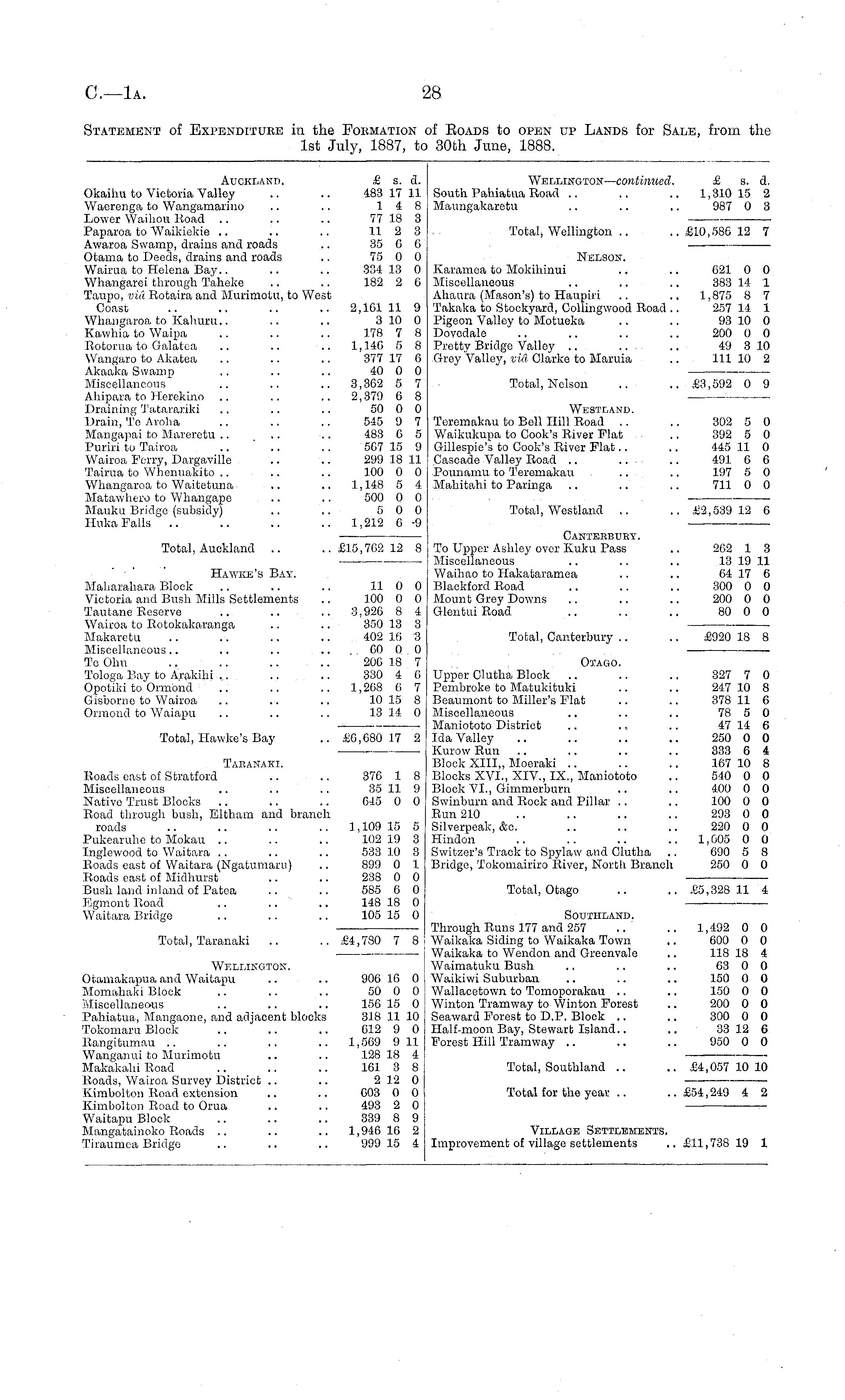 Auckland. £ s. d. Okaihu to Victoria Valley .. .. 483 17 11 Waerenga to Wangamarino .. .. 14 8 Lower Waihou Road .. .. .. 77 18 3 Paparoa to Waikickie .. .. .. 11 2 3 Awaroa Swamp, drains and roads .. 35 6 6 Otama to Deeds, drains and roads .. 75 0 0 Wairna to Helena Bay.. .. .. 334 13 0 Whangaroi through Taheke .. .. 182 2 6 Taupo, via Rotaira and Murimotu, to West Coasc .. .. .. .. 2,101 11 9 Whangaroa to Kahuru.. .. .. 3 10 0 Kawhia to Waipa .. .. .. 178 7 8 Rotorua to Galatea .. .. .. 1,146 5 8 Wangaro to Akatea .. .. .. 377 17 0 Akaaka Swamp .. .. .. 40 0 0 Miscellaneous" .. .. .. 3,362 5 7 Ahipara to Herekino .. .. .. 2,379 6 8 Draining Tatarariki .. .. .. 50 0 0 Drain, To Aroha .. .. .. 545 9 7 Mangapai to Mareretu .. .. .. 483 0 5 Puriri to Tairoa .. .. .. 567 15 9 Wairoa Ferry, Dargaville .. .. 299 18 11 Tairua to Whenuakito .. .. .. 100 0 0 Whangaroa to Waitetuna .. .. 1,148 5 4 Matawhero to Whangapo .. .. 500 0 0 Mauku Bridge (subsidy) .. .. 5 0 0 Huka Falls .. .. .. .. 1,212 6 -9 Wellington— continued. £ s. d. South Pahiatua Road .. .. .. 1,310 15 2 Maungakaretu .. .. .. 987 0 3 Total, Wellington .. .. £10,586 12 7 Nelson. Karamoa to Mokihinui .. .. 621 0 0 Miscellaneous .. .. .. 383 14 1 Ahaura (Mason's) to Haupiri .. .. 1,875 8 7 Takaka to Stoclcyard, Collingwood Road .. 257 14 1 Pigeon Valley to Motueka .. .. 93 10 0 Dovodale .. .. .. .. 200 0 0 Pretty Bridge Vallev .. .. .. 49 3 10 Grey Valley, via Clarke to Maruia .. Ill 10 2 Total, Nelson .. .. £3,592 0 9 Westland. Tcrcmakaii to Bell Hill Road .. .. 302 5 0 Waikukupa to Cook's River Flat .. 392 5 0 Gillespie's to Cook's River Flat.. .. 445 11 0 Cascade Valley Road .. .. .. 491 6 6 Pounamu to Teremakau .. .. 197 5 0 Mahitahi to Paringa .. .. .. 711 0 0 Total, Westland .. .. £2,539 12 6 Total, Auckland .. ..£15,702 12 8 Hawke's Bay. Cantebbuby. To Upper Ashley over Kuku Pass .. 262 1 3 Miscellaneous .. .. .. 13 19 11 Waihao to Hakataramea .. .. 64 17 6 Blackford Road .. .. .. 300 0 0 Mount Grey Downs .. .. .. 200 0 0 Glentui Road .. .. .. 80 0 0 Mabarahara Block .. .. .. 11 0 0 Victoria and Bush Mills Settlements .. 100 0 0 Tautane Reserve .. .. .. 3,926 8 4 Wairoa to Rotokakaranga .. .. 350 13 3 Makaretu .. .. .. .. 402 16 3 Miscellaneous.. .. .. ... 60 0 0 To Ohu .. .. .. .. 200 18 7 Tologa Bay to Arakihi .. .. .. 330 4 6 Opotiki to Ormond .. .. .. 1,268 6 7 Gisborne to Wairoa .. .. .. 10 .15 8 Ormond to Waiapu .. .. .. 13 14 0 Total, Canterbury .. .. £920 18 8 Otago. Total, Hawke's Bay .. £0,680 17 2 Taranaki. Roads cast of Stratford .. .. 376 1 8 Miscellaneous .. .. .. 35 11 9 Native Trust Blocks .. .. .. 015 0 0 Road through bush, Eltham and branch roads .. .. .. .. 1,109 15 5 Pukearuho to Mokau .. .. .. 102 19 3 Inglewood to Waitara .. .. .. 533 10 3 Roads east of Waitara (Ngatumaru) .. 899 0 1 Roads east of Midhurst .. .. 238 0 0 Bush land inland of Patea .. .. 585 6 0 Egmont Road .. .. .. 148 18 0 Waitara Bridge .. .. .. 105 15 0 Upper Clutha Block .. .. .. 327 7 0 Pembroke to Matukituki .. .. 247 10 8 Beaumont to Miller's Flat .. .. 378 11 6 Miscellaneous .. .. .. 78 5 0 Maniototo District .. .. .. 47 14 6 Ida Valley .. .. .. .. 250 0 0 Kurow Run .. .. .. .. 333 6 4 Block XIII,, Moeraki .. .. .. 167 10 8 Blocks XVI., XIV., IX., Maniototo .. 540 0 0 Block VI., Gimmerbum .. .. 400 0 0 Swinburn and Rock and Pillar .. .. 100 0 0 Run 210 .. .. .. .. 293 0 0 Silverpcak, <&c. .. .. .. 220 0 0 Hindon .. .. .. 1,005 0 0 Switzer's Track to Spylaw and Clutha .. 690 5 8 Bridge, Tokomairiro River, North Branch 250 0 0 Total, Otago .. .. £5,328 11 4 Total, Taranaki .. .. £4,780 7 8 Wellington. Otamakapua and Waitapu .. .. 906 16 0 Momahaki Block .. .. .. 50 0 0 Miscellaneous .. .. .. 156 15 0 Pahiatua, Mangaone, and adjacent blocks 318 11 10 Tokomaru Block .. .. .. 612 9 0 Rangitumau .. .. .. .. 1,569 9 11 Wanganui to Murimotu .. .. 128 18 4 MakakahiRoad .. .. .. 161 3 8 Roads, Wairoa Survey District .. .. 2 12 0 Kimbolton Road extension .. .. 603 0 0 Kimbolton Road to Orua .. .. 493 2 0 Waitapu Block .. .. .. 339 8 9 Mangatainoko Roads .. .. .. 1,946 16 2 Tiraumca Bridge .. .. .. 999 15 4 Southland. Through Runs 177 and 257 .. .. 1,492 0 0 Waikaka Siding to Waikaka Town .. 600 0 0 Waikaka to Wendon and Greenvale .. 118 18 4 Waimatuku Bush .. .. .. 63 0 0 Waikiwi Suburban .. .. .. 150 0 0 Wallacetown to Tomoporakau .. .. 150 0 0 Winton Tramway to Winton Forest .. 200 0 0 Seaward Forest to D.P. Block .. .. 300 0 0 Half-moon Bay, Stewart Island.. .. 33 12 6 Forest Hill Tramway .. .. .. 950 0 0 Total, Southland .. .. £4,057 10 10 Total for the year .. ..£54,249 4 2 Village Settlements. Improvement of village settlements .. £11,738 19 1 Im