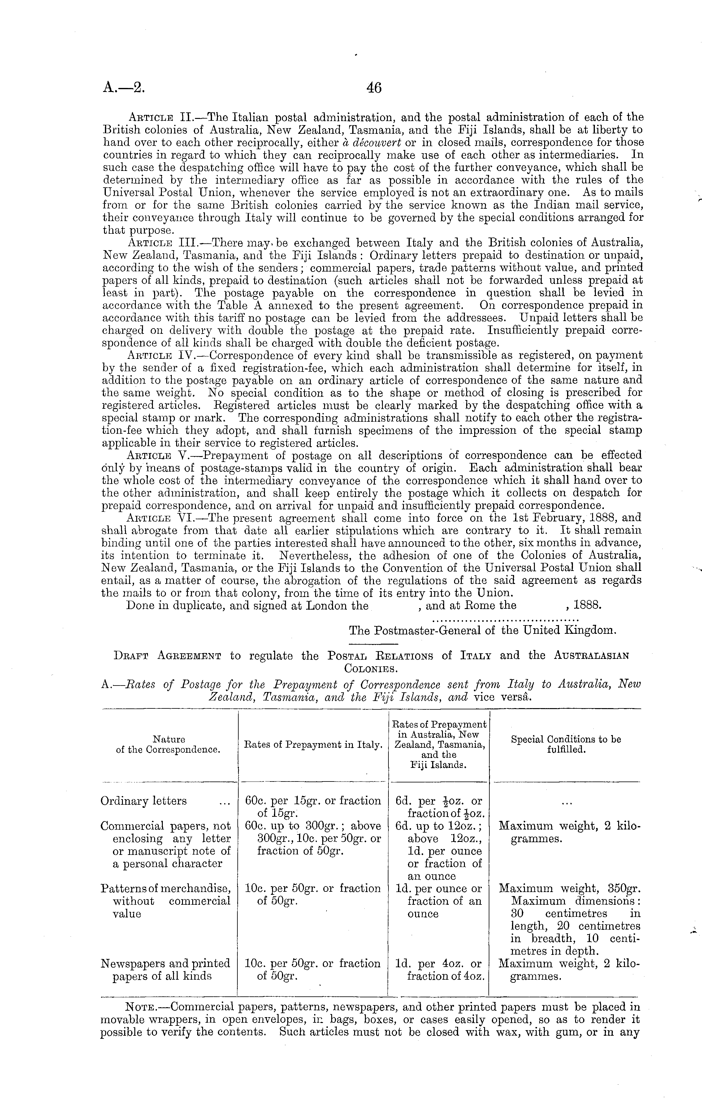 Aeticle ll.—The Italian postal administration, and the postal administration of each of the British colonies of Australia, New Zealand, Tasmania, and the Fiji Islands, shall be at liberty to hand over to each other reciprocally, either a decouvert or in closed mails, correspondence for those countries in regard to which they can reciprocally make use of each other as intermediaries. In such case the despatching office will have to pay the cost of the further conveyance, which shall be determined by the intermediary office as far as possible in accordance with the rules of the Universal Postal Union, whenever the service employed is not an extraordinary one. As to mails from or for the same British colonies carried by the service known as the Indian mail service, their conveyance through Italy will continue to be governed by the special conditions arranged for that purpose. Aeticle lll.—There may. be exchanged between Italy and the British colonies of Australia, New Zealand, Tasmania, and the Fiji Islands : Ordinary letters prepaid to destination or unpaid, according to the wish of the senders ; commercial papers, trade patterns without value, and printed papers of all kinds, prepaid to destination (such articles shall not be forwarded unless prepaid at least in part). The postage payable on the correspondence in question shall be levied in accordance with the Table A annexed to the present agreement. On correspondence prepaid in accordance with this tariff no postage can be levied from the addressees. Unpaid letters shall be charged on delivery with double the postage at the prepaid rate. Insufficiently prepaid correspondence of all kinds shall be charged with double the deficient postage. Aeticle IV.—Correspondence of every kind shall be transmissible as registered, on payment by the sender of a fixed registration-fee, which each administration shall determine for itself, in addition to the postage payable on an ordinary article of correspondence of the same nature and the same weight. No special condition as to the shape or method of closing is prescribed for registered articles. Registered articles must be clearly marked by the despatching office with a special stamp or mark. The corresponding administrations shall notify to each other the registra-tion-fee which they adopt, and shall furnish specimens of the impression of the special stamp applicable in their service to registered articles. Aeticle V. —Prepayment of postage on all descriptions of correspondence can be effected only by means of postage-stamps valid in the country of origin. Each administration shall bear the whole cost of the intermediary conveyance of the correspondence which it shall hand over to the other administration, and shall keep entirely the postage which it collects on despatch for prepaid correspondence, and on arrival for unpaid and insufficiently prepaid correspondence. Aeticle VI. —The present agreement shall come into force on the Ist February, 1888, and shall abrogate from that date all earlier stipulations which are contrary to it. It shall remain binding until one of the parties interested shall have announced to the other, six months in advance, its intention to terminate it. Nevertheless, the adhesion of one of the Colonies of Australia, New Zealand, Tasmania, or the Fiji Islands to the Convention of the Universal Postal Union shall entail, as a matter of course, the abrogation of the regulations of the said agreement as regards the mails to or from that colony, from the time of its entry into the Union. Done in duplicate, and signed at London the , and at Rome the , 1888. The Postmaster-General of the United Kingdom.
