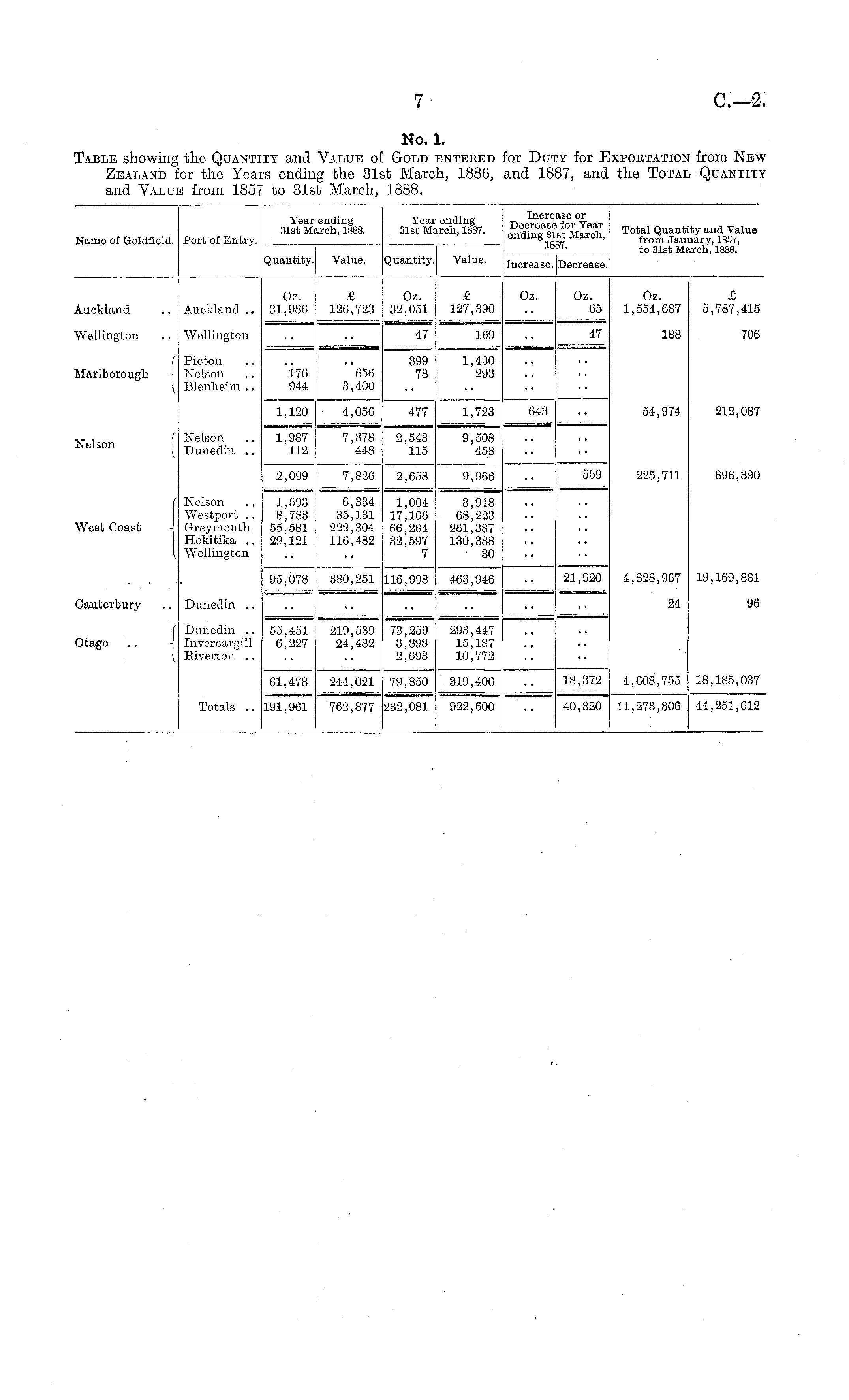 No. 1. Table showing the Quantity and Value of Gold entered for Duty for Exportation from New Zealand for the Years ending the 31st March, 1886, and 1887, and the Total Quantity and Value from 1857 to 31st March, 1888.