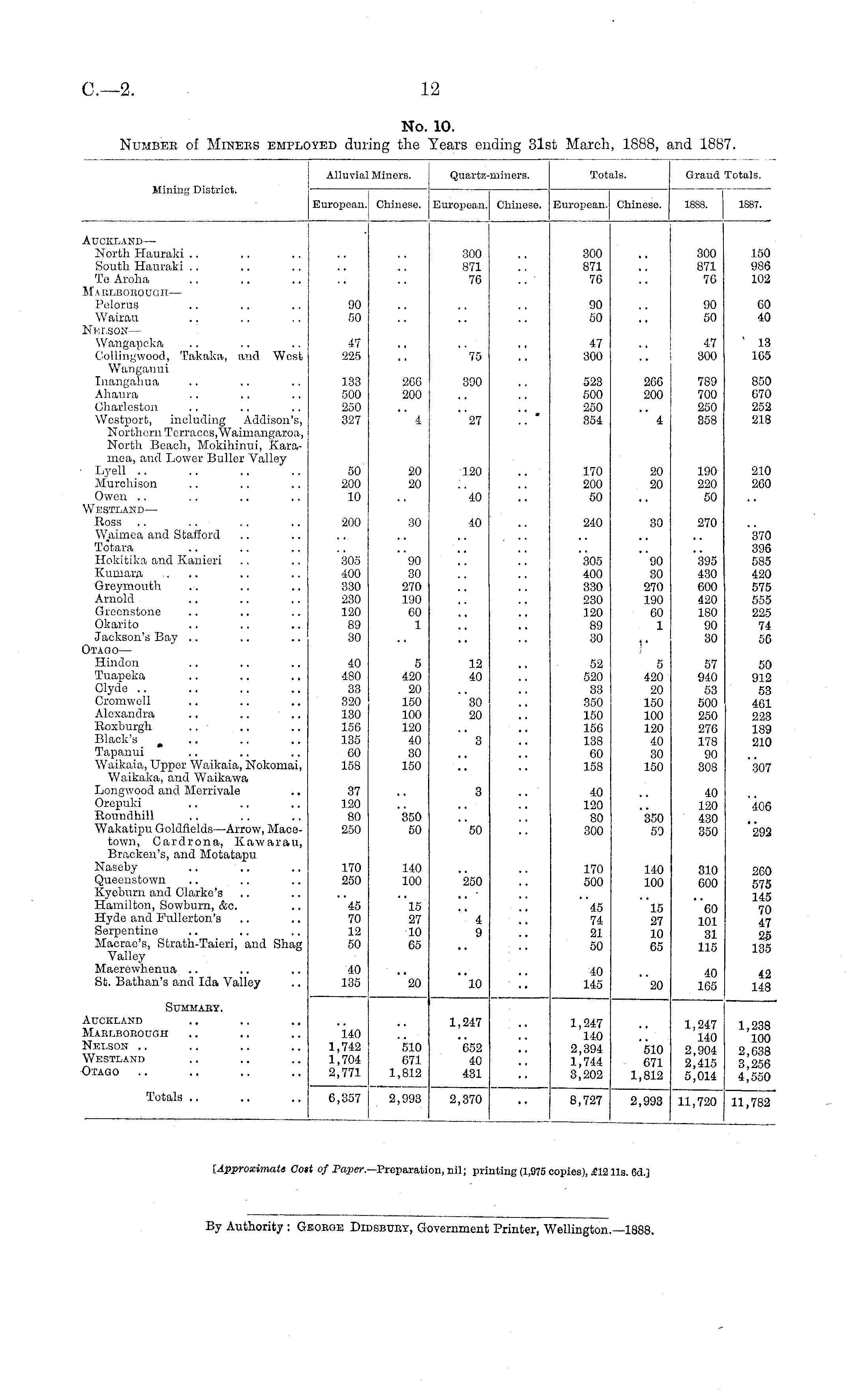 Alluvial Miners. Quartz-minors. Totals. Grand Totals. Mining District. European. Chinese. European. Chinese. European. Chinese. 1888. 1887. Auckland — North Hauraki South Hauraki To Aroha Marlbobouoh — Pclorus Wairau tTBLSOH — Wangapcka Collingwood, Takaka, and West Wanganui Inangahua Ahaura Charleston Westporfc, including Addison's, Northern Terraces,Waimangaroa, North Beach, Mokihinui, Karamea, and Lower Buller Valley Lyell .. Murchison Owen ., vVestland— Ross Waimea and Stafford Totara Hokitika and Kanieri Kurnara ... Greyrnouth Arnold Greenstone Okarito Jackson's Bay .. 3tago— Hindon Tuapeka Clyde .. Cromwell Alexandra Roxburgh .. • Black's Tapanui Waikaia, Upper Waikaia, Nokomai, Waikaka, and Waikawa Longwood and Merrivale Orepuki Roundhill Wakatipu Goldfields—Arrow, Macetown, Cardrona, ICawarau, Bracken's, and Motatapu Naseby Queenstown Kyeburn and Clarke's Hamilton, Sowburn, &c. Hyde and Pullerton's Serpentine Macrae's, Strath-Taieri, and Shag Valley Maerowhonua St. Bathan's and Ida Valley 90 50 47 225 133 500 250 327 50 200 10 200 305 400 330 230 120 89 30 266 200 4 20 20 30 90 30 270 190 60 1 300 871 76 75 390 27 120 "40 40 • 300 871 76 90 50 47 300 523 500 250 354 170 200 50 240 305 400 330 230 120 89 30 266 200 4 20 20 30 90 30 270 190 60 1 300 871 70 90 50 47 300 789 700 250 358 190 220 50 270 395 430 600 420 180 90 30 150 986 102 00 40 ' 13 165 850 670 252 218 210 260 370 396 585 420 575 555 225 74 50 l • 40 480 33 320 130 156 135 00 158 5 420 20 150 100 120 40 30 150 12 40 "'30 20 52 520 33 350 150 156 138 60 158 5 420 20 150 100 120 40 30 150 57 940 53 500 250 276 178 90 308 50 912 53 461 223 189 210 3 *307 37 120 80 250 350 50 3 40 120 80 300 '350 50 40 120 430 350 '400 "so *292 170 250 140 100 250 170 500 140 100 310 600 2G0 575 145 70 47 25 135 45 70 12 50 15 27 10 65 4 9 45 74 21 50 15 27 10 65 60 101 31 115 40 135 20 "lO 40 145 "20 40 165 42 148 Summary, (vuckland Maelbobough Kelson .. vYestland DTAGO 140 1,742 1,704 2,771 510 671 1,812 1,247 652 40 431 1,247 140 2,394 1,744 3,202 510 671 1,812 1,247 140 2,904 2,415 5,014 1,238 100 2,638 3,256 4,550 Totals 6,357 2,993 2,370 8,727 2,993 11,720 11,782