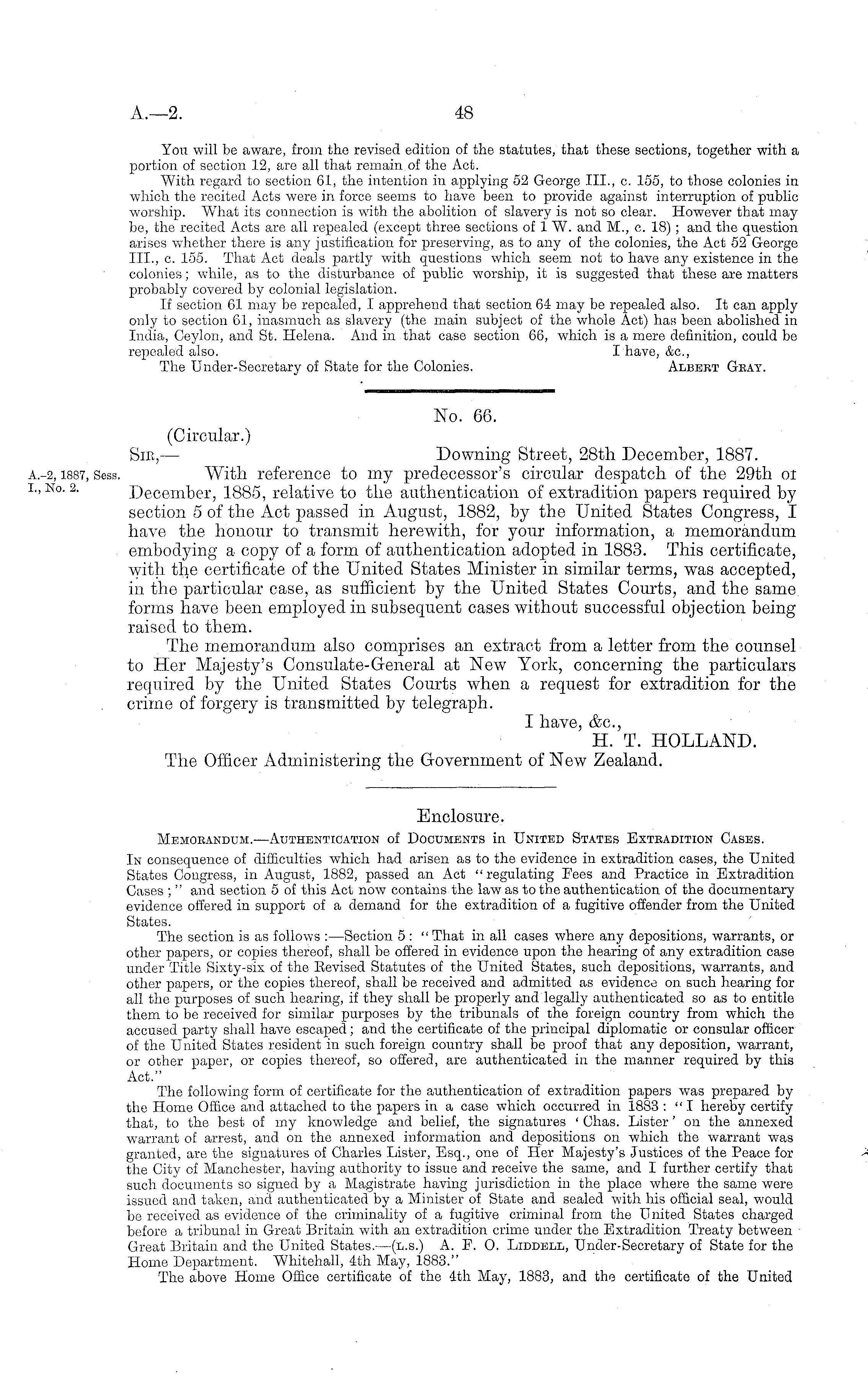 No. 66. (Circular.) Sic, — Downing Street, 28th December, 1887. With reference to my predecessor's circular despatch of the 29th oi December, 1885, relative to the authentication of extradition papers required by section 5 of the Act passed in August, 1882, by the United States Congress, I have the honour to transmit herewith, for your information, a memorandum embodying a copy of a form of authentication adopted in 1883. This certificate, with the certificate of the United States Minister in similar terms, was accepted, in the particular case, as sufficient by the United States Courts, and the same forms have been employed in subsequent cases without successful objection being raised to them. The memorandum also comprises an extract from a letter from the counsel to Her Majesty's Consulate-General at New York, concerning the particulars required by the United States Courts when a request for extradition for the crime of forgery is transmitted by telegraph. I have, &c, H. T. HOLLAND. The Officer Administering the Government of New Zealand.