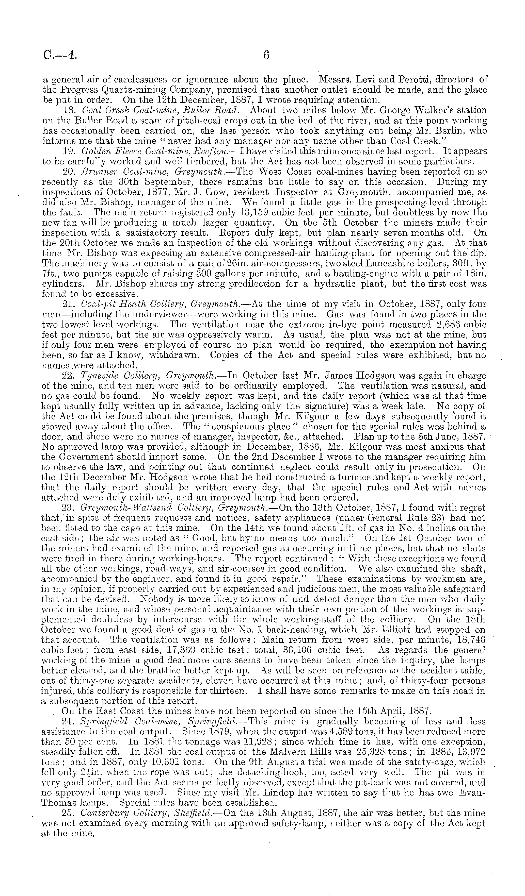 a general air of carelessness or ignorance about the place. Messrs. Levi and Perotti, directors of the Progress Quartz-mining Company, promised that another outlet should be made, and the place be put in order. On the 12th December, 1887, I wrote requiring attention. 18. Coal Greek Goal-mine, Buller Moad. —About two miles below Mr. George Walker's station on the Buller Eoad a seam of pitch-coal crops out in the bed of the river, and at this point working has occasionally been carried on, the last person who took anything out being Mr. Berlin, who informs me that the mine " never had any manager nor any name other than Coal Creek." 19. Golden Fleece Coal-mine, lieefton.- —I have visited this mine once since last report. It appears to be carefully worked and well timbered, but the Act has not been observed in some particulars. 20. Brunner Coal-mine, Greymouth. —The West Coast coal-mines having been reported on so recently as the 30th September, there remains but little to say on this occasion. During my inspections of October, 1877, Mr. J. Gow, resident Inspector at Greymouth, accompanied me, as did also Mr. Bishop, manager of the mine. We found a little gas in the prospecting-level through the fault. The main return registered only 13,159 cubic feet per minute, but doubtless by now the new fan will be producing a much larger quantity. On the sth October the miners made their inspection with a satisfactory result. Eeport duly kept, but plan nearly seven months old. On the 20th October we made an inspection of the old workings without discovering any gas. At that time Mr. Bishop was expecting an extensive compressed-air hauling-plant for opening out the dip. The machinery was to consist of a pair of 26in. air-compressors, two steel Lancashire boilers, 30ft. by 7ft., two pumps capable of raising 300 gallons per minute, and a hauling-engine with a pair of 18in. cylinders. Mr. Bishop shares my strong predilection for a hydraulic plant, but the first cost was found to bo excessive. 21. Goal-pit Heath Colliery, Greymouth. —At the time of my visit in October, 1887, only four men—including the underviewer—were working in this mine. Gas was found in two places in the two lowest level workings. The ventilation near the extreme in-bye point measured 2,683 cubic feet per minute, but the air was oppressively warm. As usual, the plan was not at the mine, but if only four men were employed of course no plan would be required, the exemption not having been, so far as I know, withdrawn. Copies of the Act and special rules were exhibited, but no names .were attached. 22. Tyneside Colliery, Greymouth. —ln October last Mr. James Hodgson was again in charge of the mine, and ten men were said to bo ordinarily employed. The ventilation was natural, and no gas could be found. No weekly report was kept, and the daily report (which was at that time kept usually fully written up in advance, lacking only the signature) was a week late. No copy of the Act could be found about the premises, though Mr. Kilgour a few days subsequently found it stowed away about the office. The " conspicuous place " chosen for the special rules was behind a door, and there were no names of manager, inspector, &c, attached. Plan up to the sth June, 1887. No approved lamp was provided, although in December, 1886, Mr. Kilgour was most anxious that the Government should import some. On the 2nd December I wrote to the manager requiring him to observe the law, and pointing out that continued neglect could result only in prosecution. On the 12th December Mr. Hodgson wrote that he had constructed a furnace and kept a weekly report, that the daily report should be written every day, that the special rules and Act with names attached were duly exhibited, and an improved lamp had been ordered. 23. Greymouth-Wallsend Colliery, Greymouth. —On the 13th October, 1887,1 found with regret that, in spite of frequent requests and notices, safety appliances (under General Rule 23) had not been fitted to the cage at this mine. On the 14th we found about lit. of gas in No. 4 incline on the east side; the air was noted as " Good, but by no means too much." On the Ist October two of the miners had examined the mine, and reported gas as occurring in three places, bat that no shots were fired in there during working-hours. The report continued : " With these exceptions we found all the other workings, road-ways, and air-courses in good condition. We also examined the shaft, accompanied by the engineer, and found it in good repair." These examinations by workmen are, in my opinion, if properly carried out by experienced and judicious men, the most valuable safeguard that can be devised. Nobody is more likely to know of and detect danger than the men who daily work in the mine, and whose personal acquaintance with their own portion of the workings is supplemented doubtless by intercourse with the whole working-staff of the colliery. On the 18th October we found a good deal of gas in the No. 1 back-heading, which Mr. Elliott had stopped on that account. The ventilation was as follows : Main return from west side, per minute, 18,746 cubic feet; from east side, 17,360 cubic feet: total, 36,106 cubic feet. As regards the general working of the mine a good deal more care seems to have been taken since the inquiry, the lamps better cleaned, and the brattice better kept up. As will be seen on reference to the accident table, out of thirty-one separate accidents, eleven have occurred at this mine; and, of thirty-four persons injured, this colliery is responsible for thirteen. I shall have some remarks to make on this head in a subsequent portion of this report. On the East Coast the mines have not been reported on since the 15th April, 1887. 24. Springfield Goal-mine, Springfield. —This mine is gradually becoming of less and less assistance to the coal output. Since 1879, when the output was 4,589 tons, it has been reduced more than 50 per cent. In 1881 th