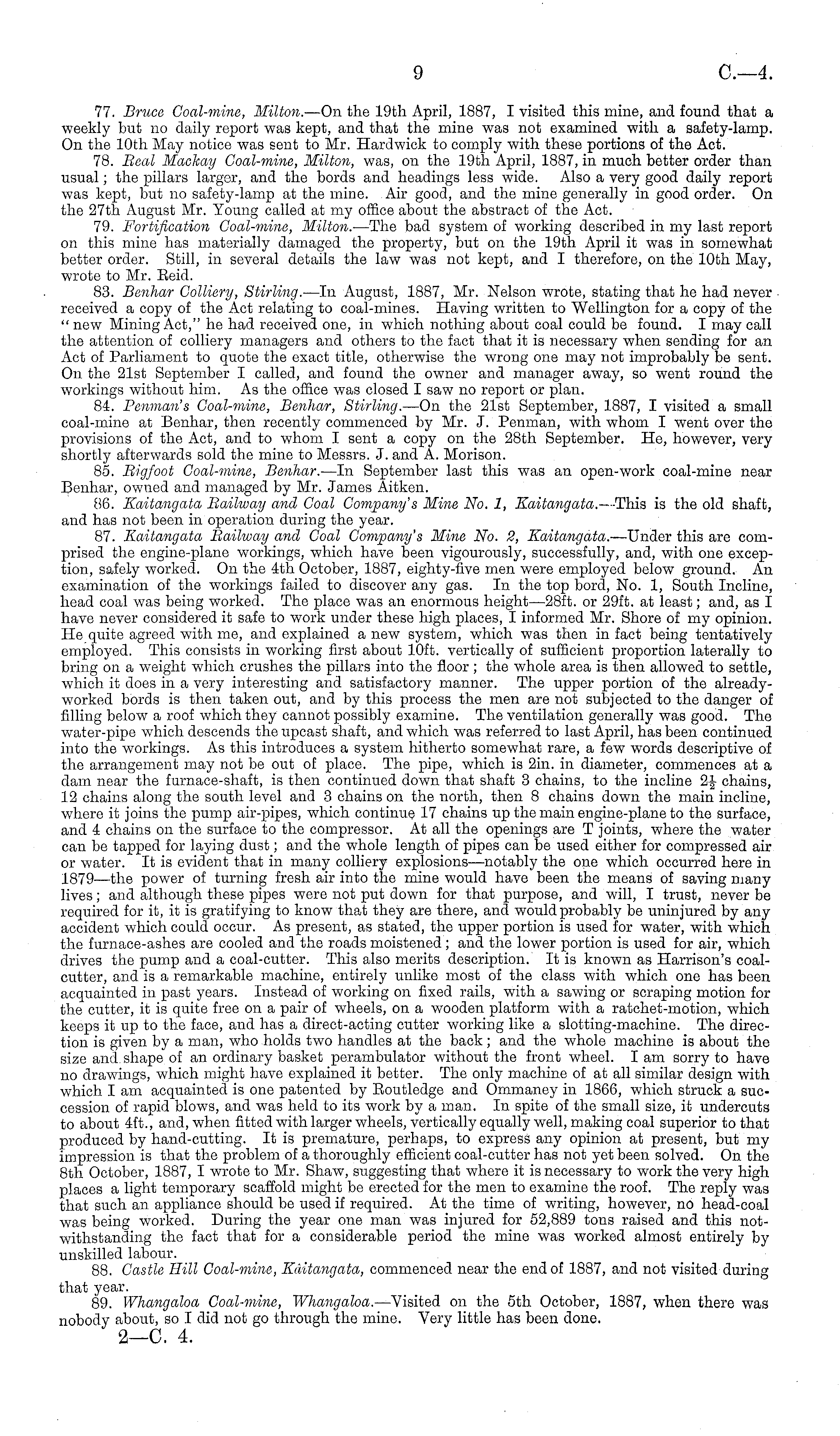 77. Bruce Goal-mine, Milton. —On the 19th April, 1887, I visited this mine, and found that a weekly but no daily report was kept, and that the mine was not examined with a safety-lamp. On the 10th May notice was sent to Mr. Hardwick to comply with these portions of the Act. 78. Heal Mackay Goal-mine, Milton, was, on the 19th April, 1887, in much better order than usual; the pillars larger, and the bords and headings less wide. Also a very good daily report was kept, but no safety-lamp at the mine. Air good, and the mine generally in good order. On the 27th August Mr. Young called at my office about the abstract of the Act. 79. Fortification Goal-mine, Milton. —The bad system of working described in my last report on this mine has materially damaged the property, but on the 19th April it was in somewhat better order. Still, in several details the law was not kept, and I therefore, on the 10th May, wrote to Mr. Eeid. 83. Benhar Colliery, Stirling. —ln August, 1887, Mr. Nelson wrote, stating that he had never received a copy of the Act relating to coal-mines. Having written to Wellington for a copy of the " new Mining Act," he had received one, in which nothing about coal could be found. I may call the attention of colliery managers and others to the fact that it is necessary when sending for an Act of Parliament to quote the exact title, otherwise the wrong one may not improbably be sent. On the 21st September I called, and found the owner and manager away, so went round the workings without him. As the office was closed I saw no report or plan. 84. Penman's Goal-mine, Benhar, Stirling. —On the 21st September, 1887, I visited a small coal-mine at Benhar, then recently commenced by Mr. J. Penman, with whom I went over the provisions of the Act, and to whom I sent a copy on the 28th September. He, however, very shortly afterwards sold the mine to Messrs. J. and A. Morison. 85. Iligfoot Goal-mine, Benhar. —In September last this was an open-work coal-mine near Benhar, owned and managed by Mr. James Aitken. 86. Kaitangata Bailway and Goal Company's Mine No. 1, Kaitangata.— -This is the old shaft, and has not been in operation during the year. 87. Kaitangata Bailway and Coal Company's Mine No. 2, Kaitangata.- —Under this are comprised the engine-plane workings, which have been vigourously, successfully, and, with one exception, safely worked. On the 4th October, 1887, eighty-five men were employed below ground. An examination of the workings failed to discover any gas. In the top bord, No. 1, South Incline, head coal was being worked. The place was an enormous height—2Bft. or 29ft. at least; and, as I have never considered it safe to work under these high places, I informed Mr. Shore of my opinion. He quite agreed with me, and explained a new system, which was then in fact being tentatively employed. This consists in working first about 10ft. vertically of sufficient proportion laterally to bring on a weight which crushes the pillars into the floor ; the whole area is then allowed to settle, which it does in a very interesting and satisfactory manner. The upper portion of the alreadyworked bords is then taken out, and by this process the men are not subjected to the danger of filling below a roof which they cannot possibly examine. The ventilation generally was good. The water-pipe which descends the upcast shaft, and which was referred to last April, has been continued into the workings. As this introduces a system hitherto somewhat rare, a few words descriptive of the arrangement may not be out of place. The pipe, which is 2in. in diameter, commences at a dam near the furnace-shaft, is then continued down that shaft 3 chains, to the incline 2-J chains, 12 chains along the south level and 3 chains on the north, then 8 chains down the main incline, where it joins the pump air-pipes, which continue 17 chains up the main engine-plane to the surface, and 4 chains on the surface to the compressor. At all the openings are T joints, where the water can be tapped for laying dust; and the whole length of pipes can be used either for compressed air or water. It is evident that in many colliery explosions—notably the one which occurred here in 1879 —the power of turning fresh air into the mine would have been the means of saving many lives; and although these pipes were not put down for that purpose, and will, I trust, never be required for it, it is gratifying to know that they are there, and would probably be uninjured by any accident which could, occur. As present, as stated, the upper portion is used for water, with which, the furnace-ashes are cooled and the roads moistened; and the lower portion is used for air, which drives the pump and a coal-cutter. This also merits description. It is known as Harrison's coalcutter, and is a remarkable machine, entirely unlike most of the class with which one has been acquainted in past years. Instead of working on fixed rails, with a sawing or scraping motion for the cutter, it is quite free on a pair of wheels, on a wooden platform with a ratchet-motion, which keeps it up to the face, and has a direct-acting cutter working like a slotting-machine. The direction is given by a man, who holds two handles at the back ; and the whole machine is about the size and shape of an ordinary basket perambulator without the front wheel. lam sorry to have no drawings, which might have explained it better. The only machine of at all similar design with which I am acquainted is one patented by Eoutledge and Ommaney in 1866, which struck a succession of rapid blows, and was held to its work by a man. In spite of the small size, it undercuts to about 4ft., and, when fitted with larger wheels, vertically equally well, making coal superior to that produced by hand-cutting. It is premature, perhaps, to express any opinion at present, but my impression is that the problem of a thoroughly efficient coal-cutter has not yet been solved. On the Bth October, 1887, I w
