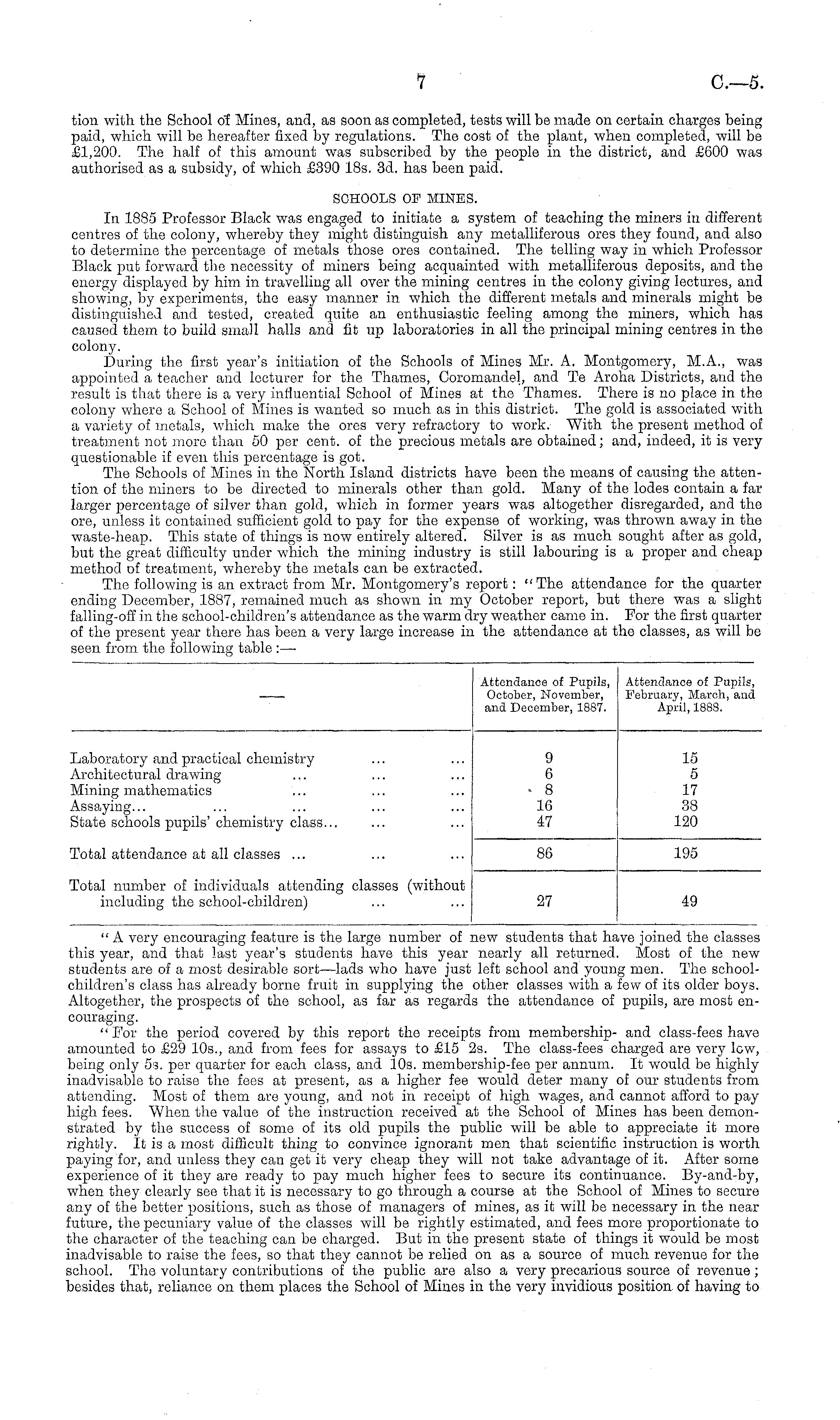 tion with the School of Mines, and, as soon as completed, tests will be made on certain charges being paid, which will be hereafter fixed by regulations. The cost of the plant, when completed, will be £1,200. The half of this amount was subscribed by the people in the district, and £600 was authorised as a subsidy, of which £390 18s. 3d. has been paid. SCHOOLS OF MINES. In 1885 Professor Black was engaged to initiate a system of teaching the miners in different centres of the colony, whereby they might distinguish any metalliferous ores they found, and also to determine the percentage of metals those ores contained. The telling way in which Professor Black put forward the necessity of miners being acquainted with metalliferous deposits, and the energy displayed by him in travelling all over the mining centres in the colony giving lectures, and showing, by experiments, tho easy manner in which the different metals and minerals might bo distinguished and tested, created quite an enthusiastic feeling among the miners, which has caused them to build small halls and fit up laboratories in all the principal mining centres in the colony. During the first year's initiation of tho Schools of Minos Mr. A. Montgomery, M.A., was appointed a teacher and lecturer for the Thames, Coromandel, and Te Aroha Districts, and the result is that there is a very influential School of Mines at the Thames. There is no place in the colony where a School of Mines is wanted so much as in this district. The gold is associated with a variety of metals, which make the ores very refractory to work. With the present method of treatment not more than 50 per cent, of the precious metals are obtained; and, indeed, it is very questionable if even this percentage is got. The Schools of Mines in the North Island districts have been the means of causing the attention of the miners to be directed to minerals other than gold. Many of the lodes contain a far larger percentage of silver than gold, which in former years was altogether disregarded, and the ore, unless it contained sufficient gold to pay for the expense of working, was thrown away in the waste-heap. This state of things is now entirely altered. Silver is as much sought after as gold, but the great difficulty under which the mining industry is still labouring is a proper and cheap method of treatment, whereby the metals can be extracted. The following is an extract from Mr. Montgomery's report: "The attendance for the quarter ending December, 1887, remained much as shown in my October report, but there was a slight falling-off in the school-children's attendance as the warm dry weather came in. For the first quarter of the present year there has been a very large increase in tho attendance at the classes, as will be seen from the following table : —■