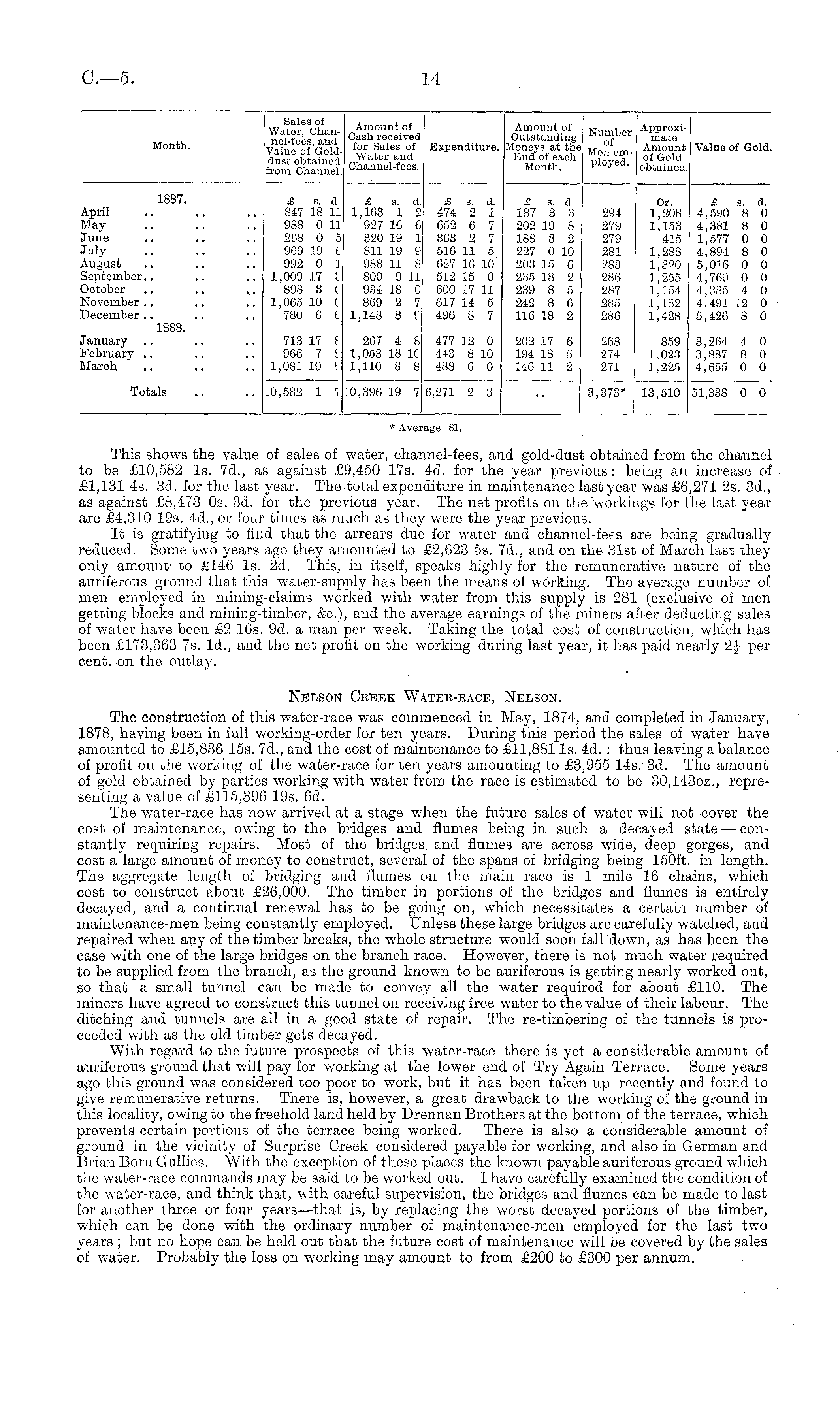 Month. Sales of Water, Chan-nel-fees, and Value of Golddust obtained from Channel. Amount of Cash roceived for Sales of Water and Channol-fees. Expenditure. Amount of Outstanding Moneys at the: End of each Month. Number of Men employed. Approximate Amount of Gold obtained Value of Gold. 1887. £ s. d. 847 18 11 988 0 11 268 0 5 969 19 C 992 0 1 1,009 17 I 898 3 ( 1,065 10 t 780 6 C £ s. d. 1,163 1 2 927 16 6 320 19 1 811 19 9 988 11 8 800 9 11 934 18 0 869 2 7 1,148 8 £ £ s. d. 474 2 1 652 6 7 363 2 7 516 11 5 627 16 10 512 15 0 600 17 11 617 14 5 496 8 7 £ s. a, 187 3 3 202 19 8 188 3 2 227 0 10 203 15 C 235 IS 2 239 8 5 242 8 G 110 18 2 Oz. 1,208 1,153 415 1,288 1,320 1,255 1,154 1,182 1,428 £ s. a. 4,590 8 0 4,381 8 0 1,577 0 0 4,894 8 0 5,016 0 0 4,769 0 0 4,385 4 0 4,491 12 0 5,426 8 0 ipril May fune luly August September.. Jctober November .. December 1888. 294 279 279 281 283 286 287 285 286 Fanuary February .. Harcb. 713 17 I 966 7 i 1,081 19 I 267 4 8 1,053 18 1C 1,110 8 8 477 12 0 443 8 10 488 6 0 202 17 6 194 18 5 146 11 2 268 274 271 859 1,023 1,225 3,264 4 0 3,887 8 0 4,055 0 0 Totals 3,373* 13,510 (.0,582 1 10,396 19 7 6,271 2 3 51,338 0 0 * Averai ;e 61.