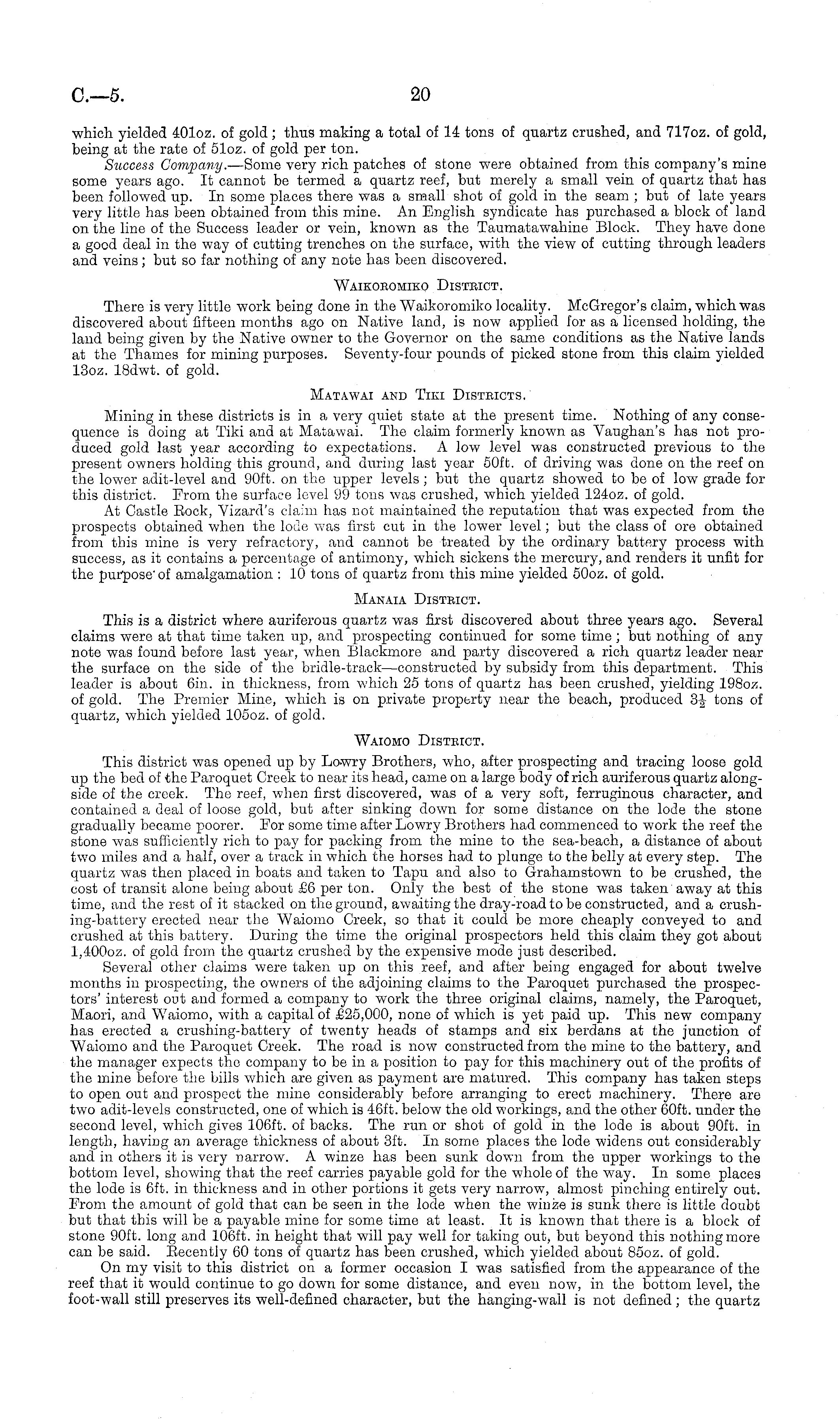 which yielded 401oz. of gold ; thus making a total of 14 tons of quartz crushed, and 7170z. of gold, being at the rate of 51oz. of gold per ton. Success Company. —Some very rich patches of stone were obtained from this company's mine some years ago. It cannot be termed a quartz reef, but merely a small vein of quartz that has been followed up. In some places there was a small shot of gold in the seam ; but of late years very little has been obtained from this mine. An English syndicate has purchased a block of land on the line of the Success leader or vein, known as the Taumatawahine Block. They have done a good deal in the way of cutting trenches on the surface, with the view of cutting through leaders and veins; but so far nothing of any note has been discovered. Waikoeomiko Distbiot. There is very little work being done in the Waikoromiko locality. McGregor's claim, which was discovered about fifteen months ago on Native land, is now applied for as a licensed holding, the land being given by the Native owner to the Governor on the same conditions as the Native lands at the Thames for mining purposes. Seventy-four pounds of picked stone from this claim yielded 13oz. 18dwt. of gold. Matawai and Tiki Distbicts. Mining in these districts is in a very quiet state at the present time. Nothing of any consequence is doing at Tiki and at Matawai. The claim formerly known as Vaughan's has not produced gold last year according to expectations. A low level was constructed previous to the present owners holding this ground, and during last year 50ft. of driving was done on the reef on the lower adit-level and 90ft. on the upper levels ; but the quartz showed to be of low grade for this district. From the surface level 99 tons was crushed, which yielded 1240z. of gold. At Castle Eock, Vizard's da:m has not maintained the reputation that was expected from the prospects obtained when the lode was first cut in the lower level; but the class of ore obtained from this mine is very refractory, and cannot be treated by the ordinary battery process with success, as it contains a percentage of antimony, which sickens the mercury, and renders it unfit for the purpose' of amalgamation : 10 tons of quartz from this mine yielded 50oz. of gold. Manaia District. This is a district where auriferous quartz was first discovered about three years ago. Several claims were at that time taken up, and prospecting continued for some time ; but nothing of any note was found before last year, when Blackmore and party discovered a rich quartz leader near the surface on the side of the bridle-track—constructed by subsidy from this department. This leader is about 6in. in thickness, from which 25 tons of quartz has been crushed, yielding 198oz. of gold. The Premier Mine, which is on private property near the beach, produced 3J tons of quartz, which yielded 105oz. of gold. Waiomo Distbict. This district was opened up by Lowry Brothers, who, after prospecting and tracing loose gold up the bed of the Paroquet Creek to near its head, came on a large body of rich auriferous quartz alongside of the creek. The reef, when first discovered, was of a very soft, ferruginous character, and contained a deal of loose gold, but after sinking down for some distance on the lode the stone gradually became poorer. For some time after Lowry Brothers had commenced to work the reef the stone was sufficiently rich to pay for packing from the mine to the sea-beach, a distance of about two miles and a half, over a track in which the horses had to plunge to the belly at every step. The quartz was then placed in boats and taken to Tapu and also to Grahamstown to be crushed, the cost of transit alone being about £6 per ton. Only the best of the stone was taken away at this time, and the rest of it stacked on the ground, awaiting the dray-road to be constructed, and a crush-ing-battery erected near the Waiomo Creek, so that it could be more cheaply conveyed to and crushed at this battery. During the time the original prospectors held this claim they got about 1,4000z. of gold from the quartz crushed by the expensive mode just described. Several other claims were taken up on this reef, and after being engaged for about twelve months in prospecting, the owners of the adjoining claims to the Paroquet purchased the prospectors' interest out and formed a company to work the three original claims, namely, the Paroquet, Maori, and Waiomo, with a capital of £25,000, none of which is yet paid up. This new company has erected a crushing-battery of twenty heads of stamps and six berdans at the junction of Waiomo and the Paroquet Creek. The road is now constructed from the mine to the battery, and the manager expects the company to be in a position to pay for this machinery out of the profits of the mine before the bills which are given as payment are matured. This company has taken steps to open out and prospect the mine considerably before arranging to erect machinery. There are two adit-levels constructed, one of which is 46ft. below the old workings, and the other 60ft. under the second level, which gives 106 ft. of backs. The run or shot of gold in the lode is about 90ft. in length, having an average thickness of about 3ft. In some places the lode widens out considerably and in others it is very narrow. A winze has been sunk down from the upper workings to the bottom level, showing that the reef carries payable gold for the whole of the way. In some places the lode is 6ft. in thickness and in other portions it gets very narrow, almost pinching entirely out. From the amount of gold that can be seen in the lode when the winze is sunk there is little doubt but that this will be a payable mine for some time at least. It is known that there is a block of stone 90ft. long and 106 ft. in height that will pay well for taking out, but beyond this nothing more can be said. Eecently 60 tons of quartz has been crushed, which yielded about 85oz. of gold. On my visit to