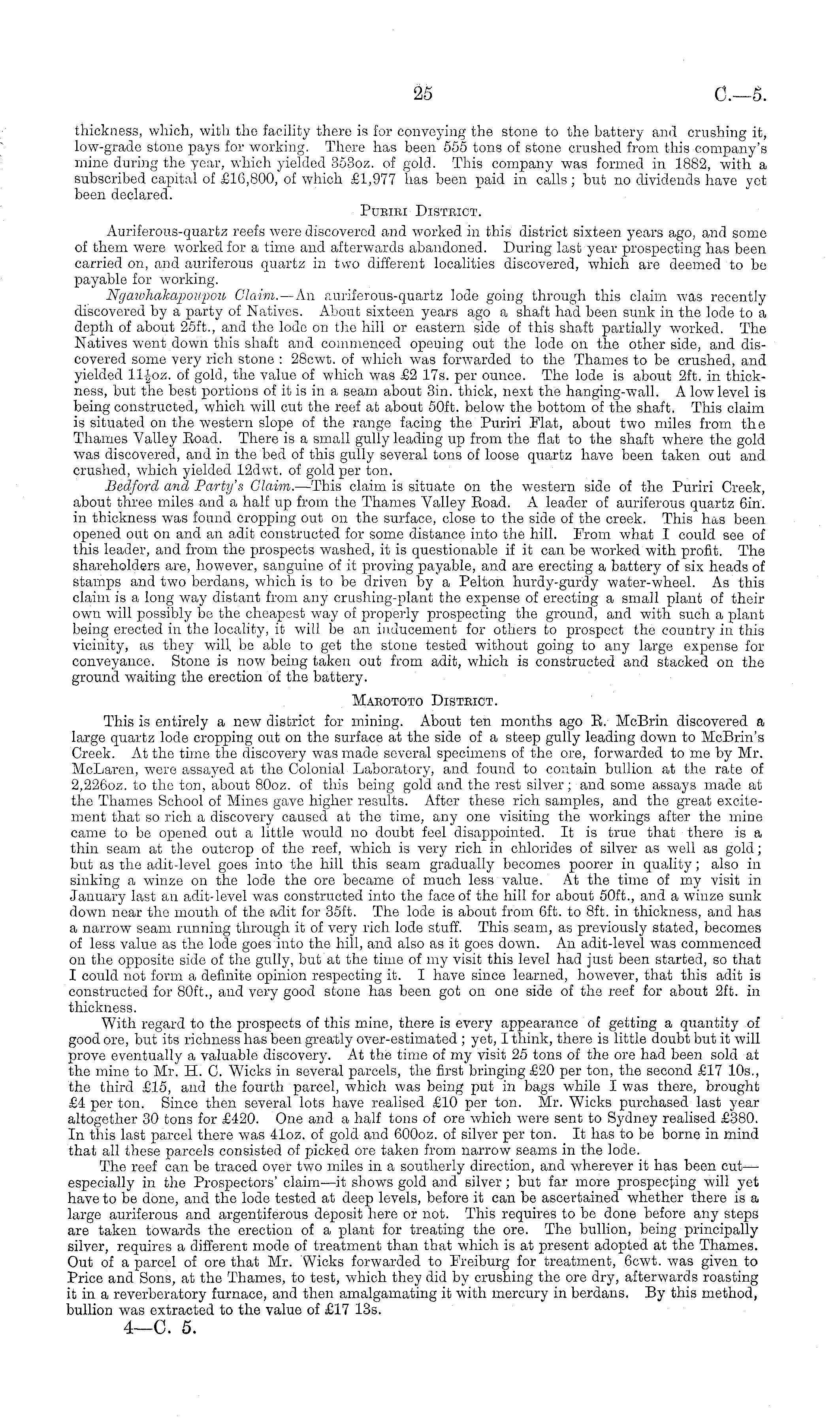 thickness, which, with the facility there is for conveying the stone to the battery and crushing it, low-grade stone pays for working. There has been 555 tons of stone crushed from this company's mine during the year, which yielded 3530z. of gold. This company was formed in 1882, with a subscribed capital of £16,800, of which £1,977 has been paid in calls ; but no dividends have yet been declared. Pueiei Distbict. Auriferous-quartz reefs were discovered and worked in this district sixteen years ago, and some of them were worked for a time and afterwards abandoned. During last year prospecting has been carried on, and auriferous quartz in two different localities discovered, which are deemed to bo payable for working. Ngawhakapoupou Claim.— An auriferous-quartz lode going through this claim was recently discovered by a party of Natives. About sixteen years ago a shaft had been sunk in the lode to a depth of about 25ft., and the lode on the hill or eastern side of this shaft partially worked. The Natives went down this shaft and commenced opening out the lode on the other side, and discovered some very rich stone : 28cwt. of which was forwarded to the Thames to be crushed, and yielded 11-Joz. of gold, the value of which was £2 17s. per ounce. The lode is about 2ft. in thickness, but the best portions of it is in a seam about 3in. thick, next the hanging-wall. A low level is being constructed, which will cut the reef at about 50ft. below the bottom of the shaft. This claim is situated on the western slope of the range facing the Puriri Flat, about two miles from the Thames Valley Boad. There is a small gully leading up from the flat to the shaft where the gold was discovered, and in the bed of this gully several tons of loose quartz have been taken out and crushed, which yielded 12dwt. of gold per ton. Bedford and Party's Claim. —This claim is situate on the western side of the Puriri Creek, about three miles and a half up from the Thames Valley Eoad. A leader of auriferous quartz 6in. in thickness was found cropping out on the surface, close to the side of the creek. This has been opened out on and an adit constructed for some distance into the hill. From what I could see of this leader, and from the prospects washed, it is questionable if it can be worked with profit. The shareholders are, however, sanguine of it proving payable, and are erecting a battery of six heads of stamps and two berdans, which is to be driven by a Pelton hurdy-gurdy water-wheel. As this claim is a long way distant from any crushing-plant the expense of erecting a small plant of their own will possibly be the cheapest way of properly prospecting the ground, and with such a plant being erected in the locality, it will be an inducement for others to prospect the country in this vicinity, as they will, be able to get the stone tested without going to any large expense for conveyance. Stone is now being taken out from adit, which is constructed and stacked on the ground, waiting the erection of the battery. Mabototo Disteict. This is entirely a new district for mining. About ten months ago E. Mcßrin discovered a largo quartz lode cropping out on the surface at the side of a steep gully leading down to Mcßrin's Creek. At the time the discovery was made several specimens of the ore, forwarded to mo by Mr. McLaren, were assayed at the Colonial Laboratory* and found to contain bullion at the rate of 2,2260z. to the ton, about 80oz. of this being gold and the rest silver; and some assays made at the Thames School of Mines gave higher results. After these rich samples, and the great excitement that so rich a discovery caused at the time, any one visiting the workings after the mine came to be opened out a little would no doubt feel disappointed. It is true that there is a thin seam at the outcrop of the reef, which is very rich in chlorides of silver as well as gold; but as the adit-level goes into the hill this seam gradually becomes poorer in quality; also in sinking a winze on the lode the ore became of much less value. At the time of my visit in January last an adit-level was constructed into the face of the hill for about 50ft., and a winze sunk down near the mouth of the adit for 35ft. The lode is about from 6ft. to Bft. in thickness, and has a narrow seam running through it of very rich lode stuff. This seam, as previously stated, becomes of less value as the lode goes into the hill, and also as it goes down. An adit-level was commenced on the opposite side of the gully, but at the time of my visit this level had just been started, so that I could not form a definite opinion respecting it. I have since learned, however, that this adit is constructed for 80ft., and very good stone has been got on one side of the reef for about 2ft. in thickness. With regard to the prospects of this mine, there is every appearance of getting a quantity of good ore, but its richness has been greatly over-estimated ; yet, I think, there is little doubt but it will prove eventually a valuable discovery. At the time of my visit 25 tons of the ore had been sold at the mine to Mr. H. C. Wicks in several parcels, the first bringing £20 per ton, the second £17 10s., the third £15, and the fourth parcel, which was being put in bags while I was there, brought £4 per ton. Since then several lots have realised £10 per ton. Mr. Wicks purchased last year altogether 30 tons for £420. One and a half tons of ore which were sent to Sydney realised £380. In this last parcel there was 41oz. of gold and 600oz. of silver per ton. It has to be borne in mind that all these parcels consisted of picked ore taken from narrow seams in the lode. The reef can be traced over two miles in a southerly direction, and wherever it has been cut— especially in the Prospectors' claim—it shows gold and silver; but far more prospecting will yet have to be done, and the lode tested at deep levels, before it can be ascertained whether there is a large aurifer