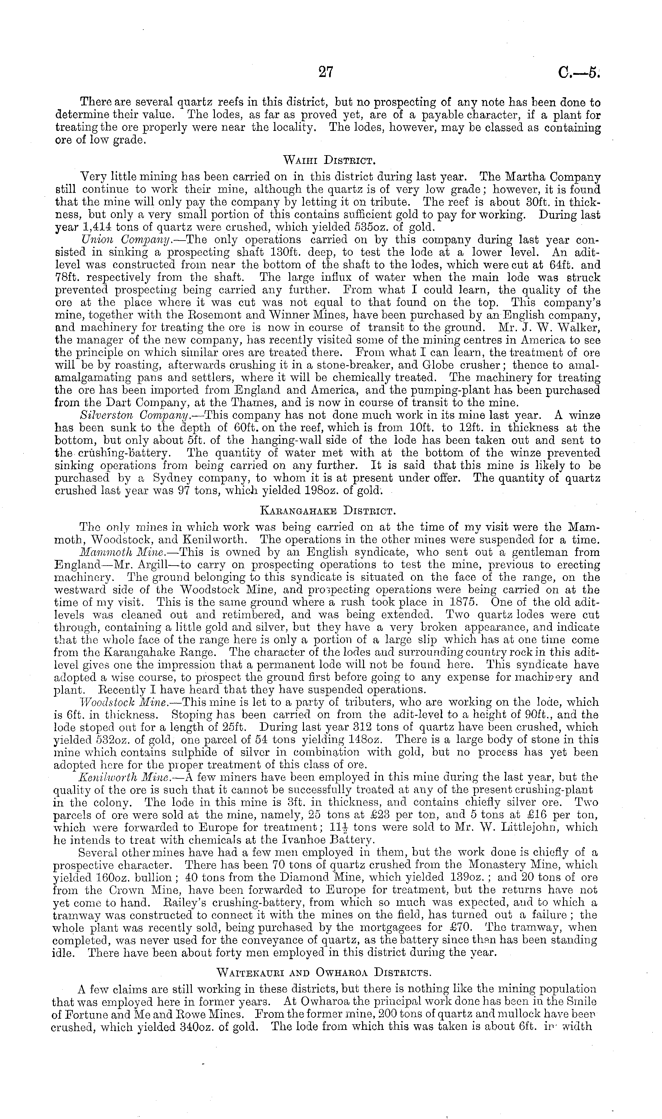 There are several quartz reefs in this district, but no prospecting of any note has been done to determine their value. The lodes, as far as proved yet, are of a payable character, if a plant for treating the ore properly were near the locality. The lodes, however, may be classed as containing ore of low grade. Waihi District. Very little mining has been carried on in this district during last year. The Martha Company still continue to work their mine, although the quartz is of very low grade; however, it is found that the mine will only pay the company by letting it on tribute. The reef is about 30ft. in thickness, but only a very small portion of this contains sufficient gold to pay for working. During last year 1,414 tons of quartz were crushed, which yielded 5350z. of gold. Union Company. —The only operations carried on by this company during last year consisted in sinking a prospecting shaft 130 ft. deep, to test the lode at a lower level. An aditlevel was constructed from near the bottom of the shaft to the lodes, which were cut at 64ft. and 78ft. respectively from the shaft. The large influx of water when the main lode was struck prevented prospecting being carried any further. From what I could learn, the quality of the ore at the place where it was cut was not equal to that found on the top. This company's mine, together with the Eosemont and Winner Mines, have been purchased by an English company, and machinery for treating the ore is now in course of transit to the ground. Mr. J. W. Walker, the manager of the new company, has recently visited some of the mining centres in America to see the principle on which similar ores are treated there. From what I can learn, the treatment of ore will be by roasting, afterwards crushing it in a stone-breaker, and Globe crusher; thence to amalamalgamating pans and settlers, where it will be chemically treated. The machinery for treating the ore has been imported from England and America, and the pumping-plant has been purchased from the Dart Company, at the Thames, and is now in course of transit to the mine. Silverston Company. —This company has not done much work in its mine last year. A winze has been sunk to the depth of 60ft. on the reef, which is from 10ft. to 12ft. in thickness at the bottom, but only about sft. of the hanging-wall side of the lode has been taken out and sent to the crushing-battery. The quantity of water met with at the bottom of the winze prevented sinking operations from being carried on any further. It is said that this mine is likely to be purchased by a Sydney company, to whom it is at present under offer. The quantity of quartz crushed last year was 97 tons, which yielded 198oz. of gold. Karangahake District. The only mines in which work was being carried on at the time of my visit were the Mammoth, Woodstock, and Kenilworth. The operations in the other mines were suspended for a time. Mammoth Mine. —This is owned by an English syndicate, who sent out a gentleman from England—Mr. Argill—to carry on prospecting operations to test the mine, previous to erecting machinery. The ground belonging to this syndicate is situated on the face of the range, on the westward side of the Woodstock Mine, and prospecting operations were being carried on at the time of my visit. This is the same ground where a rush took place in 1875. One of the old aditlevels was cleaned out and retimbered, and was being extended. Two quartz lodes were cut through, containing a little gold and silver, but they have a very broken appearance, and indicate that the whole face of the range here is only a portion of a large slip which has at one time come from the Karangahake Eange. The character of the lodes and surrounding country rock in this aditlevel gives one the impression that a permanent lode will not be found hero. This syndicate have adopted a wise course, to prospect the ground first before going to any expense for machinery and plant. Eecently I have heard that they have suspended operations. "Woodstock Mine. —This mine is let to a party of tributers, who are working on the lode, which is 6ft. in thickness. Stoping has been carried on from the adit-level to a height of 90ft., and the lode stoped out for a length of 25ft. During last year 312 tons of quartz have been crushed, which yielded 5320z. of gold, one parcel of 54 tons yielding 148oz. There is a large body of stone in this mine which contains sulphide of silver in combination with gold, but no process has yet been adopted here for the proper treatment of this class of ore. Kenilworth Mine. —A few miners have been employed in this mine during the last year, but the quality of the ore is such that it cannot be successfully treated at any of the present crushing-plant in the colony. The lode in this mine is 3ft. in thickness, and contains chiefly silver ore. Two parcels of ore were sold at the mine, namely, 25 tons at £23 per ton, and 5 tons at £16 per ton, which were forwarded to Europe for treatment; 111 tons were sold to Mr. W. Littlejohn, which he intends to treat with chemicals at the Ivanhoe Battery. Several other mines have had a few men employed in them, but the work done is chiefly of a prospective character. There has been 70 tons of quartz crushed from the Monastery Mine, which yielded 160oz. bullion ; 40 tons from the Diamond Mine, which yielded 1390z. ; and 20 tons of ore from the Crown Mine, have been forwarded to Europe for treatment, but the returns have not yet come to hand. Eailey's crushing-battery, from which so much was expected, and to which a tramway was constructed to connect it with the mines on the field, has turned out a failure ; the whole plant was recently sold, being purchased by the mortgagees for £70. 'The tramway, when completed, was never used for the conveyance of quartz, as the battery since than has been standing idle. There have been about forty men employed in this district during the year. Waitekauei and Owhaeoa Districts. A