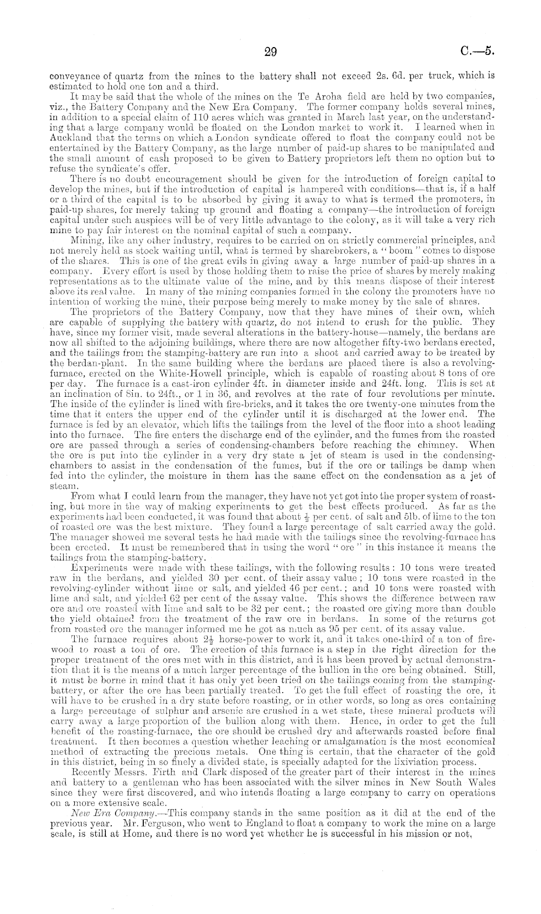 conveyance of quartz from the mines to the battery shall not exceed 2s. 6d. per truck, which is estimated to hold one ton and a third. It may bo said that the whole of the mines on the Te Aroha field are held by two companies, viz., the Battery Company and the New Era Company. The former company holds several mines, in addition to a special claim of 110 acres which was granted in March last year, on the understanding that a large company would be floated on the London market to work it. I learned when in Auckland that the terms on which a London syndicate offered to float the company could not be entertained by the Battery Company, as the large number of paid-up shares to be manipulated and the small amount of cash proposed to be given to Battery proprietors left them no option but to refuse the syndicate's offer. There is no doubt encouragement should be given for the introduction of foreign capital to develop the mines, but if the introduction of capital is hampered with conditions—that is, if a half or a third of the capital is to be absorbed by giving it away to what is termed the promoters, in paid-up shares, for merely taking up ground and floating a company—the introduction of foreign capital under such auspices will be of very little advantage to the colony, as it will take a very rich mine to pay fair interest on the nominal capital of such a company. Mining, like any other industry, requires to be carried on on strictly commercial principles, and not merely held as stock waiting until, what is termed by sharebrokers, a " boom " comes to dispose of the shares. This is one of the great evils in giving away a large number of paid-up shares in a company. Every effort is used by those holding them to raise the price of shares by merely making representations as to the ultimate value of the mine, and by this means dispose of their interest a.bove its real value. In many of the mining companies formed in the colony the promoters have no intention of working the mine, their purpose being merely to make money by the sale of shares. The proprietors of the Battery Company, now that they have mines of their own, which are capable of supplying the battery with quartz, do not intend to crush for the public. They have, since my former visit, made several alterations in the battery-house—namely, the berdans are now all shifted to the adjoining buildings, where there are now altogether fifty-two berdans erected, and the tailings from the stamping-battery are run into a shoot and carried away to be treated by the berdan-plant. In the same building where the berdans are placed there is also a revolvingfurnace, erected on the White-Howell principle, which is capable of roasting about 8 tons of ore per day. The furnace is a cast-iron cylinder 4ft. in diameter inside and 24ft. long. This is set at an inclination of Bin. to 24ft., or 1 in 36, and revolves at the rate of four revolutions per minute. The inside of the cylinder is lined with fire-bricks, and it takes the ore twenty-one minutes from the time that it enters the upper end of the cylinder until it is discharged at the lower end. The furnace is fed by an elevator, which lifts the tailings from the level of the floor into a shoot leading into the furnace. The fire enters the discharge end of the cylinder, and the fumes from the roasted ore are passed through a series of condensing-chambers before reaching the chimney. When the ore is put into the cylinder in a very dry state a jet of steam is used in the condensingchambers to assist in the condensation of the fumes, but if the ore or tailings be damp when fed into the cylinder, the moisture in them has the same effect on the condensation as a jet of steam. Prom what I could learn from the manager, they have not yet got into the proper system of roasting, but more in the way of making experiments to get the best effects produced. As far as the experiments had been conducted, it was found that about \ per cent, of salt and 51b. of lime to the ton of roasted ore was the best mixture. They found a large percentage of salt carried away the gold. The manager showed me several tests he had made with the tailings since the revolving-furnace has been erected. It must bo remembered that in using the word " ore "in this instance it means the tailings from the stamping-battery. Experiments were made with these tailings, with the following results : 10 tons were treated raw in the berdans, and yielded 30 per cent, of their assay value ; 10 tons were roasted in the revolving-cylinder without lime or salt, and yielded 46 per cent.; and 10 tons were roasted with lime and salt, and yielded 62 per cent of the assay value. This shows the difference between raw ore and ore roasted with lime and salt to be 32 per cent.; the roasted ore giving more than double the yield obtained from the treatment of the raw ore in berdans. In some of the returns got from roasted ore the manager informed me he got as much as 95 per cent, of its assay value. The furnace requires about 2-| horse-power to work it, and it takes one-third of a ton of firewood to roast a ton of ore. The erection of this furnace is a step in the right direction for the proper treatment of the ores met with in this district, and it has been proved by actual demonstration that it is the means of a much larger percentage of the bullion in the ore being obtained. Still, it must be borne in mind that it has only yet been tried on the tailings coming from the stampingbattery, or after the ore has been partially treated. To get the full effect of roasting the ore, it will have to be crushed in a dry state before roasting, or in other words, so long as ores containing a large percentage of sulphur and arsenic are crushed in a wet state, these mineral products will carry away a largo proportion of the bullion along with them. Hence, in order to get the full benefit of the roasting-furnace, the ore should be crushed dry and afterwards roasted before final tr