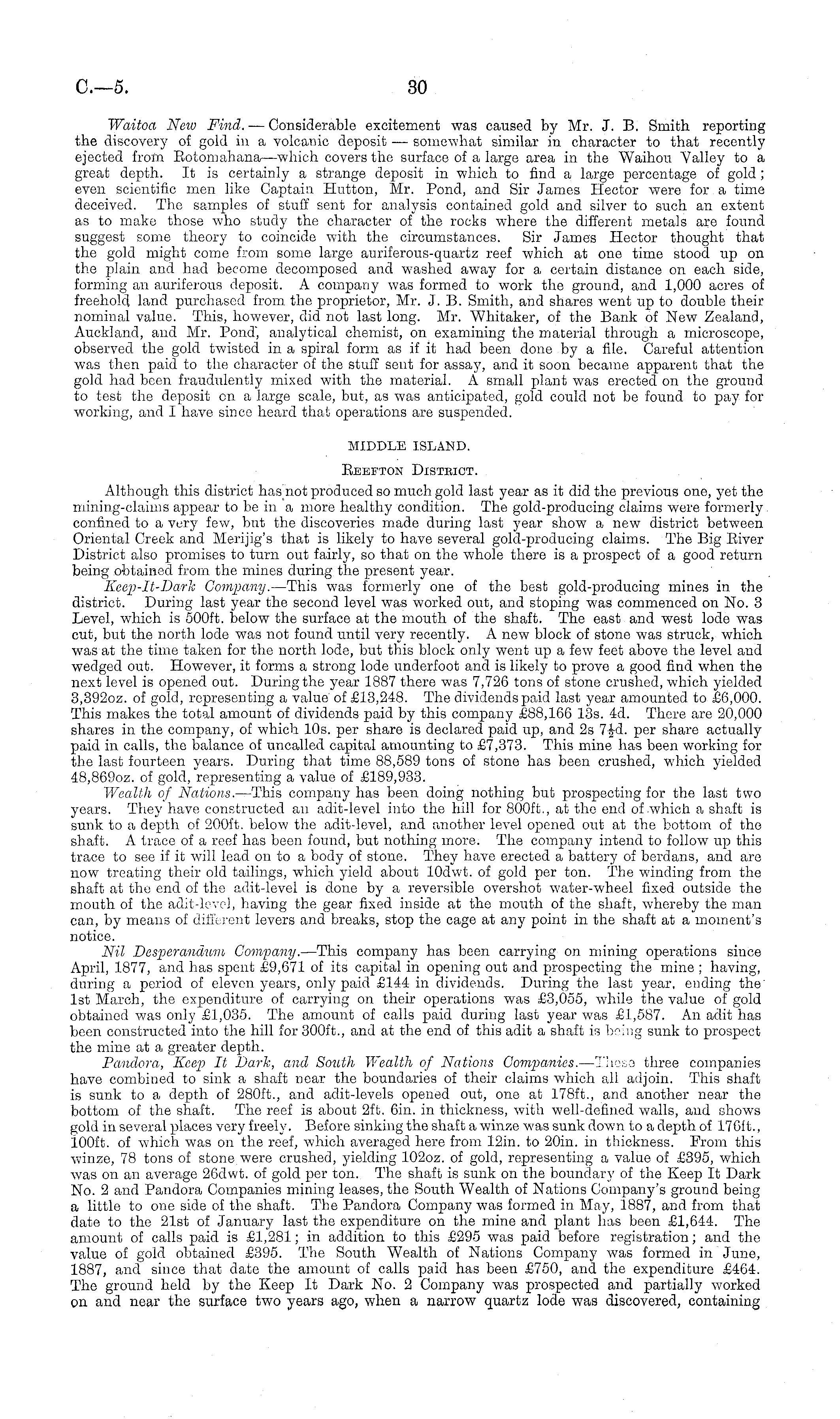 Waitoa Neio Find. ■ — Considerable excitement was caused by Mr. J. B. Smith reporting the discovery of gold in a volcanic deposit — somewhat similar in character to that recently ejected from Eotomahana—which covers the surface of a large area in the Waihou Valley to a great depth. It is certainly a strange deposit in which to find a large percentage of gold; even scientific men like Captain Hutton, Mr. Pond, and Sir James Hector were for a time deceived. The samples of stuff sent for analysis contained gold and silver to such an extent as to make those who study the character of the rocks where the different metals are found suggest some theory to coincide with the circumstances. Sir James Hector thought that the gold might come from some large auriferous-quartz reef which at one time stood up on the plain and had become decomposed and washed away for a certain distance on each side, forming an auriferous deposit. A company was formed to work the ground, and 1,000 acres of freehold land purchased from the proprietor, Mr. J. B. Smith, and shares went up to double their nominal value. This, however, did not last long. Mr. Whitaker, of the Bank of New Zealand, Auckland, and Mr. Pond", analytical chemist, on examining the material through a microscope, observed the gold twisted in a spiral form as if it had been done by a file. Careful attention was then paid to the character of the stuff sent for assay, and it soon became apparent that the gold had been fraudulently mixed with the material. A small plant was erected on the ground to test the deposit on a large scale, but, as was anticipated, gold could not be found to pay for working, and I have since heard that operations are suspended. MIDDLE ISLAND. Eeefton Distbict. Although this district has not produced so much gold last year as it did the previous one, yet the mining-claims appear to be in a more healthy condition. The gold-producing claims were formerly, confined to a very few, but the discoveries made during last year show a new district between Oriental Creek and Merijig's that is likely to have several gold-producing claims. The Big Paver District also promises to turn out fairly, so that on the whole there is a prospect of a good return being obtained from the mines during the present year. Keep-It-Dark Company. —This was formerly one of the best gold-producing mines in the district. During last year the second level was worked out, and stoping was commenced on No. 3 Level, which is 500 ft. below the surface at the mouth of the shaft. The east and west lode was cut, but the north lode was not found until very recently. A new block of stone was struck, which was at the time taken for the north lode, but this block only went up a few feet above the level and wedged out. However, it forms a strong lode underfoot and is likely to prove a good find when the next level is opened out. During the year 1887 there was 7,726 tons of stone crushed, which yielded 3,3920z. of gold, representing a value of £13,248. The dividends paid last year amounted to £6,000. This makes the total amount of dividends paid by this company £88,166 13s. 4d. There are 20,000 shares in the company, of which 10s. per share is declared paid up, and 2s 7^-d. per share actually paid in calls, the balance of uncalled capital amounting to £7,373. This mine has been working for the last fourteen years. During that time 88,589 tons of stone has been crushed, which yielded 48,8690z. of gold, "representing a value of £189,933. Wealth of Nations. —This company has been doing nothing but prospecting for the last two years. They have constructed an adit-level into the hill for 800 ft., at the end of .which a shaft is sunk to a depth of 200 ft. below the adit-level, and another level opened out at the bottom of the shaft. A trace of a reef has been found, but nothing more. The company intend to follow up this trace to see if it will lead on to a body of stone. They have erected a battery of berdans, and are now treating their old tailings, which yield about lOdwt. of gold per ton. The winding from the shaft at the end of the adit-level is done by a reversible overshot water-wheel fixed outside the mouth of the adit-level, having the gear fixed inside at the mouth of the shaft, whereby the man can, by means of different levers and breaks, stop the cage at any point in the shaft at a moment's notice. Nil Desperandum Company. —This company has been carrying on mining operations since April, 1877, and has spent £9,671 of its capital in opening out and prospecting the mine ; having, during a period of eleven years, only paid £144 in dividends. During the last year, ending the Ist March, the expenditure of carrying on their operations was £3,055, while the value of gold obtained was only £1,035. The amount of calls paid during last year was £1,587. An adit has been constructed into the hill for 300 ft., and at the end of this adit a shaft is being sunk to prospect the mine at a greater depth. Pandora, Keep It Dark, and South Wealth of Nations Companies. —TJicso three companies have combined to sink a shaft near the boundaries of their claims which till adjoin. This shaft is sunk to a depth of 280 ft., and adit-levels opened out, one at 178 ft., and another near the bottom of the shaft. The reef is about 2ft. 6in. in thickness, with well-defined walls, and shows gold in several places very freely. Before sinking the shaft a winze was sunk down to a depth of 176 ft., 100 ft. of which was on the reef, which averaged here from 12in. to 20in. in thickness. From this winze, 78 tons of stone were crushed, yielding 102oz. of gold, representing a value of £395, which was on an average 26dwt. of gold per ton. The shaft is sunk on the boundary of the Keep It Dark No. 2 and Pandora Companies mining leases, the South Wealth of Nations Company's ground being a little to one side of the shaft. The Pandora Company was formed in May, 1887, and from that date to the 21st 