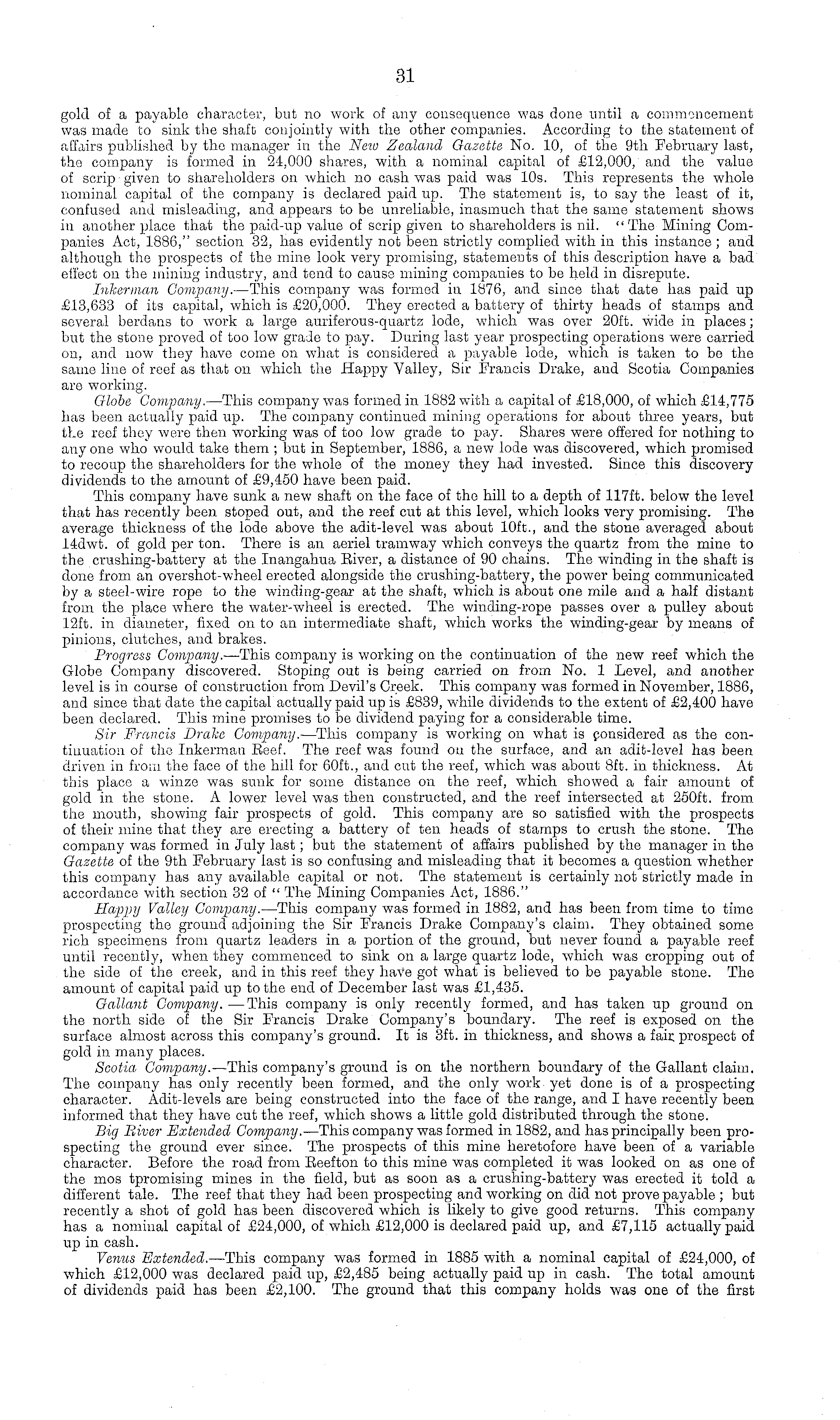 gold of a payable character, but no work of any consequence was done until a commencement was made to sink the shaft conjointly with the other companies. According to the statement of affairs published by the manager in the New Zealand Gazette No. 10, of the 9th February last, the company is formed in 24,000 shares, with a nominal capital of £12,000, and the value of scrip given to shareholders on which no cash was paid was 10s. This represents tho whole nominal capital of the company is declared paid up. The statement is, to say the least of it, confused and misleading, and appears to be unreliable, inasmuch that the same statement shows iv another place that the paid-up value of scrip given to shareholders is nil. "The Mining Companies Act, 1886," section 32, has evidently not been strictly complied with in this instance; and although the prospects of the mine look very promising, statements of this description have a bad effect on the mining industry, and tend to cause mining companies to be held in disrepute. Inkerman Company. —This company was formed in 1876, and since that date has paid up £13,633 of its capital, which is £20,000. They erected a battery of thirty heads of stamps and several berdans to work a large auriferous-quartz lode, which was over 20ft. wide in places; but the stone proved of too low grade to pay. During last year prospecting operations were carried on, and now they have come on what is considered a payable lode, which is taken to be the same line of reef as that on which the Happy Valley, Sir Francis Drake, and Scotia Companies are working. Globe Company. —This company was formed in 1882 with a capital of £18,000, of which £14,775 has been actually paid up. The company continued mining operations for about three years, but the reef they were then working was of too low grade to pay. Shares were offered for nothing to any one who would take them ; but in September, 1886, a new lode was discovered, which promised to recoup the shareholders for the whole of the money they had invested. Since this discovery dividends to the amount of £9,450 have been paid. This company have sunk a new shaft on the face of tho hill to a depth of 117 ft. below the level that has recently been stoped out, and the reef cut at this level, which looks very promising. The average thickness of the lode above the adit-level was about 10ft., and the stone averaged about 14dwt. of gold per ton. There is an aeriel tramway which conveys the quartz from the mine to the crushing-battery at the Inangahua River, a distance of 90 chains. The winding in the shaft is done from an overshot-wheel erected alongside the crushing-battery, the power being communicated by a steel-wire rope to the winding-gear at the shaft, which is about one mile and a half distant from the place where the water-wheel is erected. The winding-rope passes over a pulley about 12ft. in diameter, fixed on to an intermediate shaft, which works the winding-gear by means of pinions, clutches, and brakes. Progress Company. —This company is working on the continuation of the new reef which the Globe Company discovered. Stoping out is being carried on from No. 1 Level, and another level is in course of construction from Devil's Creek. This company was formed in November, 1886, and since that date the capital actually paid up is £839, while dividends to the extent of £2,400 have been declared. This mine promises to be dividend paying for a considerable time. Sir Francis Drake Company. —This company is working on what is considered as the continuation of the Inkerman Reef. The reef was found on the surface, and an adit-lovol has been driven in from the face of the hill for 60ft., and cut the reef, which was about Bft. in thickness. At this place a winze was sunk for some distance on the reef, which showed a fair amount of gold in the stone. A lower level was then constructed, and the reef intersected at 250 ft. from the mouth, showing fair prospects of gold. This company are so satisfied with the prospects of their mine that they are erecting a battery of ten heads of stamps to crush the stone. The company was formed iv July last; but the statement of affairs published by the manager in the Gazette of the 9th February last is so confusing and misleading that it becomes a question whether this company has any available capital or not. The statement is certainly not strictly made in accordance with section 32 of " The Mining Companies Act, 1886." Happy Valley Company. —This company was formed in 1882, and has been from time to time prospecting the ground adjoining the Sir Francis Drake Company's claim. They obtained some rich specimens from quartz leaders in a portion of the ground, but never found a payable reef until recently, when they commenced to sink on a large quartz lode, which was cropping out of the side of the creek, and in this reef they have got what is believed to be payable stone. The amount of capital paid up to the end of December last was £1,435. Gallant Company. —This company is only recently formed, and has taken up ground on the north side of the Sir Francis Drake Company's boundary. The reef is exposed on the surface almost across this company's ground. It is 3ft. in thickness, and shows a fair prospect of gold in many places. Scotia Company. —This company's ground is on the northern boundary of the Gallant claim. The company has only recently been formed, and the only work yet done is of a prospecting character. Adit-levels are being constructed into the face of the range, and I have recently been informed that they have cut the reef, which shows a little gold distributed through the stone. Big Biver Extended Company. —This company was formed in 1882, and has principally been prospecting the ground ever since. The prospects of this mine heretofore have been of a variable character. Before the road from Reefton to this mine was completed it was looked on as one of the mos tpromising mines in