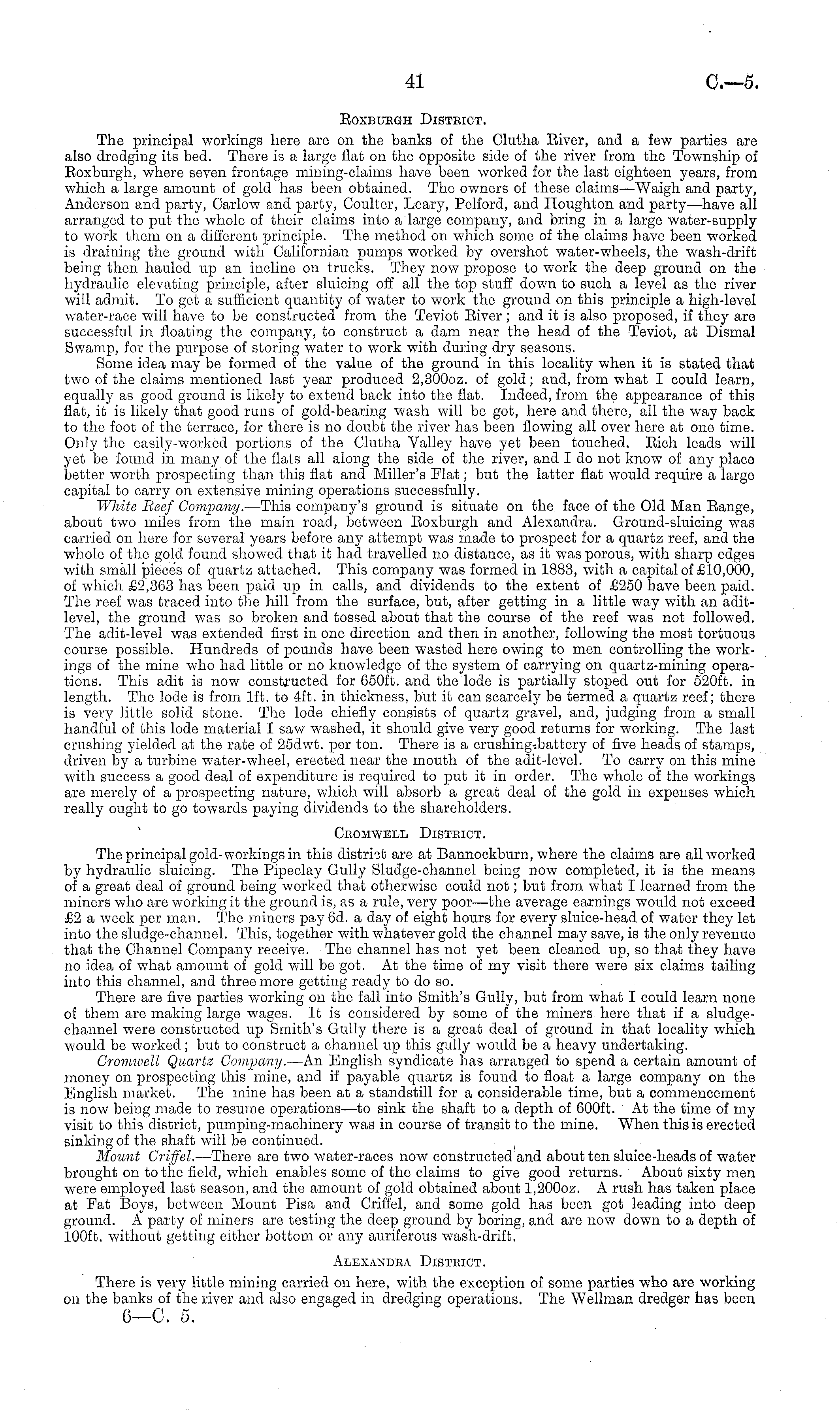 Eoxbuegh District. The principal workings here are on the banks of the Clutha Eiver, and a few parties are also dredging its bed. There is a large flat on the opposite side of the river from the Township of Roxburgh, where seven frontage mining-claims have been worked for the last eighteen years, from which a large amount of gold has been obtained. The owners of these claims—Waigh and party, Anderson and party, Carlow and party, Coulter, Leary, Pelford, and Houghton and party—have all arranged to put the whole of their claims into a large company, and bring in a large water-supply to work them on a different principle. The method on which some of the claims have been worked is draining the ground with Californian pumps worked by overshot water-wheels, the wash-drift being then hauled up an incline on trucks. They now propose to work the deep ground on the hydraulic elevating principle, after sluicing off all the top stuff down to such a level as the river will admit. To get a sufficient quantity of water to work the ground on this principle a high-level water-race will have to be constructed from the Teviot Eiver; and it is also proposed, if they are successful in floating the company, to construct a dam near the head of the Teviot, at Dismal Swamp, for the purpose of storing water to work with during dry seasons. Some idea may be formed of the value of the ground in this locality when it is stated that two of the claims mentioned last year produced 2,3000z. of gold; and, from what I could learn, equally as good ground is likely to extend back into the flat. Indeed, from the appearance of this flat, it is likely that good runs of gold-bearing wash will be got, here and there, all the way back to the foot of the terrace, for there is no doubt the river has been flowing all over here at one time. Only the easily-worked portions of the Clutha Valley have yet been touched. Eich leads will yet be found in many of the flats all along the side of the river, and I do not know of any place better worth prospecting than this flat and Miller's Mat; but the latter flat would require a large capital to carry on extensive mining operations successfully. White Beef Company. —This company's ground is situate on the face of the Old Man Eange, about two miles from the main road, between Roxburgh and Alexandra. Ground-sluicing was carried on here for several years before any attempt was made to prospect for a quartz reef, and the whole of the gold found showed that it had. travelled no distance, as it was porous, with sharp edges with small pieces of quartz attached. This company was formed in 1883, with a capital of £10,000, of which £2,363 has been paid up in calls, and dividends to the extent of £250 have been paid. The reef was traced into the hill from the surface, but, after getting in a little way with an aditlevel, the ground was so broken and tossed about that the course of the reef was not followed. The adit-level was extended first in one direction and then in another, following the most tortuous course possible. Hundreds of pounds have been wasted here owing to men controlling the workings of the mine who had little or no knowledge of the system of carrying on quartz-mining operations. This adit is now constructed for 650 ft. and the lode is partially stoped out for 520 ft. in length. The lode is from lft. to 4ft. in thickness, but it can scarcely be termed a quartz reef; there is very little solid stone. The lode chiefly consists of quartz gravel, and, judging from a small handful of this lode material I saw washed, it should give very good returns for working. The last crushing yielded at the rate of 25dwt. per ton. There is a crushing-battery of five heads of stamps, driven by a turbine water-wheel, erected near the mouth of the adit-level. To carry on this mine with success a good deal of expenditure is required to put it in order. The whole of the workings are merely of a prospecting nature, which will absorb a great deal of the gold in expenses which really ought to go towards paying dividends to the shareholders. Cromwell District. The principal gold-workings in this district are at Bannockburn, where the claims are all worked by hydraulic sluicing. The Pipeclay Gully Sludge-channel being now completed, it is the means of a great deal of ground being worked that otherwise could not; but from what I learned from the miners who are working it the ground is, as a rule, very poor—the average earnings would not exceed £2 a week per man. The miners pay 6d. a day of eight hours for every sluice-head of water they let into the sludge-channel. This, together with whatever gold the channel may save, is the only revenue that the Channel Company receive. The channel has not yet been cleaned up, so that they have no idea of what amount of gold will be got. At the time of my visit there were six claims tailing into this channel, and three more getting ready to do so. There are five parties working on the fall into Smith's Gully, but from what I could learn none of them are making large wages. It is considered by some of the miners here that if a sludgechannel were constructed up Smith's Gully there is a great deal of ground in that locality which would be worked; but to construct a channel up this gully would be a heavy undertaking. Cromwell Quartz Company.- —An English syndicate has arranged to spend a certain amount of money on prospecting this mine, and if payable quartz is found to float a large company on the English market. The mine has been at a standstill for a considerable time, but a commencement is now being made to resume operations—to sink the shaft to a depth of 600 ft. At the time of my visit to this district, pumping-machinery was in course of transit to the mine. When this is erected sinking of the shaft will be continued. Mount Griffel. —There are two water-races now constructed and about ten sluice-heads of water brought on to the field, which enables some of the c