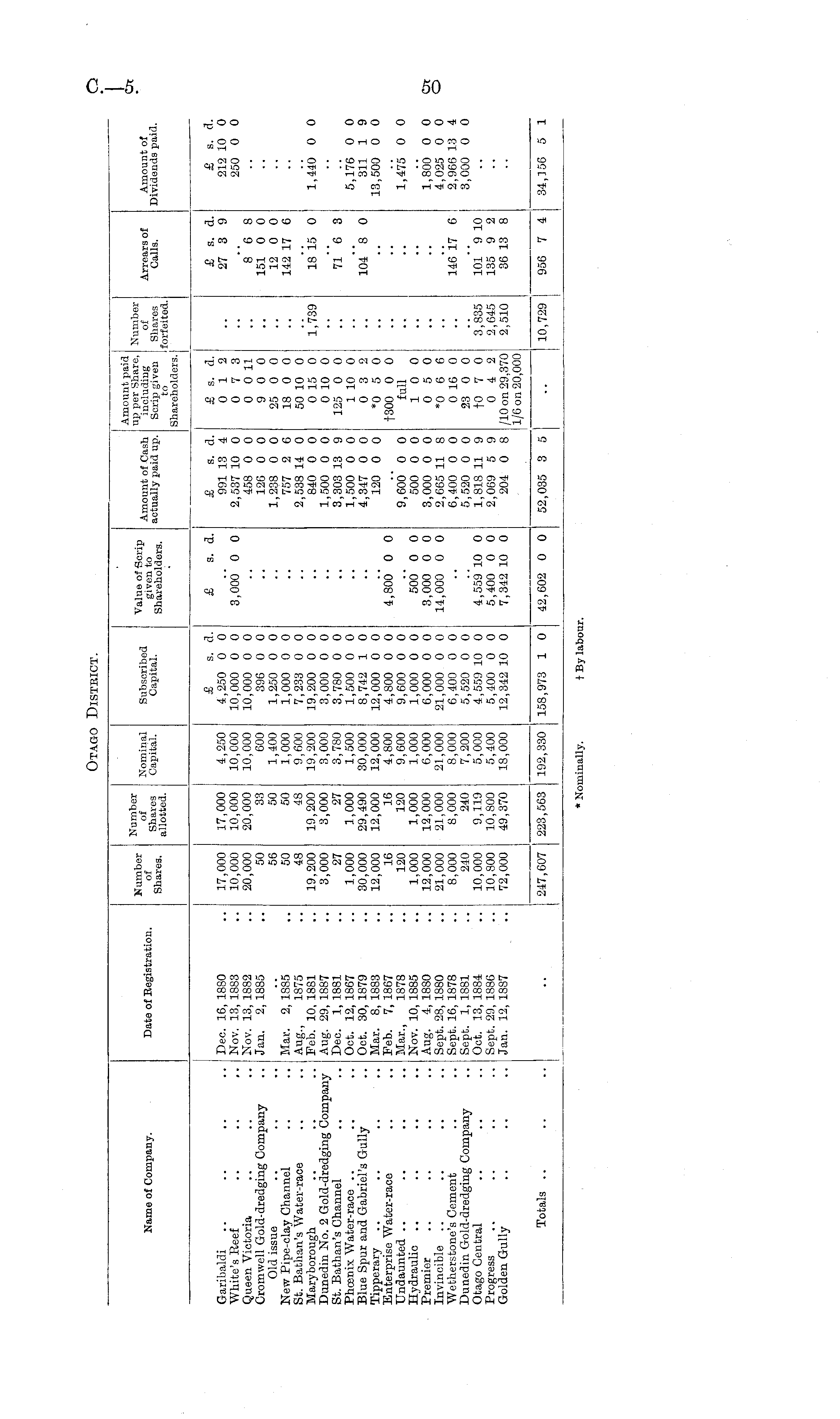 Name of Company. Date of Begistration. Number of Shares. Number of Shares allotted. Nominal Capital. Subscribed Capital. Amount paid V«lnBnf«imn up per Share, civento Amount of Cash including Shareholders. actually paid up. Scrip given to Shareholders. Number of Shares forfeited. Arrears of Calls. Amount of Dividends paid. Garibaldi White's Reef Queen Victoria Cromwell Gold-dredging Company Old issue New Pipe-clay Channel St. Bathan's Water-race Maryborough Dunedin No. 2 Gold-dredging Company St. Bathan's Channel Phcenix Water-race Blue Spur and Gabriel's Gully Tipperary Enterprise Water-race Undaunted Hydraulic Premier Invincible Wetherstone's Cement Dunedin Gold-dredging Company Otago Central Progress Golden Gully Dec. 16, 1880 Nov. 13, 1883 Nov. 13, 1882 Jan. 2, 1885 Mar. 2, 1885 Aug., 1875 Feb. 10, 1881 Aug. 29, 1887 Dec. 1, 1881 Oct. 12, 1867 Oct. 30, 1879 Mar. 8, 1883 Feb. 7, 1867 Mar., 1878 Nov. 10, 1885 Aug. 4, 1880 Sept. 28, 1880 Sept. 16,1878 Sept. 1, 1881 Oct. 13, 1884 Sept. 29, 1886 Jan. 12, 18S7 17,000 10,000 20,000 50 56 50 48 19,200 3,000 27 1,000 30,000 12,000 16 120 1,000 12,000 21,000 8,000 240 10,000 | 10,800 72,000 17,000 10,000 20,000 33 50 50 48 19,200 3,000 27 1,000 29,490 12,000 16 120 1,000 12,000 21,000 8,000 240 9,119 10,800 49,370 4,250 10,000 10,000 600 1,400 1,000 9,600 19,200 3,000 3,7S0 1,500 30,000 12,000 4,800 9,600 1,000 6,000 21,000 8,000 7,200 5,000 5,400 18,000 £ s. d. 4,250 0 0 10,000 0 0 10,000 0 0 396 0 0 1,250 0 0 1,000 0 0 7,233 0 0 19,200 0 0 3,000 0 0 3,780 0 0 1,500 0 0 8,742 1 0 12,000 0 0 4,800 0 0 9,600 0 0 1,000 0 0 6,000 0 0 21,000 0 0 6,400 0 0 5,520 0 0 4,559 10 0 5,400 0 0 12,342 10 0 £ s. d. 3,O06' 0 0 £ s. d. 991 13 4 2.537 10 0 458 0 0 126 0 0 1,238 0 0 757 2 6 2.538 14 0 840 0 0 1,500 0 0 3,303 13 9 1,500 0 0 4,347 0 0 120 0 0 £ s. d. 0 12 0 7 3 0 0 11 9 0 0 25 0 0 18 0 0 50 10 0 0 15 0 0 10 0 125 0 0 1 10 0 0 3 2 *0 5 0 t300 0 0 full 10 0 0 5 0 *0 6 6 0 16 0 23 0 0 t0 7 0 0 4 2 /10 on 29,370 1/6 on 20,000 1,739 £ s. d. 27 3 9 8 6 8 151 0 0 12 0 0 142 17 6 18 15 0 7l"6 3 104*'8 0 £ s. a 212 10 C 250 0 C 1,440 0 C 5,176 0 C 311 1 £ 13,500 0 C 4,800' 0 0 500 0 0 3,000 0 0 14,000 0 0 9,600 0 0 500 0 0 3,000 0 0 2,665 11 8 6,400 0 0 5,520 0 0 1,818 11 9 2,069 5 9 204 0 8 146*17 6 1,475 0 C 1,800 0 C 4,025 0 C 2,966 13 4 3,000 0 C 4,559 10 0 5,400 0 0 7,342 10 0 3,835 2,645 2,510 101 9 10 135 9 2 36 13 8 Totals ! I 34,156 5 ] 247,607 223,563 192,330 158,973 1 0 42,602 0 0 52,035 3 5 10,729 956 7 4 * Nominall; + B; labour.