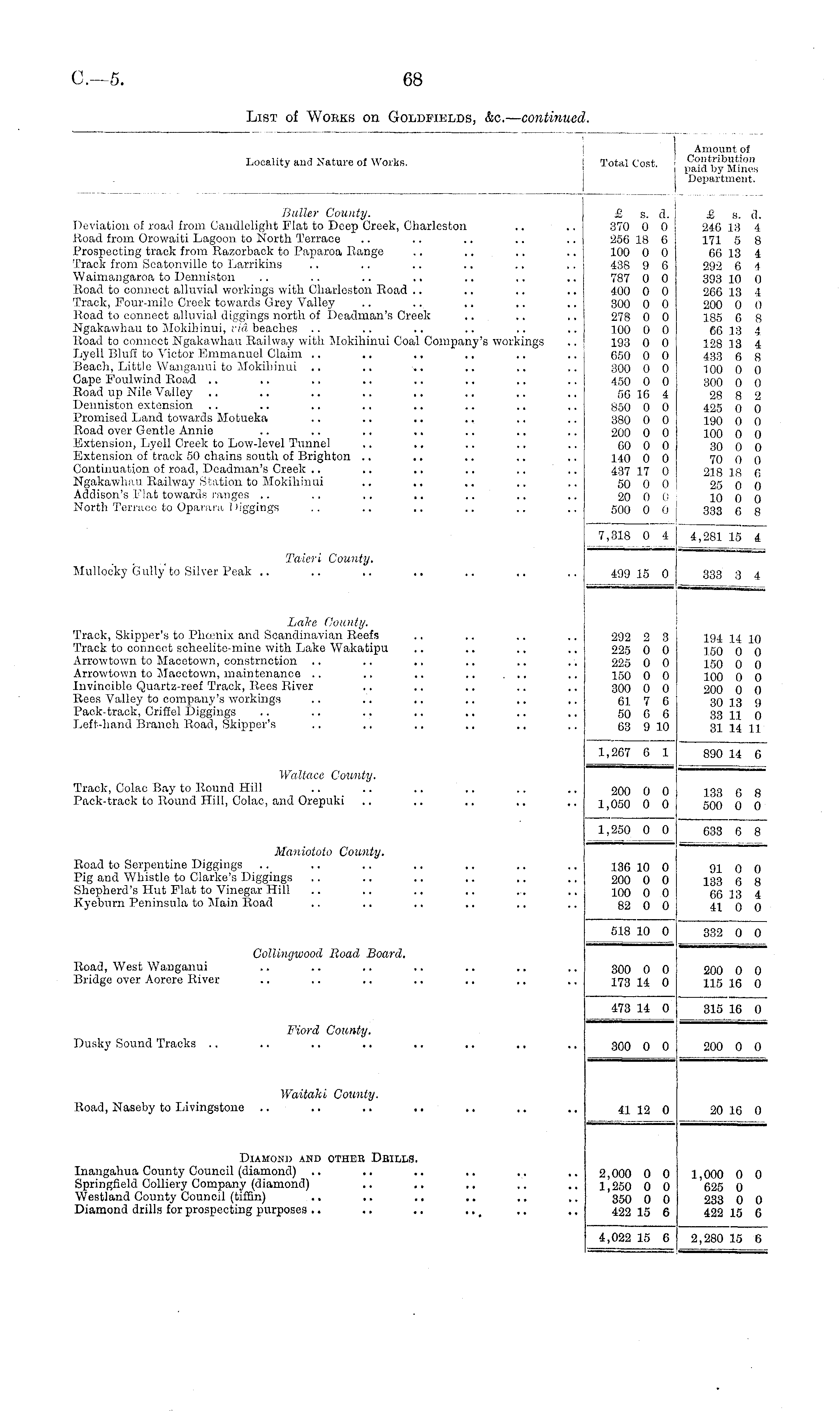 Locality and Nature of Works. Total Cost. Amount of Contribution paid by Mines Department. Butter County. Deviation of road from Candlelight Plat to Deep Creek, Charleston Road from. Orowaiti Lagoon to North Terrace Inspecting track from Razorback to Paparoa Range Track from Seatonville to Larrikins Waimangaroa to Denniston Road to connect alluvial workings with Charleston Road Track, Four-mile Creek towards Grey Valley Road to connect alluvial diggings north of Deadman's Creek Ngakawhau to Mokihinui, fin beaches Road to connect Ngakawhau Railway with Mokihinui Coal Company's workings Lyell Blufi to Victor Emmanuel Claim Beach, Little Wanganui to Mokihinui Cape Foulwind Road Road up Nile Valley Denniston extension Promised Land towards Motueka Road over Gentle Annie Extension, Lyell Creek to Low-level Tunnel Extension of track 50 chains south of Brighton Continuation of road, Deadman's Creek Ngakawliiiu Railway Station to Mokihinui Addison's Flat towards ranges North Terrace to Oparara Diggings £ s. a. 370 0 0 256 18 6 100 0 0 438 9 6 787 0 0 400 0 0 300 0 0 278 0 0 100 0 0 193 0 0 650 0 0 300 0 0 450 0 0 56 16 4 850 0 0 380 0 0 200 0 0 00 0 0 140 0 0 437 17 0 50 0 0 20 0 0 500 0 0 & s. d. 246 18 4 171 5 8 66 13 4 292 6 4 393 10 0 266 13 4 200 0 0 185 0 8 66 13 4 128 13 4 433 6 8 100 0 0 300 0 0 28 8 2 425 0 0 190 0 0 100 0 0 30 0 0 70 0 0 218 18 (■ 25 0 0 10 0 0 333 6 8 ! 7,318 0 4 ! 4,281 15 i Taieri County. Mulloc'ky Gully to Silver Peak .. 499 15 0 333 3 4 Lake County. Track, Skipper's to Phcenix and Scandinavian Reefs Track to connect scheelite-mine with Lake Wakatipu Arrowtown to Macetown, construction Arrowtown to Macetown, maintenance .. .. .. .. ... Invincible Quartz-reef Track, Rees River Rees Valley to company's workings Pack-track, Oriffel Diggings Left-hand Branch Road, Skipper's 292 2 3 225 0 0 225 0 0 150 0 0 300 0 0 61 7 6 50 6 6 63 9 10 194 14 10 150 0 0 150 0 0 100 0 0 200 0 0 30 13 9 33 11 0 31 14 11 Waltace County. 1,267 6 1 890 14 6 Track, Colac Bay to Round Hill Pack-track to Round Hill, Colac, and Orepuki 200 0 0 1,050 0 0 133 6 8 500 0 0 I 1,250 0 0 633 6 8 Maniototo County. Road to Serpentine Diggings Pig and Whistle to Clarke's Diggings Shepherd's Hut Flat to Vinegar Hill Kyeburn Peninsula to Main Road 130 10 0 200 0 0 100 0 0 82 0 0 91 0 0 133 0 8 66 13 4 41 0 0 Collingwood lload Board, 518 10 0 332 0 0 Road, West Wanganui Bridge over Aorere River 300 0 0 173 14 0 200 0 0 115 16 0 Fiord County. 473 14 0 315 1G 0 Dusky Sound Tracks 300 0 0 200 0 0 Waitaki County. Road, Naseby to Livingstone 41 12 0 20 16 0 Diamond and other Drills. Inangahua County Council (diamond) Springfield Colliery Company (diamond) Westland County Council (tiffin) Diamond drills for prospecting purposes .. .. .. .. > 2,000 0 0 1,250 0 0 350 0 0 422 15 6 1,000 0 0 625 0 233 0 0 422 15 6 4,022 15 6 2,280 15 6