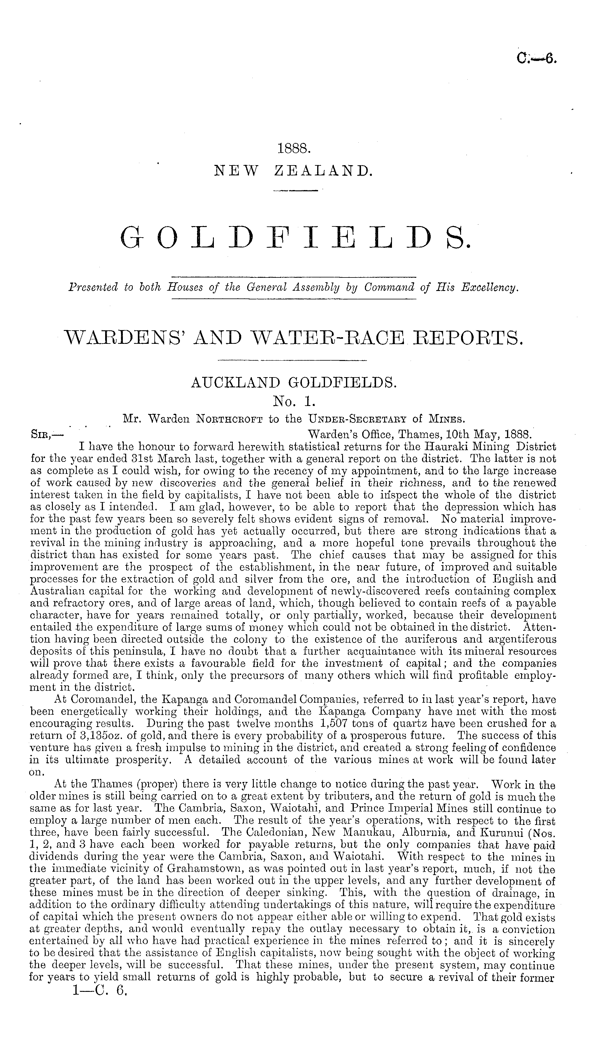AUCKLAND GOLDPIELDS. No. 1. Mr. Warden Nobthcroft to the Undeb-Seceetaby of Mines. Sib,— Warden's Office, Thames, 10th May, 1888. I have the honour to forward herewith statistical returns for the Hauraki Mining District for the year ended 31st March last, together with a general report on the district. The latter is not as complete as I could wish, for owing to the recency of my appointment, and to the large increase of work caused by new discoveries and the general belief in their richness, and to the renewed interest taken in the field by capitalists, I have not been able to inspect the whole of the district as closely as I intended. lam glad, however, to be able to report that the depression which has for the past few years been so severely felt shows evident signs of removal. No material improvement in the production of gold has yet actually occurred, but there are strong indications that a revival in the mining industry is approaching, and a more hopeful tone prevails throughout the district than has existed for some years past. The chief causes that may be assigned for this improvement are the prospect of the establishment, in the near future, of improved and suitable processes for the extraction of gold and silver from the ore, and the introduction of English and Australian capital for the working and development of newly-discovered reefs containing complex and refractory ores, and of large areas of land, which, though believed to contain reefs of a payable character, have for years remained totally, or only partially, worked, because their development entailed the expenditure of large sums of money which could not be obtained in the district. Attention having been directed outside the colony to the existence of the auriferous and argentiferous deposits of this peninsula, I have no doubt that a further acquaintance with its mineral resources will prove that there exists a favourable field for the investment of capital; and the companies already formed are, I think, only the precursors of many others which will find profitable employment in the district. At Coromandel, the Kapanga and Coromandel Companies, referred to in last year's report, have been energetically working their holdings, and the Kapanga Company have met with the most encouraging results. During the past twelve months 1,507 tons of quartz have been crushed for a return of 3,1350z. of gold, and there is every probability of a prosperous future. The success of this venture has given a fresh impulse to mining in the district, and created a strong feeling of confidence in its ultimate prosperity. A detailed account of the various mines at work will be found later on. At the Thames (proper) there is very little change to notice during the past year. Work in the older mines is still being carried on to a great extent by tributers, and the return of gold is much the same as for last year. The Cambria, Saxon, Waiotahi, and Prince Imperial Mines still continue to employ a large number of men each. The result of the year's operations, with respect to the first three, have been fairly successful. The Caledonian, New Manukau, Alburnia, and Kurunui (Nos. 1, 2, and 3 have each been worked for payable returns, but the only companies that have paid dividends during the year were the Cambria, Saxon, aud Waiotahi. With respect to the mines in the immediate vicinity of Grahamstown, as was pointed out in last year's report, much, if not the greater part, of the land has been worked out in the upper levels, and any further development of these mines must be in the direction of deeper sinking. This, with the question of drainage, in addition to the ordinary difficulty attending undertakings of this nature, will require the expenditure of capital which the present owners do not appear either able or willing to expend. That gold exists at greater depths, and would eventually repay the outlay necessary to obtain it, is a conviction entertained by all who have had practical experience in the mines referred to ; and. it is sincerely to be desired that the assistance of English capitalists, now being sought with the object of working the deeper levels, will be successful. That these mines, under the present system, may continue for years to yield small returns of gold is highly probable, but to secure a revival of their former I—C. 6.
