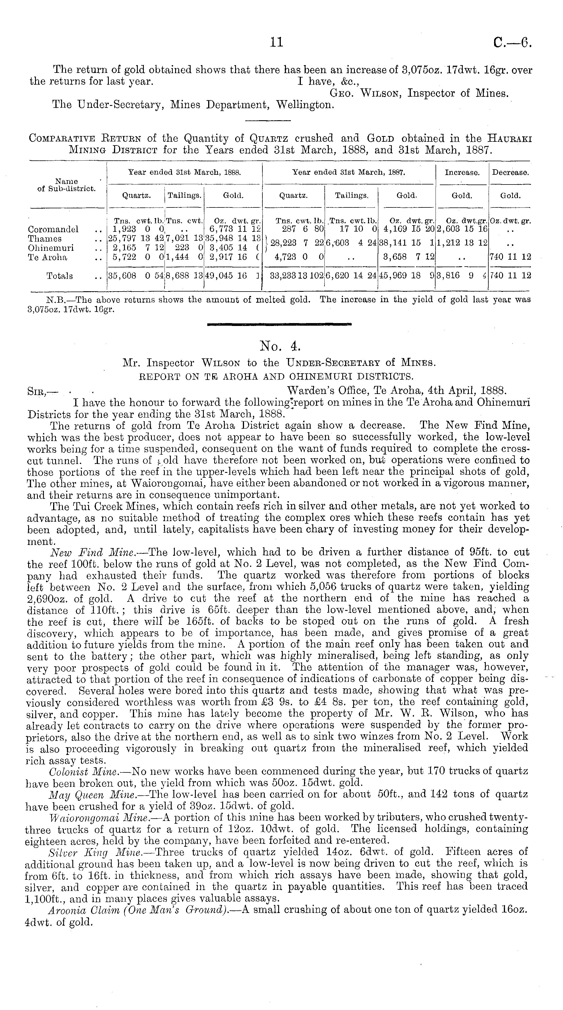 No. 4. Mr. Inspector Wilson to the Under-Sbcretary of Mines. REPORT ON Tffi AROHA AND OHINEMURI DISTRICTS. Sir,— • • Warden's Office, Te Aroha, 4th April, 1888. I have the honour to forward the following'report on mines in the Te Aroha and Ohinemuri Districts for the year ending the 31st March, 1888. The returns of gold from Te Aroha District again show a decrease. The New Find Mine, which was the best producer, does not appear to have been so successfully worked, the low-level works being for a time suspended, consequent on the want of funds required to complete the crosscut tunnel. The runs of j. old have therefore not been worked on, but operations were confined to those portions of the reef in the upper-levels which had been left near the principal shots of gold, The other mines, at Waiorongomai, have either been abandoned or not worked in a vigorous manner, and their returns are in consequence unimportant. The Tui Creek Mines, which contain reefs rich in silver and other metals, are not yet worked to advantage, as no suitable method of treating the complex ores which these reefs contain has yet been adopted, and, until lately, capitalists have been chary of investing money for their development. New Find Mine. —The low-level, which had to be driven a further distance of 95ft. to cut the reef 100 ft. below the runs of gold at No. 2 Level, was not completed, as the New Find Company had exhausted their funds. The quartz worked was therefore from portions of blocks left between No. 2 Level and the surface, from which 5,056 trucks of quartz were taken, yielding 2,6900z. of gold. A drive to cut the reef at the northern end of the mine has reached a distance of 110 ft. ; this drive is 65ft. deeper than the low-level mentioned above, and, when the reef is cut, there will be 165 ft. of backs to be stoped out on the runs of gold. A fresh discovery, which appears to be of importance, has been made, and gives promise of a great addition to future yields from the mine. A portion of the main reef only has been taken out and sent to the battery; the other part, which was highly mineralised, being left standing, as only very poor prospects of gold could be found in it. The attention of the manager was, however, attracted to that portion of the reef in consequence of indications of carbonate of copper being discovered. Several holes were bored into this quartz and tests made, showing that what was previously considered worthless was worth from £3 9s. to £4 Bs. per ton, the reef containing gold, silver, and copper. This mine has lately become the property of Mr. W. E. W rilson, who has already let contracts to carry on the drive where operations were suspended by the former proprietors, also the drive at the northern end, as well as to sink two winzes from No. 2 Level. W Tork is also proceeding vigorously in breaking out quartz from the mineralised reef, which yielded rich assay tests. Colonist Mine. —No new works have been commenced during the year, but 170 trucks of quartz have been broken out, the yield from which was 50oz. 15dwt. gold. May Quean Mine. —The low-level has been carried on for about 50ft., and 142 tons of quartz have been crushed for a yield of 390z. 15dwt. of gold. Waiorongomai Mine. —A portion of this mine has been worked by tributers, who crushed twentythree trucks of quartz for a return of 12oz. lOdwt. of gold. The licensed holdings, containing eighteen acres, held by the company, have been forfeited and re-entered. Silver King Mine. —Three trucks of quartz yielded 14oz. 6dwt. of gold. Fifteen acres of additional ground has been taken up, and a low-level is now being driven to cut the reof, which is from 6ft. to 16ft. in thickness, and from which rich assays have been made, showing that gold, silver, and copper are contained in the quartz in payable quantities. This reef has been traced 1,100 ft., and in many places gives valuable assays. Aroonia Claim (One Man's Ground). —A small crushing of about one ton of quartz yielded 16oz. 4dwt. of gold.