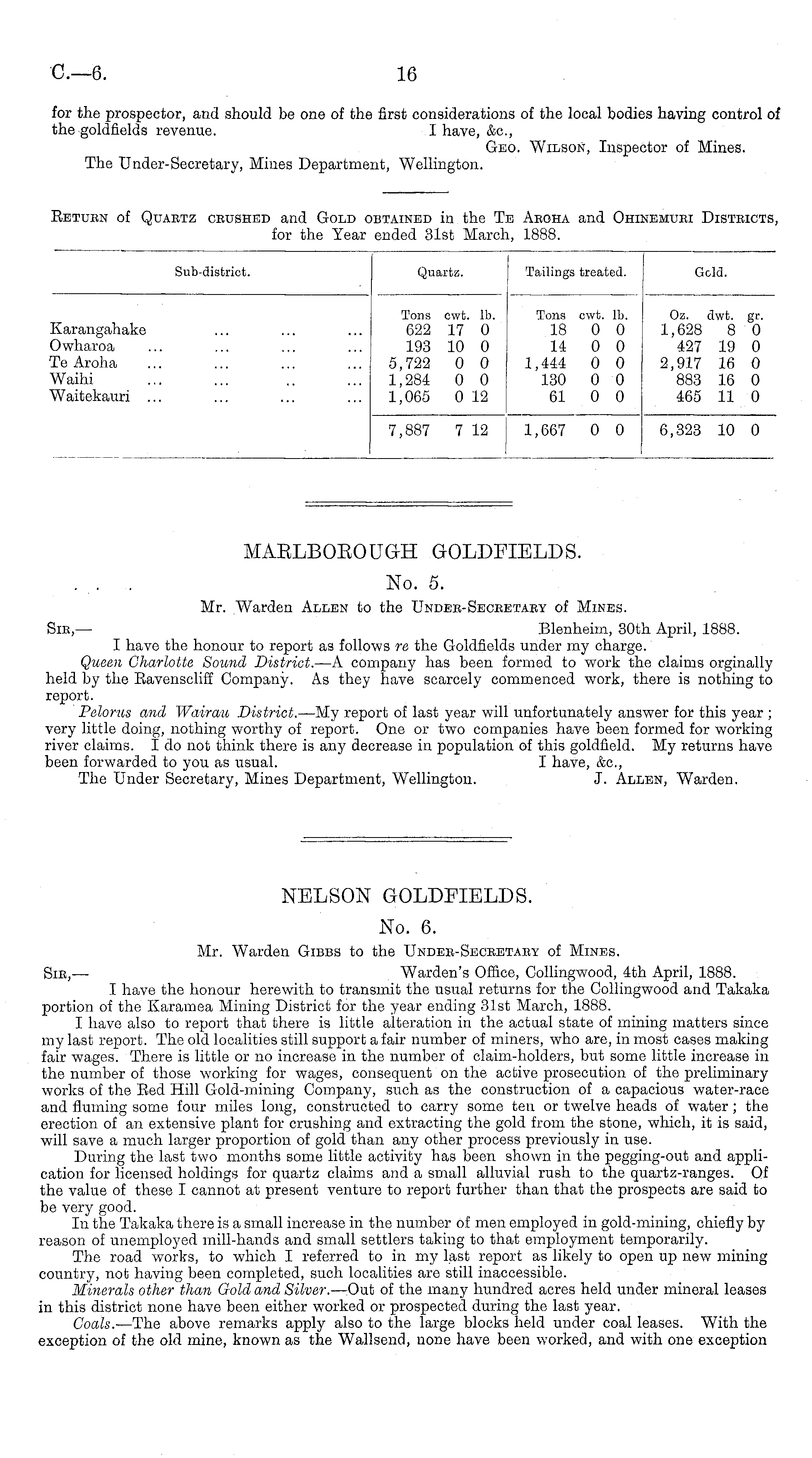 NELSON GOLDFIELDS. No. 6. Mr. Warden Gibbs to the Undek-Secbetaby of Mines. Sic, — Warden's Office, Oollingwood, 4th April, 1888. I have the honour herewith to transmit the usual returns for the Collingwood and Takaka portion of the Karamea Mining District for the year ending 31st March, 1888. I have also to report that there is little alteration in the actual state of mining matters since my last report. The old localities still support a fair number of miners, who are, in most cases making fair wages. There is little or no increase in the number of claim-holders, but some little increase in the number of those working for wages, consequent on the active prosecution of the preliminary works of the Red Hill Gold-mining Company, such as the construction of a capacious water-race and fluming some four miles long, constructed to carry some ten or twelve heads of water; the erection of an extensive plant for crushing and extracting the gold from the stone, which, it is said, will save a much larger proportion of gold than any other process previously in use. During the last two months some little activity has been shown in the pegging-out and application for licensed holdings for quartz claims and a small alluvial rush to the quartz-ranges. Of the value of these I cannot at present venture to report further than that the prospects are said to be very good. In the Takaka there is a small increase in the number of men employed in gold-mining, chiefly by reason of unemployed mill-hands and small settlers taking to that employment temporarily. The road works, to which I referred to in my last report as likely to open up new mining country, not having been completed, such localities are still inaccessible. Minerals other than Gold and Silver. —Out of the many hundred acres held under mineral leases in this district none have been either worked or prospected during the last year. Coals. —The above remarks apply also to the large blocks held under coal leases. With the exception of the old mine, known as the Wallsend, none have been worked, and with one exception