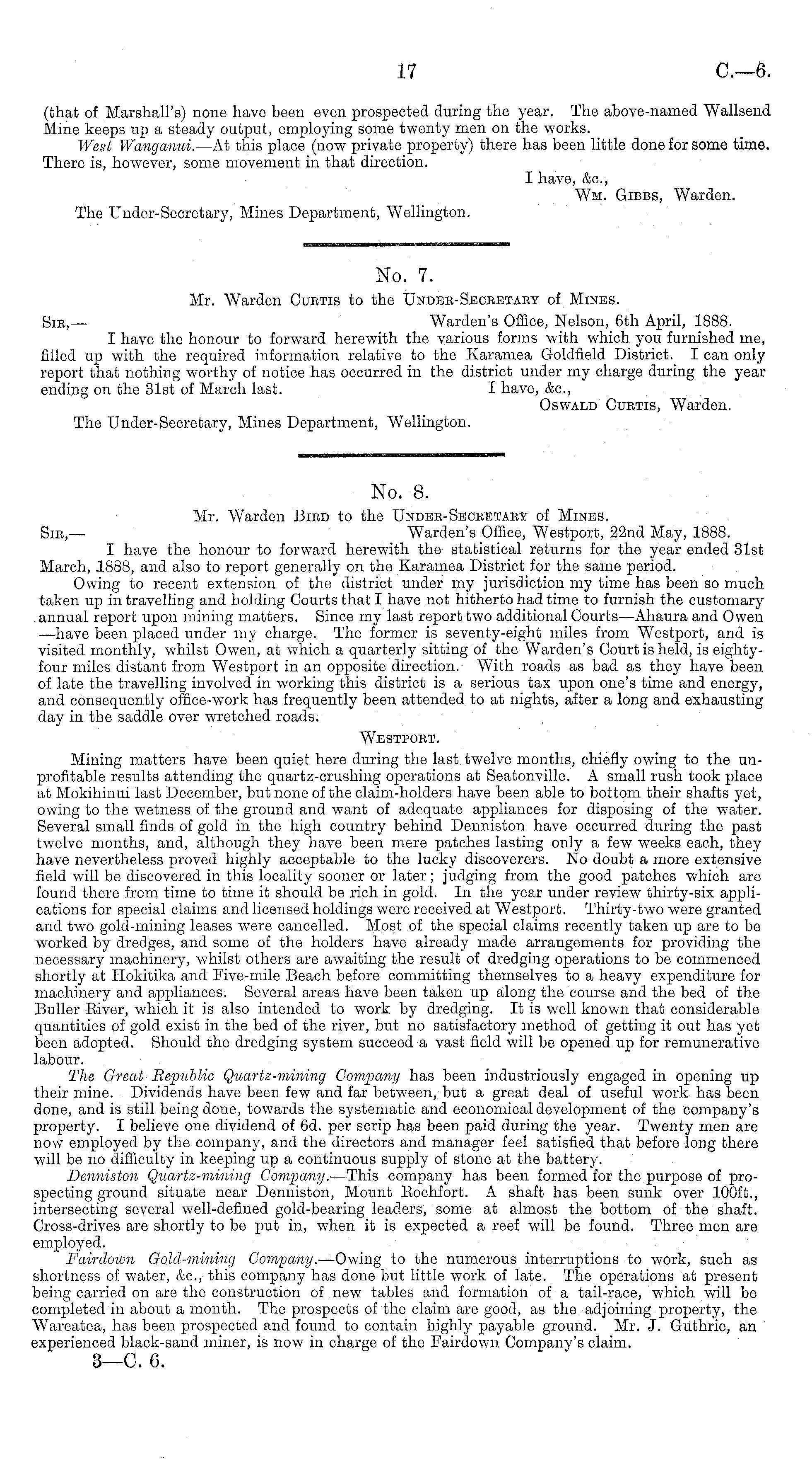 No. 7. Mr. Warden Cubtis to the Undeb-Seceetaky of Mines. Sib,—- Warden's Office, Nelson, 6th April, 1888. I have the honour to forward herewith the various forms with which you furnished me, filled up with the required information relative to the Karamea Goldfield District. I can only report that nothing worthy of notice has occurred in the district under my charge during the year ending on the 31st of March last. I have, &c, Oswald Cuetis, Warden. The Under-Secretary, Mines Department, Wellington.