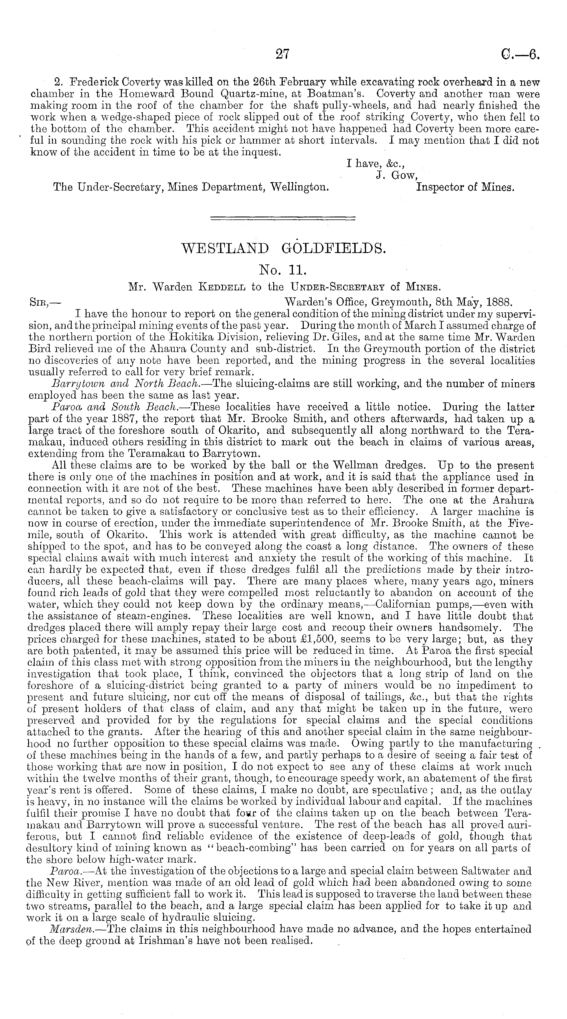 WESTLAND GOLDFIELDS. No. 11. Mr. Warden Keddell to the Undek-Secketaey of Mines. Sib,— Warden's Office, Greymouth, Bth May, 1888. I have the honour to report on the general condition of the mining district under my supervision, and the principal mining events of the past year. During the month of March I assumed charge of the northern portion of the Hokitika Division, relieving Dr. Giles, and at the same time Mr. Warden Bird relieved me of the Ahaura County and sub-district. In the Greymouth portion of the district no discoveries of any note have been reported, and the mining progress in the several localities usually referred to call for very brief remark. Barrytoivn and North Beach. —The sluicing-claims are still working, and the number of miners employed has been the same as last year. Paroa. and South Beach. —These localities have received a little notice. During the latter part of the year 1887, the report that Mr. Brooke Smith, and others afterwards, had taken up a large tract of the foreshore south of Okarito, and subsequently all along northward to the Teramakau, induced others residing in this district to mark out the beach in claims of various areas, extending from the Teramakau to Barrytown. All these claims are to be worked by the ball or the Wellman dredges. Up to the present there is only one of the machines in position and at work, and it is said that the appliance used in connection with it are not of the best. These machines have been ably described in former departmental reports, and so do not require to be more than referred to here. The one at the Arahura cannot be taken to give a satisfactory or conclusive test as to their efficiency. A larger machine is now in course of erection, under the immediate superintendence of Mr. Brooke Smith, at the Fivemile, south of Okarito. This work is attended with great difficulty, as the machine cannot bo shipped to the spot, and has to be conveyed along the coast a long distance. The owners of these special claims await with much interest and anxiety the result of the working of this machine. It can hardly be expected that, even if these dredges fulfil all the predictions made by their introducers, all these beach-claims will pay. There are many places where, many years ago, miners found rich leads of gold that they were compelled most reluctantly to abandon on account of the water, which they could not keep down by the ordinary means, —Californian pumps,—even with the assistance of steam-engines. These localities are well known, and I have little doubt that dredges placed there will amply repay their large cost and recoup their owners handsomely. The prices charged for these machines, stated to be about £1,500, seems to be very large; but, as they are both patented, it may be assumed this price will be reduced in time. At Paroa the first special claim of this class met with strong opposition from the miners in the neighbourhood, but the lengthy investigation that took place, I think, convinced the objectors that a long strip of land on the foreshore of a sluicing-district being granted to a party of miners would be no impediment to present and future sluicing, nor cut off the means of disposal of tailings, &c, but that the rights of present holders of that class of claim, and any that might be taken up in the future, were preserved and provided for by the regulations for special claims and the special conditions attached to the grants. After the hearing of this and another special claim in the same neighbourhood no further opposition to these special claims was made. Owing partly to the manufacturing of these machines being in the hands of a few, and partly perhaps to a desire of seeing a fair test of those working that are now in position, I do not expect to see any of these claims at work much within the twelve months of their grant, though, to encourage speedy work, an abatement of the first year's rent is offered. Some of these claims, I make no doubt, are speculative ; and, as the outlay is heavy, in no instance will the claims be wrorked by individual labour and capital. If the machines fulfil their promise I have no doubt that four of the claims taken up on the beach between Teramakau and Barrytown will prove a successful venture. The rest of the beach has all proved auriferous, but I cannot find reliable evidence of the existence of deep-leads of gold, though that desultory kind of mining known as " beach-combing" has been carried on for years on all parts of the shore below high-water mark. Paroa. —At the investigation of the objections to a large and special claim between Saltwater and the New River, mention was made of an old lead of gold which had been abandoned owing to some difficulty in getting sufficient fall to work it. This lead is supposed to traverse the land between these two streams, parallel to the beach, and a large special claim has been applied for to take it up and work it on a large scale of hydraulic sluicing. Marsden. —The claims in this neighbourhood have made no adv-ance, and the hopes entertained of the deep ground at Irishman's have not been realised.