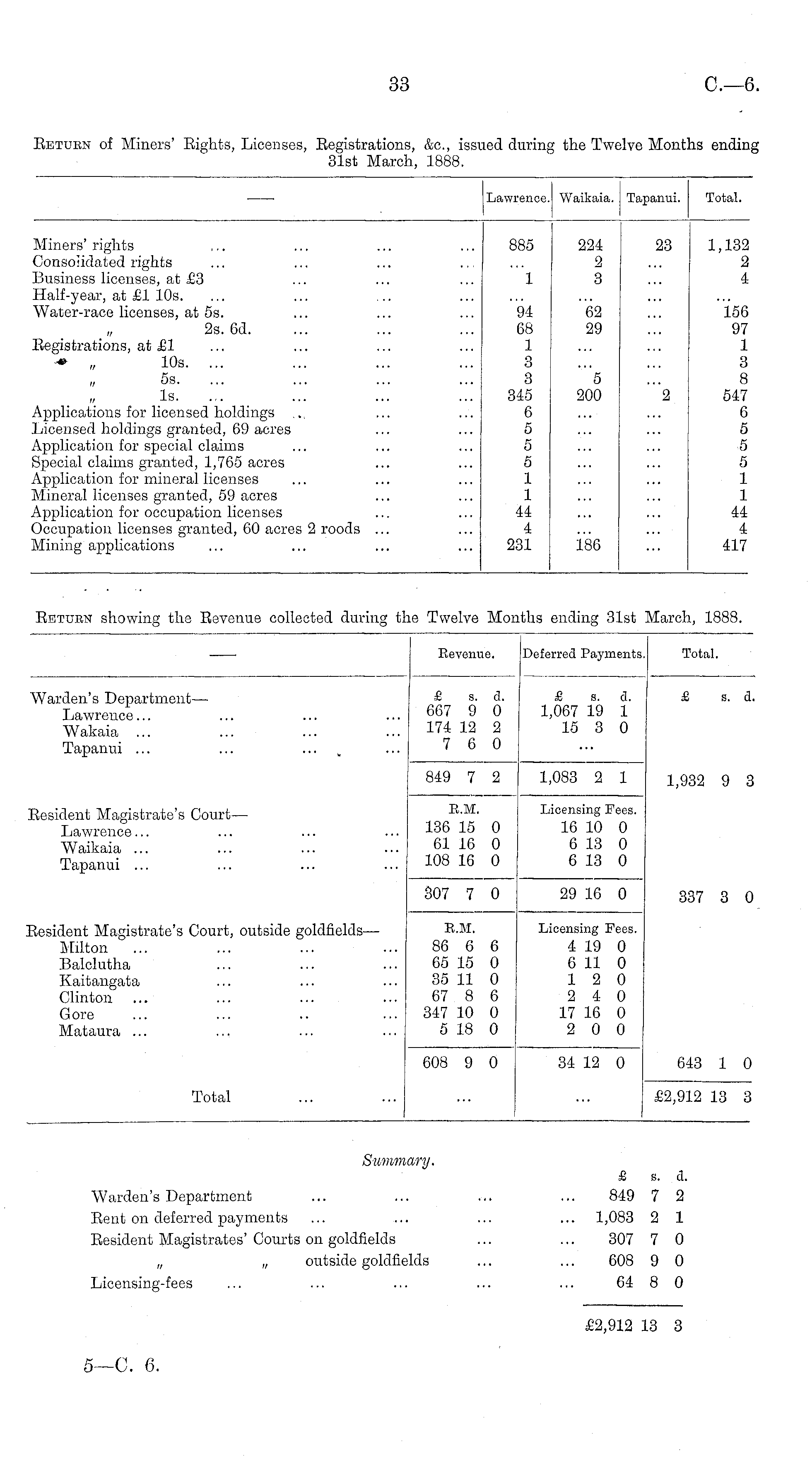 Revenue. Deferred Payments Total. Warden's Department— Lawrence... Wakaia ... Tapantii ... ... ... & s. 667 9 174 12 7 6 d. 0 2 0 £ s. 1,067 19 15 3 a. l o £ s. a. Eesident Magistrate's Court — Lawrence... "Waikaia ... Tapanui ... 849 7 2 1,083 2 1 1,932 9 3 R.M. 136 15 61 16 108 16 0 0 0 Licensing Fees. 16 10 0 6 13 0 6 13 0 337 3 0 307 7 0 29 16 0 Resident Magistrate's Court, outside goldfields— Milton Balclutha Kaitangata Clinton Gore Mataura ... R.M. 86 6 65 15 35 11 67 8 347 10 5 18 6 0 0 6 0 0 Licensing Fees. 4 19 0 6 11 0 12 0 2 4 0 17 16 0 2 0 0 608 9 0 34 12 0 643 1 0 Total £2,912 13 3