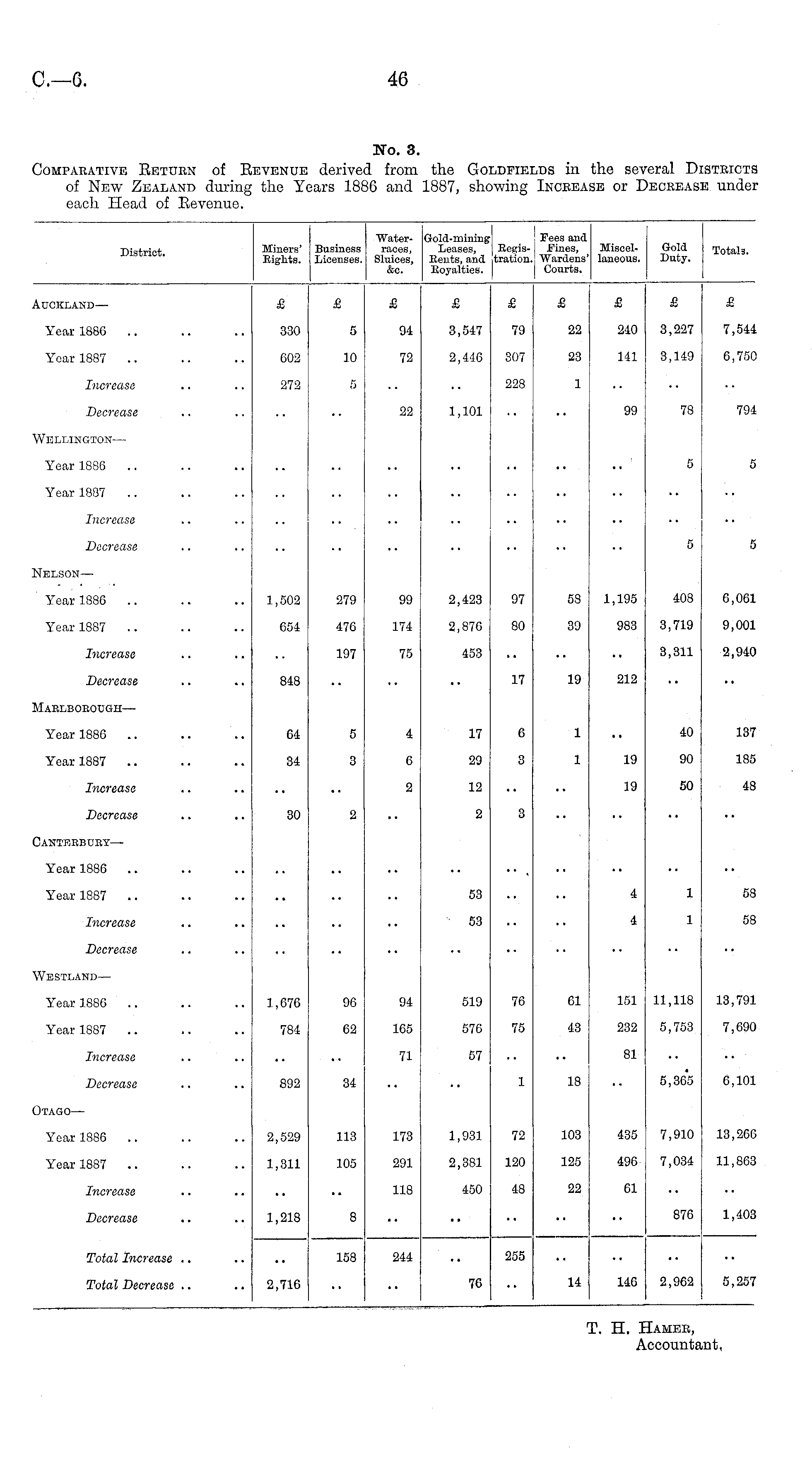 No. 3. Comparative Return of Revenue derived from the Goldfields in the several Districts of New Zealand during the Years 1886 and 1887, showing Increase or Decrease under each Head of Revenue.