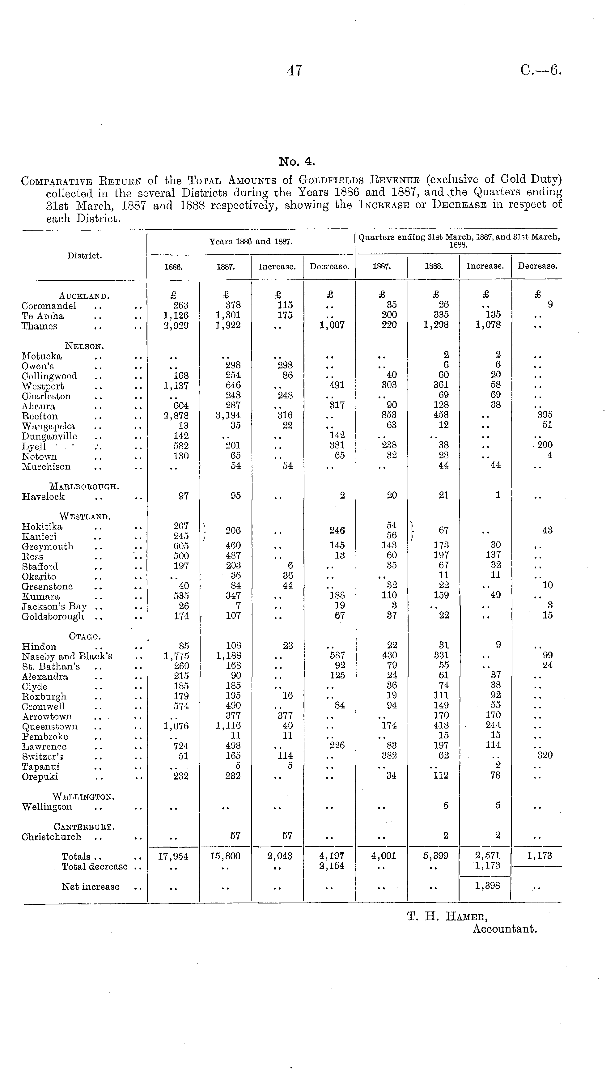 No. 4. Comparative Return of the Total Amounts of Goldfields Revenue (exclusive of Gold Duty) collected in the several Districts during the Years 1886 and 1887, and the Quarters ending 31st March, 1887 and 1888 respectively, showing the Increase or Decrease in respect of each District.