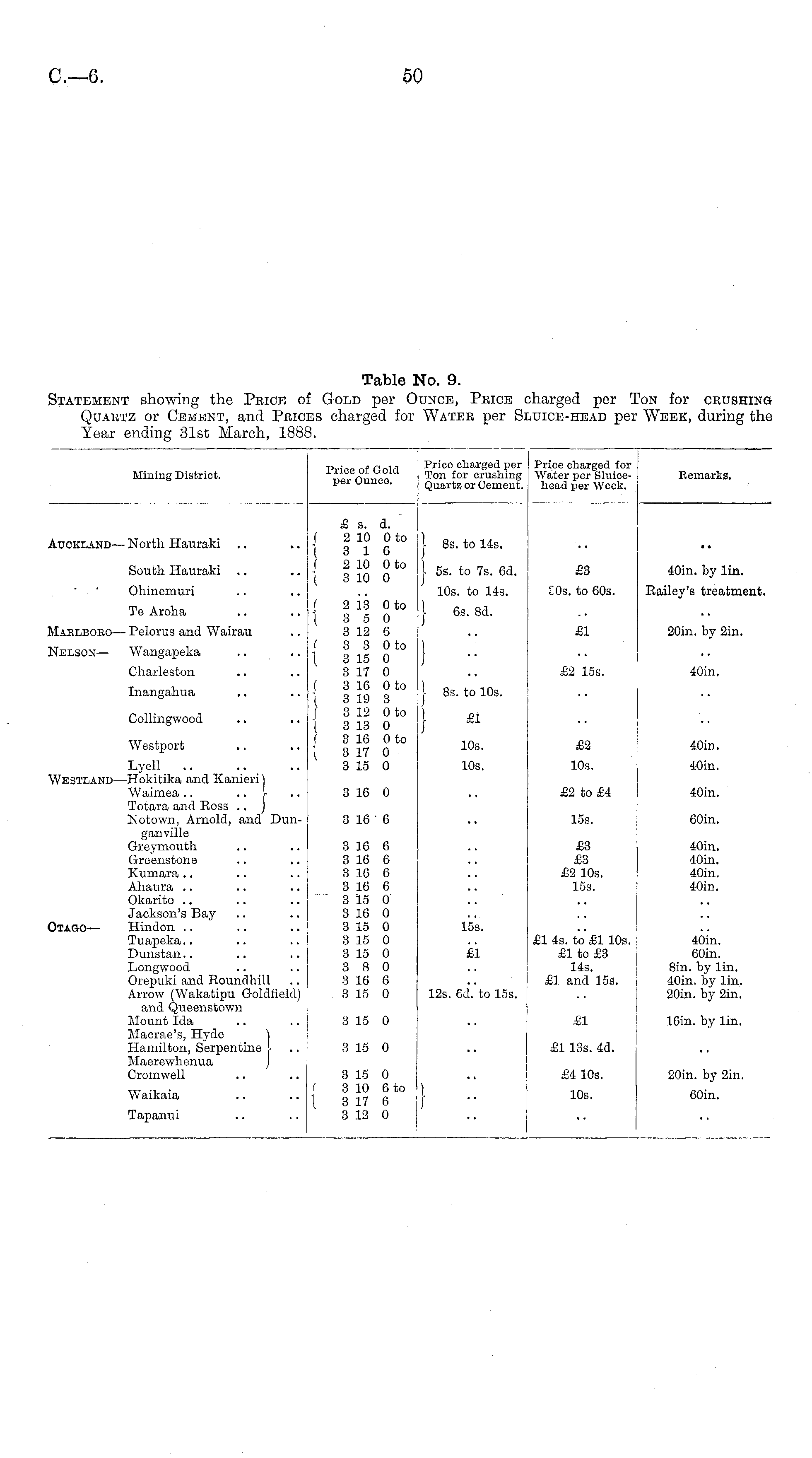 Table No. 9. Statement showing the Price of Gold per Ounce, Price charged per Ton for crushing Quartz or Cement, and Prices charged for Water per Sluice-head per Week, during the Year ending 31st March, 1888.