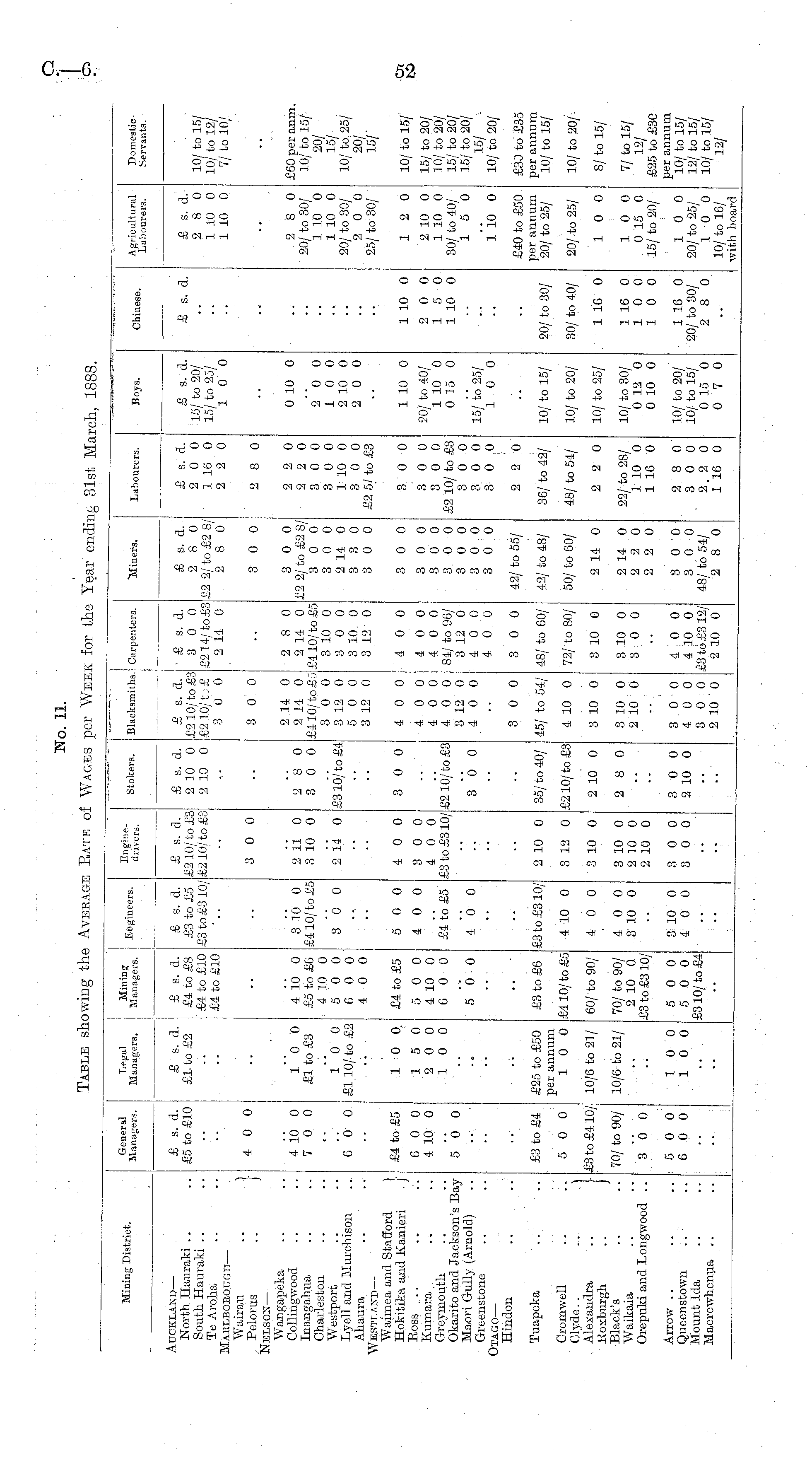 Mining District. General Managers. Legal Managers, Mining Managers. Engineers. Enginedrivers. Stokers. Blacksmiths. Carpenters. "Miners. Bnys. Chinese. Agricultural Labourers. Domestic Servants. Labourers. North Hauraki South Ham-alri .. Te Aroha Maklb oeo.u g h— Wairau .. | Pelorns .. | Wangapoka Collingwood Inangahua Charleston Westport Lj'ell and Murchison Ahaura Westland — Waimea and Stafford ) Hokitika and Kanieri j Boss ,.. Kumara Greymoutli Okarito and Jackson's Bay Maori Gully (Arnold) Greenstone Otago — Hmdon £ s. d. £5 to £10 4 0 0 4 10 0 7 0 0 G "6 0 £ s. d. a. to s& i"o o £1 to £3 i"o o £1 10/ to £2 £ s. d. £4 to £8 £4 to £10 £4 to £10 4 10 0 £5 to £6 4 10 0 5 0 0 6 0 0 4 0 0 £ s. d. £3 to £5 £3 to £310/ 3 10 0 £410/ to £5 3 '6 0 £ s. d. £210/ to £3 £2 10/ to £3 3 0 0 2 11 0 3 10 0 2 14 0 £ s. d. i 2 10 0 i 2 10 0 2 8 0 3 0 0 £310/ to £4 £ s. d. £2 10/ to £3 £210/tj£ 3 0 0 3 0 0 2 14 0 2 14 0 £410/ to £5 3 0 0! 3 12 0 I 5 0 0 3 12 0 j £ s. a. 5 3 0 0 £214/ to £3 2 14 0 2 8 0 2 14 0 '£4 10/ to £5 ! 3 10 0 3 0 0 3 10 0 3 12 0 £ s. d. 2 8 0 £2 2/ to £2 8/ 2 8 0 3 0 0 3 0 0 £2 2/ to £2 8/ 3 0 0 3 0 0 2 14 0 i 3 3 0 I 3 0 0 I £ s. d. 2 0 0 1 16 0 2 2 0 2 8 0 2 2 0 2 2 0 3 0 0 3 0 0 1 10 0 3 0 0 £2 5/ to £3 £ s. d. 15/ to 20/ 15/ to 25/ 10 0 0 10 0 2 0 0 10 0 2 10 0 2 0 0 £ s. d. £ s. d. 2 8 0 1 10 0 1 10 0 2 8 0 20/ to 30/ 1 10 0 1 10 0 20/ to 30/ 2 0 0 25/ to 30/ 10/ to 15/ 10/ to 12/ 7/ to 10/ £60 per mm, 10/ to 15/ 20/ 15/ 10/ to 25/ '20/ 15/ - •• £4 to £5 10 0 I £4 to £5 5 0 0 4 0 0 3 0 0 4 0 0 4 0 0 3 0 0 3 0 0 3 0 0 3 0 0 £2 10/ to £3 3 0 0 3 0 0 3 0 0 1 10 0 1 10 0 12 0 10/ to 15/ 6 0 0 4 10 0 15 0 2 0 0 10 0 i 5 0 0 4 10 0 6 0 0 4 0 0 3 0 0 4 0 0 £3 to £310/; 4 0 0 4 0 0 4 0 0 3 12 0 4 0 0 4 0 0 4 0 0 84/ to 96/ I 3 12 0 4 0 0 4 0 0 3 0 0 3 0 0 3 0 0 3 0 0 3 0 0 3 0 0 20/ to 40/ 1 10 0 0 15 0 2 0 0 15 0 1 10 0 2 10 0 1 10 0 30/ to 40/ 15 0 15/ to 20/ 10/ to 20/ 15/ to 20/ 15/ to 20/ 15/ ■. 10/ to 20/ 5 0 0 £4 to £5 5 '6 0 14-00 3 '6 0 15/ to 25/ 10 0 1 10 0 3 0 0 3 0 0 42/ to 55/ 2 2 0 £40 to £50 per annum 20/ to 25/ £30 to £35 per annum 10/ to 15/ Tuapeka £3 to £4 £25 to £50 per annum 10 0 £3 to £6 £3 to £310/ 2 10 0 35/ to 40/ 45/ to 54/ 48/ to 60/ 42/ to 48/ 36/ to 42/ 10/ to 15/ 20/ to 30/ Cromwell Clyde.. ... \ Alexandra .. I Koxburgli .. j Black's Waikaia Orepuki and Longwood .. 5 0 0 £410/ to £5 4 10 0 3 12 0 i £210/ to £3 4 10 0 72/ to 80/ | 50/ to 60/ j 48/ to 54/ 10/ to 20/ 30/ to 40/ 20/ to 25/ 10/ to 20/'£3 to £410/ 10/6 to 21/ 60/ to 90/ 4 0 0 3 10 0 2 10 0 3 10 0 3 10 0 2 14 0 2 2 0 10/ to 25/ 1 16 0 10 0 8/ to 15/ 70/ to 90/ 10/0 to 21/ 70/ to 90/ 2 10 0 £3 to £310/ 4 0 0 3 10 0 3 10 0 2 10 0 2 10 0 2 8 0 3 10 0 2 10 0 3 10 0 3 0 0 2 14 0 2 2 0 2 2 0 22/ to 28/ 1 10 0 1 16 0 10/ to 30/ 0 12 0 0 10 0 1 16 0 10 0 10 0 10 0 0 15 0 15/ to 20/ 7/ to 15/ 12/ £25 to £30 per annum 10/ to 15/ 12/ to 15/ 10/ to 15/ 12/ 3 0 0 Arrow .. Queenstown Mount Ida Maerewhenua 5 0 0 6 0 0 i o o ! 10 0 5 0 0 5 0 0 £310/ to £4 3 10 0 4 0 0 3 0 0 3 0 0 3 0 0 2 10 0 3 0 0 4 0 0 3 0 0, 2 10 0 4 0 0 4 10 0 £3 to £312/ 2 10 0 3 0 0 3 0 0 48/ to 54/ 2 8 0 2 8 0 3 0 0 2.2 0 1 16 0 10/ to 20/ 10/ to 15/ 0 15 0 0 7 0 1 16 0 20/ to 30/ 2 8 0 10 0 20/ to 25/ 10 0 10/ to 16/ with board ■■ •• .. •■ ■-