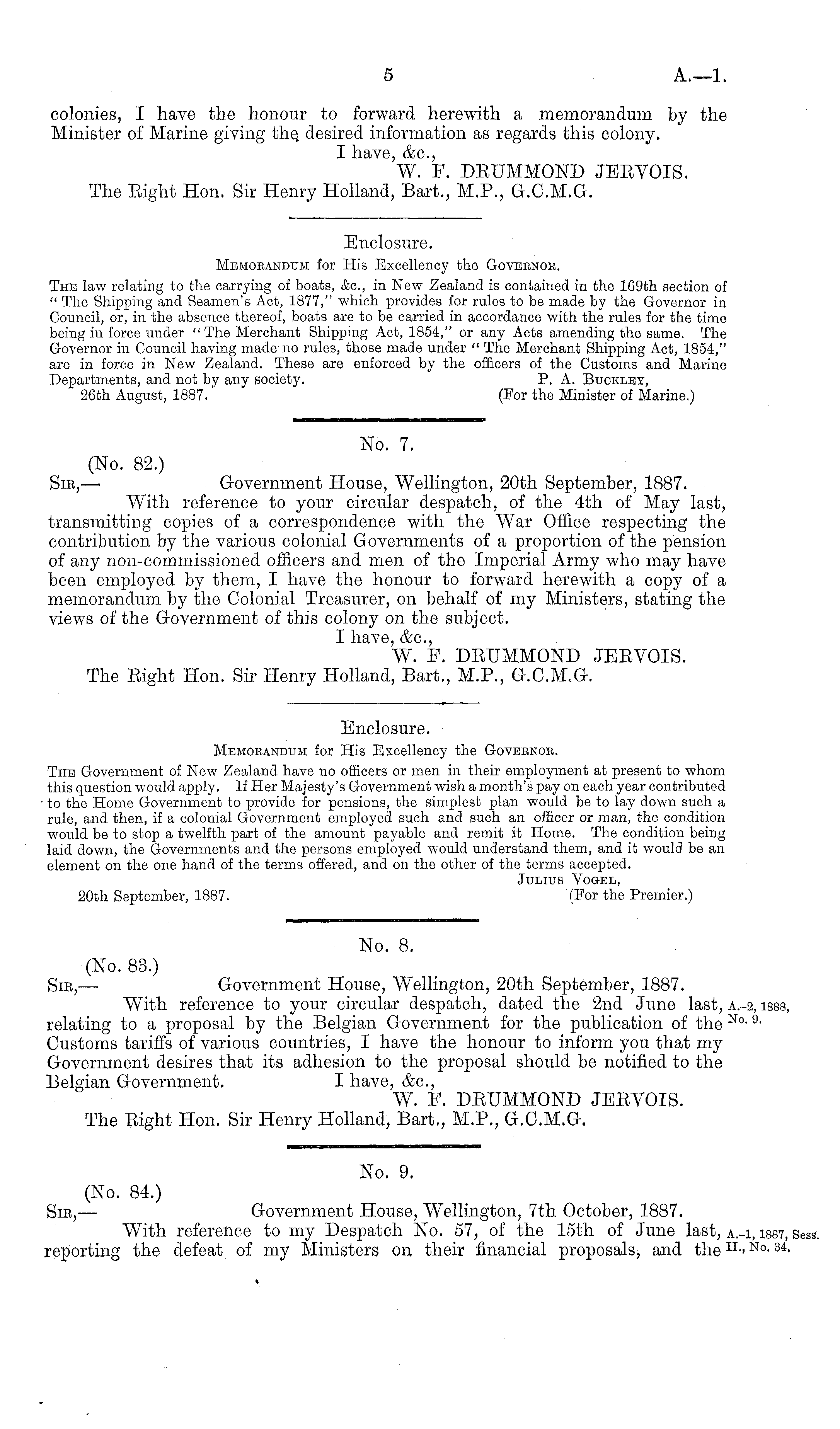 Enclosure. Memorandum for His Excellency the Goveknob. The Government of New Zealand have no officers or men in their employment at present to whom this question would apply. If Her Majesty's Government wish a month's pay on each year contributed to the Home Government to provide for pensions, the simplest plan would be to lay down such a rule, and then, if a colonial Government employed such and such an officer or man, the condition would be to stop a twelfth part of the amount payable and remit it Home. The condition being laid down, the Governments and the persons employed would understand them, and it would be an element on the one hand of the terms offered, and on the other of the terms accepted. Julius Vogel, 20th September, 1887. (For the Premier.)