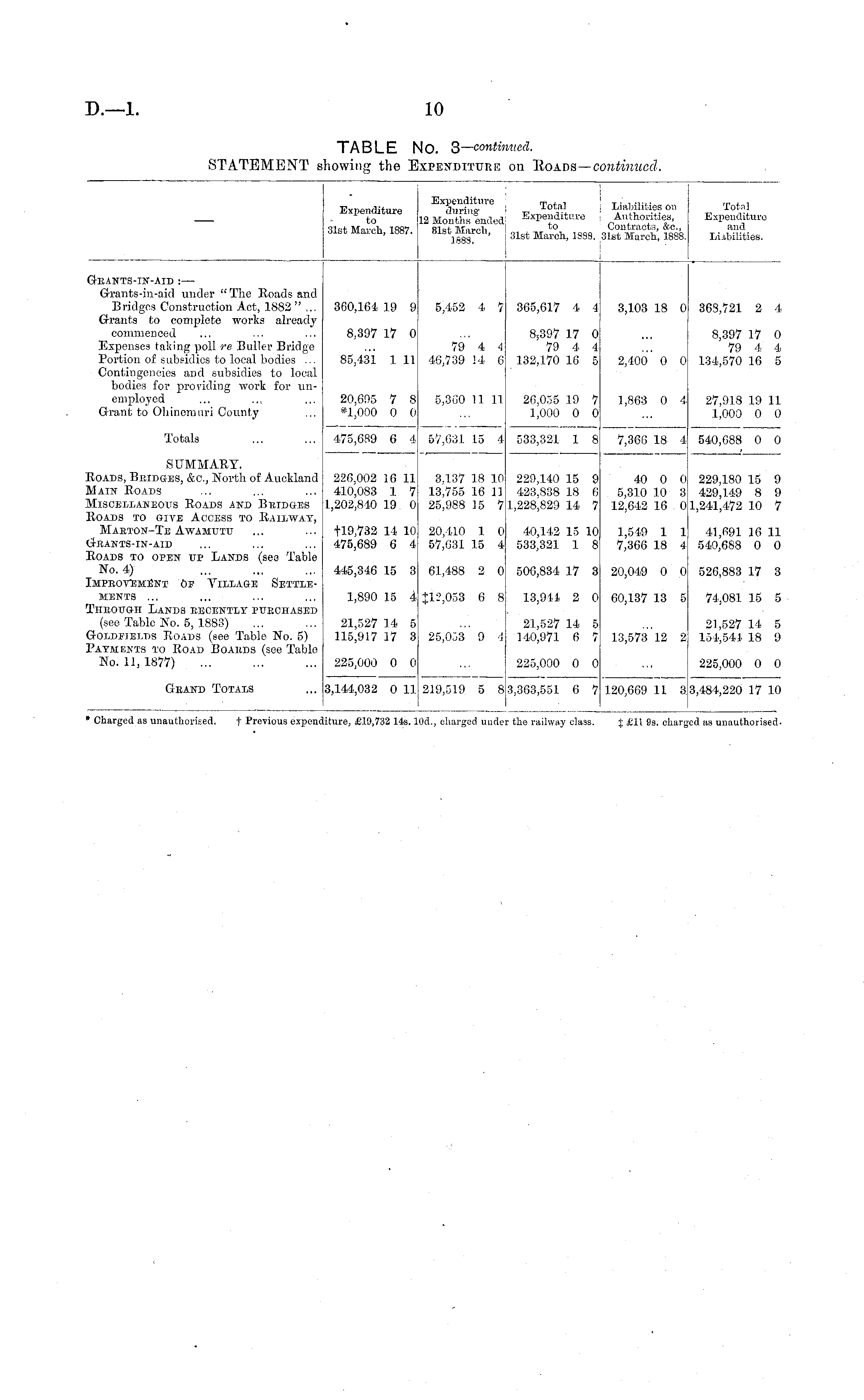 Expenditure Tntol Expenditure : during tv™?,*/*,---. to 12 Months ended 31st Marcn, 1887. "arch, 31st Mo £ hj 1888 , Liabilities o;i Authorities, Contracts, &c, 31st March, 1888. Total tnditure and Liabilities. GrEANTS-IN-AID : — Grants-in-aid under " Tlie Roads and Bridges Construction Act, 1882" ... Grants to complete works already commenced Expenses taking poll re Buller Bridge Portion of subsidies to local bodies ... Contingencies and subsidies to local bodies for pro riding work for unemployed Grant to Ohincrouri County 360,164 19 9 8,397 17 0 85,431 1 11 5,152 4 7 79 4 4 46,739 !4 6 365,617 4 4 8,397 17 0 ' 79 4 4 132,170 16 5 3,103 18 0 2,400 0 0 368,721 2 4 8,397 17 0 79 4 4 134,570 16 5 20,695 7 8 *l,000 0 0 5,360 11 II 26,035 19 7 1,000 0 0 1,863 0 4 27,918 19 11 1,000 0 0 Totals 475,689 6 4 57,631 L5 4 533,321 1 8 7,366 18 4 540,688 0 0 SUMMARY. Roads, Bridges, &c, North of Auckland Main Roads Miscellaneous Roads and Bbid&es Koads to give Access to Railway, Marton-Te Awamutu Gtrants-in-aid Roads to open up Lands (see Table No. 4) Improvement of Village Settle226,002 16 11 410,083 1 7 1,202,840 19 0 •j-19.732 14 10 475,689 6 4 3.137 18 10 13,755 16 11 25,988 15 7 20,410 1 0 57,031 15 4 229,140 15 9 423,838 18 6 1,228,829 14 7 40,142 15 10 533,321 1 8 40 0 (I 5,310 10 3 12,642 16 0 1,549 1 1 7,366 18 4 229,180 15 9 429,149 8 9 1,241,472 10 7 41,fi91 16 11 540,688 0 0 445,346 15 3 61,488 2 0 506,834 17 3 20,049 0 0 520,883 17 3 ments ... Thkottgh Lands eecently purchased (see Table No. 5, 188S) Goldeields Roads (see Table No. 5) Payments to Road Boahds (see Table No. 11, 1877) 1,890 15 4 {12,053 (i 8 13,914 2 0 60,137 13 5 74,081 15 5 21,527 14 5 115,917 17 3 25,053 9 4 21,527 14 5 140,971 6 7 ... 13,573 12 2 21,527 14 5 154,541 18 9 225,000 0 0 225,000 0 0 225,000 0 0 Gband Totals 3,144,032 0 11 219,519 5 8 3,363,551 6 7 3,484,220 17 10 120,669 11 3 Charged as unauthorised. f Previous expenditure, £19,732 14s. 10d., charged unde: the railway class. % £11 9s. charged us unauthorised-