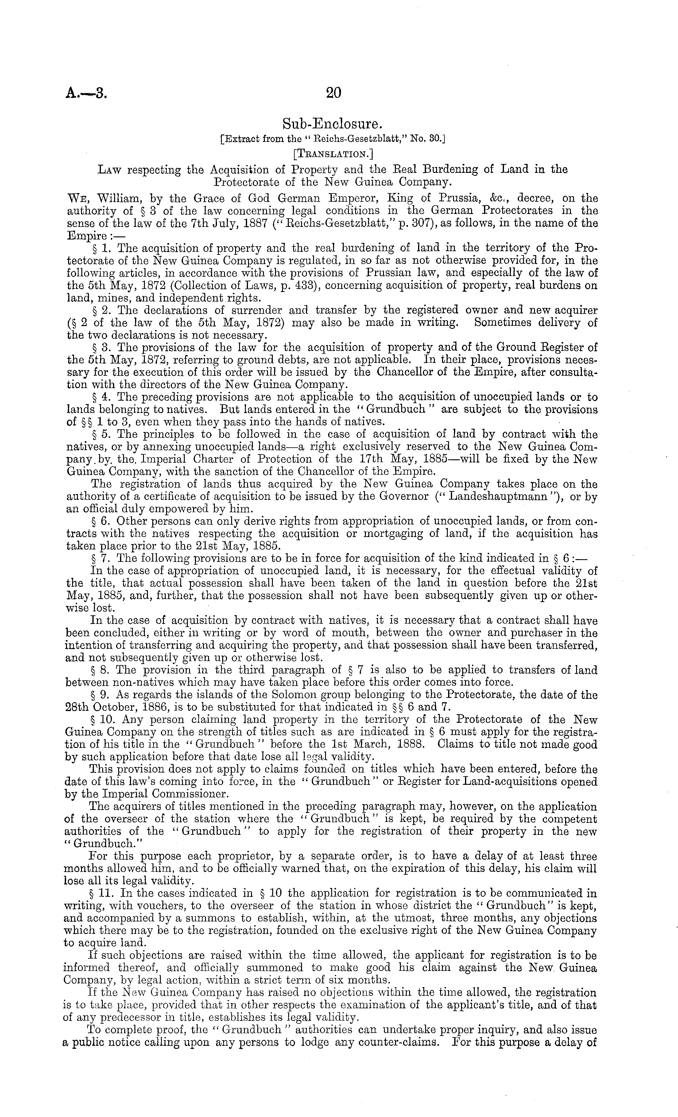 Sub-Enclosure. [Extract from the " Eeichs-Gesetzblatt," No. 30.] [Tbanslation.] Law respecting the Acquisition of Property and the Eeal Burdening of Land in the Protectorate of the New Guinea Company. We, William, by the Grace of God German Emperor, King of Prussia, &c, decree, on the authority of § 3 of the law concerning legal conditions in the German Protectorates in the sense of the law of the 7th July, 1887 (" Eeichs-Gesetzblatt," p. 307), as follows, in the name of the Empire : — § 1. The acquisition of property and the real burdening of land in the territory of the Protectorate of the New Guinea Company is regulated, in so far as not otherwise provided for, in the following articles, in accordance with the provisions of Prussian law, and especially of the law of the sth May, 1872 (Collection of Laws, p. 433), concerning acquisition of property, real burdens on land, mines, and independent rights. § 2. The declarations of surrender and transfer by the registered owner and new acquirer (§ 2of the law of the sth May, 1872) may also be made in writing. Sometimes delivery of the two declarations is not necessary. § 3. The provisions of the law for the acquisition of property and of the Ground Register of the sth May, 1872, referring to ground debts, are not applicable. In their place, provisions necessary for the execution of this order will be issued by the Chancellor of the Empire, after consultation with the directors of the New Guinea Company. § 4. The preceding provisions are not applicable to the acquisition of unoccupied lands or to lands belonging to natives. But lands entered in the " Grundbuch " are subject to the provisions of §§ 1 to 3, even when they pass into the hands of natives. § 5. The principles to be followed in the case of acquisition of land by contract with the natives, or by annexing unoccupied lands—a right exclusively reserved to the New Guinea Company, by. the. Imperial Charter of Protection of the 17th May, 1885—will be fixed by the New Guinea Company, with the sanction of the Chancellor of the Empire. The registration of lands thus acquired by the New Guinea Company takes place on the authority of a certificate of acquisition to be issued by the Governor (" Landeshauptmann "), or by an official duly empowered by him. § 6. Other persons can only derive rights from appropriation of unoccupied lands, or from contracts with the natives respecting the acquisition or mortgaging of land, if the acquisition has taken place prior to the 21st May, 1885. § 7. The following provisions are to be in force for acquisition of the kind indicated in § 6:— In the case of appropriation of unoccupied land, it is necessary, for the effectual validity of the title, that actual possession shall have been taken of the land in question before the 21st May, 1885, and, further, that the possession shall not have been subsequently given up or otherwise lost. In the case of acquisition by contract with natives, it is necessary that a contract shall have been concluded, either in writing or by word of mouth, between the owner and purchaser in the intention of transferring and acquiring the property, and that possession shall have been transferred, and not subsequently given up or otherwise lost. § 8. The provision in the third paragraph of § 7 is also to be applied to transfers of land between non-natives which may have taken place before this order comes into force. § 9. As regards the islands of the Solomon group belonging to the Protectorate, the date of the 28th October, 1886, is to be substituted for that indicated in §§ 6 and 7. § 10. Any person claiming land property in the territory of the Protectorate of the New Guinea Company on the strength of titles such as are indicated in § 6 must apply for the registration of his title in the " Grundbuch " before the Ist March, 1888. Claims to title not made good by such application before that date lose all legal validity. This provision does not apply to claims founded on titles which have been entered, before the date of this law's coming into force, in the " Grundbuch" or Eegister for Land-acquisitions opened by the Imperial Commissioner. The acquirers of titles mentioned in the preceding paragraph may, however, on the application of the overseer of the station where the "Grundbuch" is kept, be required by the competent authorities of the "Grundbuch" to apply for the registration of their property in the new " Grundbuch." For this purpose each proprietor, by a separate order, is to have a delay of at least three months allowed him, and to be officially warned that, on the expiration of this delay, his claim will lose all its legal validity. § 11. In the cases indicated in § 10 the application for registration is to be communicated in writing, with vouchers, to the overseer of the station in whose district the " Grundbuch" is kept, and accompanied by a summons to establish, within, at the utmost, three months, any objections which there may be to the registration, founded on the exclusive right of the New Guinea Company to acquire land. If such objections are raised within the time allowed, the applicant for registration is to be informed thereof, and officially summoned to make good his claim against the New. Guinea Company, by legal action, within a strict term of six months. If the New Guinea Company has raised no objections within the time allowed, the registration is to take place, provided that in other respects the examination of the applicant's title, and of that of any predecessor in title, establishes its legal validity. To complete proof, the " Grundbuch " authorities can undertake proper inquiry, and also issue a public notice calling upon any persons to lodge any counter-claims. For this purpose a delay of