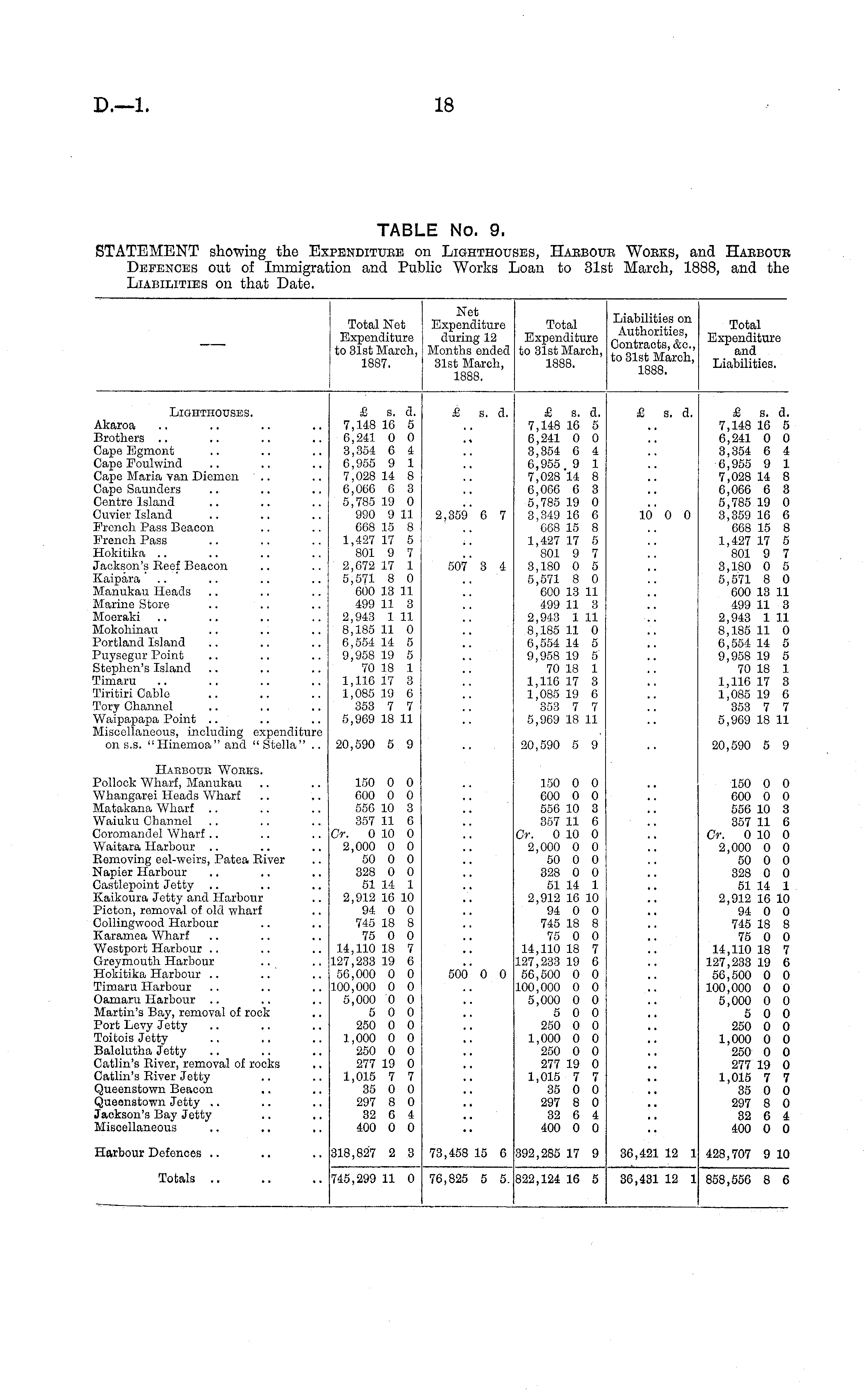 Total Net Expenditure to 31st March, 1887. Net Expenditure during 12 Months ended 31st March, 1888. Total Expenditure to 31st March, 1888. Liabilities on Authorities, Contracts, &c, to 31st March, 1888. Total Expenditure and Liabilities. Lighthouses. £ s. d. 7,148 10 5 6,241 0 0 3,354 6 4 6,955 9 1 7,028 14 8 6,066 0 3 5,785 19 0 990 9 11 668 15 8 1,427 17 5 801 9 7 2,672 17 1 5,571 8 0 600 13 11 499 11 3 2,943 1 11 8,185 11 0 6,554 14 5 9,958 19 5 70 18 1 1,116 17 3 1,085 19 6 353 7 7 5,909 18 11 £ s. d. £ s. d. 7,148 16 5 6,241 0 0 3,354 6 4 6,955 9 1 7,028 14 8 6,066 6 3 5,785 19 0 3,349 16 6 068 15 8 1,427 17 5 801 9 7 3,180 0 5 5,571 8 0 600 13 11 499 11 3 2,943 1 11 8,185 11 0 6,554 14 5 9,958 19 5 70 18 1 1,116 17 3 1,085 19 6 353 7 7 5,969 18 11 £ s. d. £ s. d. 7,148 16 5 6,241 0 0 3,354 0 4 6,955 9 1 7,028 14 8 6,066 6 3 5,785 19 0 3,359 16 6 668 15 8 1,427 17 5 801 9 7 3,180 0 5 5,571 8 0 600 13 11 499 11 3 2,943 1 11 8,185 11 0 6,554 14 5 9,958 19 5 70 18 1 1,116 17 3 1,085 19 6 353 7 7 5,969 18 11 Akaroa Brothers Cape Egmont Cape Foulwind Cape Maria van Diemen Cape Saunders Centre Island Cuvier Island French Pass Beacon French Pass Hokitika Jackson's Reef Beacon Kaipara Manukau Heads Marine Store Moeraki Mokoliinau Portland Island Puysegur Point Stephen's Island Timaru Tiritiri Cable Tory Channel .. .. Waipapapa Point Miscellaneous, including expenditure on s.s. "Hinemoa" and "Stella" .. 2,359 6 7 507 3 4 10 0 0 20,590 5 9 20,590 5 9 20,590 5 9 Habboue Wobks. Pollock Wharf, Manukau Whangarei Heads Wharf Matakana Wharf Waiuku Channel Coromandel Wharf Waitara Harbour Removing eel-weirs, Patea Eiver Napier Harbour Castlepoint Jetty .. Kaikoura Jetty and Harbour Picton, removal of old wharf Collingwood Harbour Karamea Wharf Westport Harbour .. Greyrnouth Harbour Hokitika Harbour Timaru Harbour Oamaru Harbour Martin's Bay, removal of rock Port Levy Jetty Toitois Jetty Balclutha Jetty Catlin's River, removal of rocks Catlin's River Jetty Queenstown Beacon Queenstown Jetty Jackson's Bay Jetty Miscellaneous 150 0 0 600 0 0 550 10 3 357 11 0 Cr. 0 10 0 2,000 0 0 50 0 0 328 0 0 51 14 1 2,912 16 10 94 0 0 745 18 8 75 0 0 14,110 18 7 127,233 19 6 56,000 0 0 100,000 0 0 5,000 0 0 5 0 0 250 0 0 1,000 0 0 250 0 0 277 19 0 1,015 7 7 35 0 0 297 8 0 32 6 4 400 0 0 150 0 0 600 0 0 556 10 3 357 11 6 Cr. 0 10 0 2,000 0 0 50 0 0 328 0 0 51 14 1 2,912 16 10 94 0 0 745 18 8 75 0 0 14,110 18 7 127,233 19 6 56,500 0 0 100,000 0 0 5,000 0 0 5 0 0 250 0 0 1,000 0 0 250 0 0 277 19 0 1,015 7 7 35 0 0 297 8 0 32 6 4 400 0 0 150 0 0 600 0 0 556 10 3 357 11 6 Cr. 0 10 0 2,000 0 0 50 0 0 328 0 0 51 14 1 2,912 16 10 94 0 0 745 18 8 75 0 0 14,110 18 7 127,233 19 6 56,500 0 0 100,000 0 0 5,000 0 0 5 0 0 250 0 0 1,000 0 0 250 0 0 277 19 0 1,015 7 7 35 0 0 297 8 0 32 6 & 400 0 0 500 0 0 Harbour Defences 318,827 2 3 73,458 15 6 392,285 17 9 36,421 12 1 428,707 9 10 Totals .. 745,299 11 0 76,825 5 5. 822,124 16 5 30,431 12 1 858,556 8 6