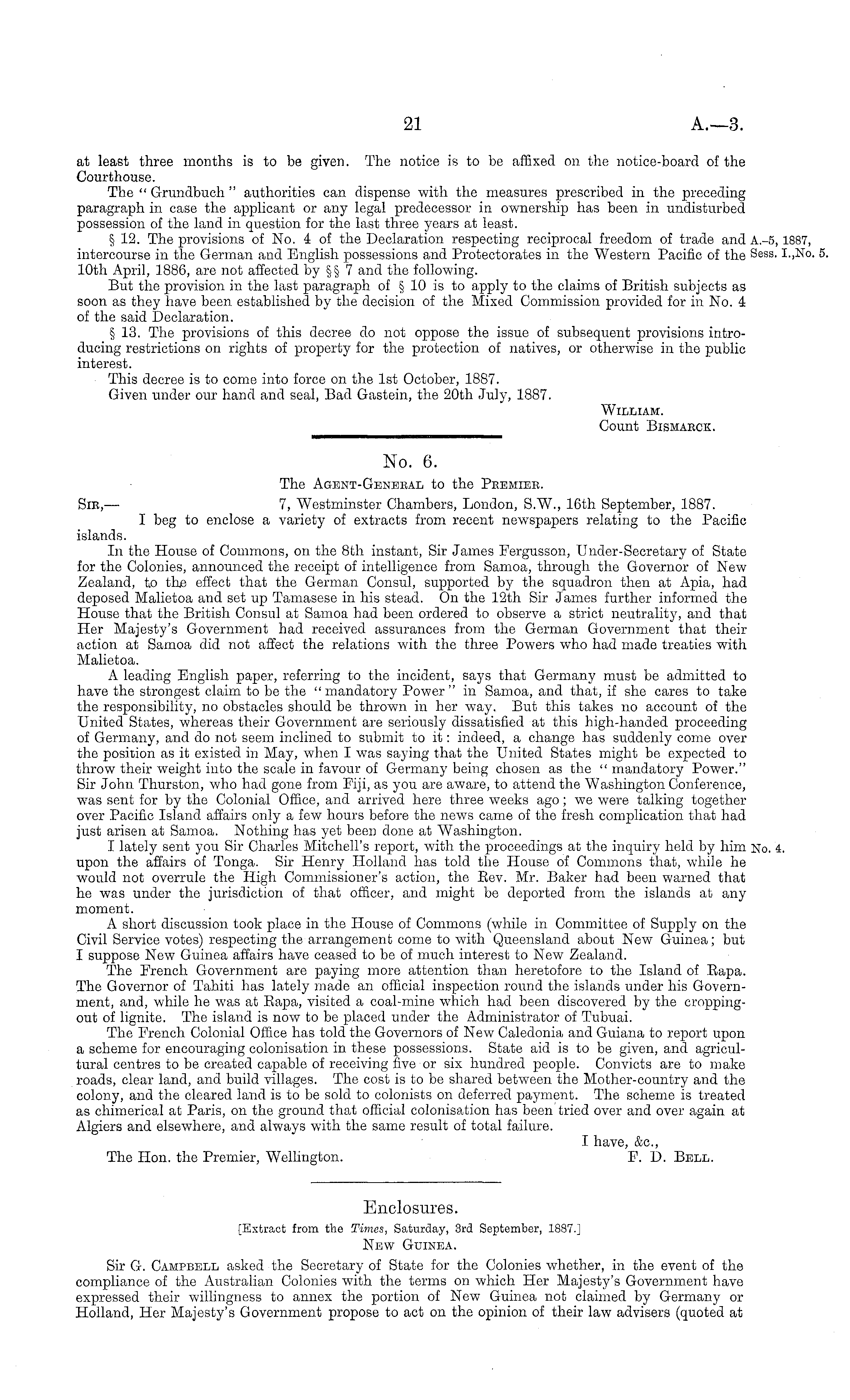 No. 6. The Agent-Genebal to the Premise. Sir, — 7, Westminster Chambers, London, S.W., 16th September, 1887. I beg to enclose a variety of extracts from recent newspapers relating to the Pacific islands. In the House of Commons, on the Bth instant, Sir James Fergusson, Under-Secretary of State for the Colonies, announced the receipt of intelligence from Samoa, through the Governor of New Zealand, to the effect that the German Consul, supported by the squadron then at Apia, had deposed Malietoa and set up Tamasese in his stead. On the 12th Sir James further informed the House that the British Consul at Samoa had been ordered to observe a strict neutrality, and that Her Majesty's Government had received assurances from the German Government that their action at Samoa did not affect the relations with the three Powers who had made treaties with Malietoa. A leading English paper, referring to the incident, says that Germany must be admitted to have the strongest claim to be the " mandatory Power " in Samoa, and that, if she cares to take the responsibility, no obstacles should be thrown in her way. But this takes no account of the United States, whereas their Government are seriously dissatisfied at this high-handed proceeding of Germany, and do not seem inclined to submit to it: indeed, a change has suddenly come over the position as it existed in May, when I was saying that the United States might be expected to throw their weight into the scale in favour of Germany being chosen as the " mandatory Power." Sir John Thurston, who had gone from Fiji, as you are aware, to attend the Washington Conference, was sent for by the Colonial Office, and arrived here three weeks ago; we were talking together over Pacific Island affairs only a few hours before the news came of the fresh complication that had just arisen at Samoa. Nothing has yet been done at Washington. I lately sent you Sir Charles Mitchell's report, with the proceedings at the inquiry held by him upon the affairs of Tonga. Sir Henry Holland has told the House of Commons that, while he would not overrule the High Commissioner's action, the Eev. Mr. Baker had been warned that he was under the jurisdiction of that officer, and might be deported from the islands at any moment. A short discussion took place in the House of Commons (while in Committee of Supply on the Civil Service votes) respecting the arrangement come to with Queensland about New Guinea; but I suppose New Guinea affairs have ceased to be of much interest to New Zealand. The French Government are paying more attention than heretofore to the Island of Eapa. The Governor of Tahiti has lately made an official inspection round the islands under his Government, and, while he was at Eapa, visited a coal-mine which had been discovered by the croppingout of lignite. The island is now to be placed under the Administrator of Tubuai. The French Colonial Office has told the Governors of New Caledonia and Guiana to report upon a scheme for encouraging colonisation in these possessions. State aid is to be given, and agricultural centres to be created capable of receiving five or six hundred people. Convicts are to make roads, clear land, and build villages. The cost is to be shared between the Mother-country and the colony, and the cleared land is to be sold to colonists on deferred payment. The scheme is treated as chimerical at Paris, on the ground that official colonisation has been tried over and over again at Algiers and elsewhere, and always with the same result of total failure. I have, &c, The Hon. the Premier, Wellington. F. D. Bell.