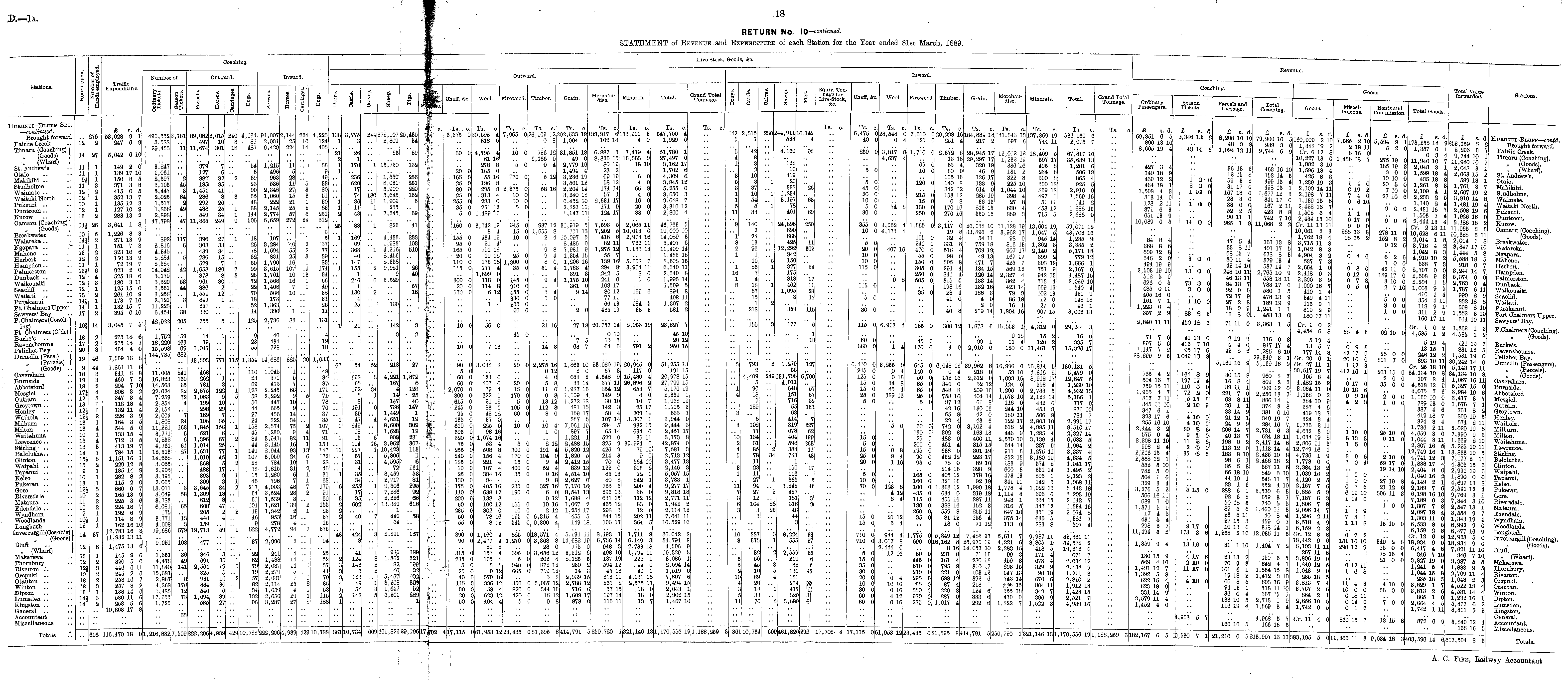 Stations. a I i ll Traffic g 8 Expenditure. Nnmbo] 0! Outwi Coaching. ird. Inwi i,rd. O o o Outwi ird. LivQ-Stock, Goods, &c. I i I I I O o y as I __ Equiv. TonAc. Inward. Grain. Uc^ u ' Minerals. Total. Grand Total Tonnage. Bovenue. II in R I I i n ft 5 Chail, &c. Wool. Firewood Timber. Grain. Merchandise. Minerals. Total. Grand Total Tonnage. Wool. Firewood. Timber. Coaching. Goods. Total Value forwarded. Stations. cu. Ordinary l'assongers. Season Tickets. Parcels and Luggage. Total Coaching. Goods. Miscellaneous. Bouts and Commission. Total Goods. Iurunui-Bluff Sec. — continued. Brought forward Fairlie Creek Timaru (Coaching) ] (Goocls) \ (Wharf) J St. Andrew's Otaio Makikihi .. Studholme Waimatc Waitaki North Pukeuri Duntroon Kurow Oamaru (Coaching) \ (Goods) f Breakwater Waiareka Ngapara Malicno Herbert Hampden Palmcrston Dunback Waikouaiti Soacliff Waitati Purakanui Pt. Chalmers Upper Sawyers' Bay P. Chalmers (Coach-] ing) r Pb. Chalmers (G'ds)J Burke's Ravonsbourne Pelichet Bay Dunedin (Pass.) ) (Parcels) J (Goods) .. Caversham Burnside Abbotsford Mosgiel Outram Greytown Henley Waihola, .. Milburn Hilton Waitahuna Lawrence Stirling Balclutha.. Clinton Waipahi Tapanui Kelso Pukerau Gore Riversdale Mataura Edendale Wyndham Woodlands Longbush Invercargill(Coach'g)) (Goods)) Bluff .. 1 „ (Wharf) } Makarewa Thornbury Riverton Orcpuki Otautau Winton .. Dipfcon Lumsden Kingston General Accountant Miscellaneous 12 14 11 11 9) 11 12 12 10 12 18 14J 10 14} 11 18 12 11 13J 12 12 12 13 145 14 17 16| 18 17 20 19 9 18 19 18 17} 12 18 12J 12.; 13 13 10 15 13 14 15j 16 9 10 13 32) .10 11 10 9 10J 12 11 !76 2 27 1 1 1 3 2 1 1 1 2 26 5 2 1 2 2 1 6 4 3 1 2 1 1 2 14 2 2 8 46 44 3 3 2 4 3 1 1 2 1 4 1 4 3 7 8 2 1 1 1 5 2 2 2 1 1 1 £ s. d. 53,028 9 1 247 6 9 5,042 6 10 149 2 0 139 17 10 150 8 5 371 3 8 415 0 6 352 13 7 135 12 3 127 10 9 283 13 2 3,641 1 8 1,226 8 3 271 13 0 151 7 3 323 16 6 150 13 0 72 19 7 923 2 0 525 18 6 180 3 11 125 15 0 261 10 9 173 7 10 132 15 7 395 0 10 3,045 7 5 275 18 6 275 13 7 464 4 0 7,569 16 8 7,261 11 6 341 5 8 400 7 8 294 7 10 008 3 2 347 3 4 118 18 4 132 11 4 226 3 9 164 3 5 544 5 0 133 15 4 712 3 5 413 19 7 784 15 1 1,151 16 1 229 12 8 135 14 9 282 8 2 115 2 0 660 0 7 105 13 9 225 3 6 224 18 7 192 6 9 114 8 9 162 16 10 (2,783 16 8 11,932 13 11 1,475 13 6 496,552! 3,588 I 29,433 3,247 1,001 2,597 3,105 5,447 2,025 1,517 1,866 2,898 ( 47,798 1 •■ 892 2,810 4,345 2,284 2,685 14,042 3,179 3,320 3,561 3,258 2,121 11,223 6,454 J 42,922 1,752 18,229 15,598| ( 144,735 11,005 16,823 14,568 22,024 7,259 2,854 2,154 2,004 1,808 11,221 3,771 9,252 4,761 12,513 14,668 3,065 2,903 3,398 2,065 13,011 3,049 3,783 6,081 175 3,771 4,008 79,686 3,181 11 2 45 3 84 2 49 47 117 0 5 42 53 44 "8 '38 206 ■59 403 I 69 1 682 i 241 i 160 I 65 , 82 I 72 4 89,082 497 11,674 379 127 382 185 1,454 286 292 488 549 11,865 896 308 439 286 529 1,058 378 901 880 1,554 849 257 330 755 14 79 1,047 43,503 '468 262 781 2,675 1,003 199 298 169 106 1,845 521 1,390 1,014 1,631 1,010 368 488 393 309 3,646 1,309 612 608 205 448 159 19,718 2,015 10 301 7 6 32 35 11 8 20 26 84 3 1!! 27 :■;:; 84 1.1 IK!) I! 30 2 12 1 1 771 "l 122 0 10 29 85 156 6 67 25 77 15 5 17 '. 3 84 18 8 47 4 240 8 18 "l 1 "l 7 1 iie 4,164 ■ 81 487 54 6 69 23 90 35 48 38 144 500 18 20 78 32 50 99 26 72 22 70 18 52 14 125 23 55 1,354 iio 28 69 128 58 50 44 :i; 24 158 45 84 44 149 107 28 38 15 46 217 04 61 101 13 46 9 522 91,007 2,031 6,420 1,215 496 963 636 2,340 1,000 222 2,145 2,774 5,659 107 3,284 1,094 831 1,790 3,015 1,701 1,568 1,406 568 173 1,803 890 2,736 40 434 728 141686 1,045 371 413 2,245 2,292 447 666 436 322 2,574 1,230 3,941 2,145 2,944 3,059 784 1,815 1,280 796 4,003 3,524 1,539 1,621 1,342 958 278 4,773 2,144 25 224 11 6 28 11 27 15 21 25 57 272 40 65 25 16 107 10 16 7 10 "l 83 825 1 66 g 10 14 34 75 9 82 16 93 24 10 81 6 48 28 3 "39 2 18 08 224 10 14 2: 14 18 1 1 '20 4,223 124 405 60 9 49 33 80 51 30 03 251 312 3 5 37 77 39 83 174 34 60 49 38 31 26 11 131 4 19 18 1,033 48 34 87 171 71 78 70 37 35 107 71 91 153 147 172 28 46 31 63 179 91 60 155 23 37 15 375 138 1 21 2 1 1 1 1 2 25 1 1 1 67 "54 '(108 65 192 8 191 39 47 242 18 194 227 57 31 4 35 84 255 17 35 602 3,775 8 26 1 170 230 620 17 74 86 11 43 "83 160 69 363 40 147 155 1 246 1 130 4 25 "21 244 1 180 11 1 1 1 "2 6 2 52 272,107 2,809 "85 15[730 1,550 8,031 5,900 3,045 1,909 236 7,345 820 4,433 1,988 4,216 2,456 2,358 9,921 9 8,529 130 142 3 '218 4,221 167 4 14 14J1 736 1,449 4,651 8,600 1,628 908 3,962 10,423 5,800 4,595 72 8,450 2,717 9,300 7,286 2,226 13,380 1 440 64 20, .130 34 ' '89 'i32 236 231 220 162 6 "69 "41 233 103 510 "26 40 ' 57 16 i| "27 1,872 6 128 25 40 147 1 la 309 19I 231 307 113 1 1 6 161 53 8,1 2915 912 66 618 . c. Ts. o. 6,675 01 30 0 20 0 165 0 25 0 80 0 25 0 255 0 35 0 5 0 160 0 155 0 95 0 165 0 20 0 110 0 115 0 300 0 20 0 170 0 10 0 10 0 00 0 5 0 60 0 CO 0 2,070 0 300 0 615 0 245 0 95 0 135 0 610 0 695 0 320 0 75 0 255 0 240 0 185 0 10 0 25 0 130 0 175 0 110 0 200 0 60 0 235 0 50 0 55 0 Ts. c. 30,598 4 818 0 4,795 4 61 16 278 8 1 105 0 i 55 10 1 190 8 1 205 8 1 313 4 I 283 0 I 251 12 I 1,489 10 1 3,742 12 3 4 ) 434 12 ) 21 4 ) 791 12 ) 19 12 ) 175 16 ) 177 4 1,699' 0 ) 118 0 ) 114 8 ) 0 12 'i 4 ) 56 0 ) 7 12 3 3,038 8 3 3 123 0 3 407 0 3 79 4 3 022 0 3 21 12 3 83 0 3 42 12 3 37 0 3 225 0 3 98 16 0 1,074 16 0 53 4 0 508 8 0 150 4 0 221 4 D 107 4 0 384 16 0 94 4 0 405 10 0 638 12 0 188 8 0 100 12 0 302 0 0 78 10 0 8 12 Ts. o. 7,005 0 10 0 '5 0 770 0 2,375 0 10 0 10 0 5 0 345 0 15 0 10 0 25 0 1,300 0 35 0 145 0 910 0 455 0 330 0 255 0 00 0 45 0 20 0 Ts. c. 26,109 12 0 8 726 12 2,160 0 0 4 "a 12 53 10 937 12 1,655 8 2 4 9 8 9 4 8 0 31 4 9 4 3 4 1 0 21 16 14 8 2,275 16 0 12 4 0 5 8 11 0 0 8 13 12 112 S 8 0 Ts. c. 202,533 19 1,004 0 31,851 18 49 0 2,779 10 1,494 4 3,236 19 3,561 12 2,204 14 3,240 18 6,452 10 2,827 11 1,147 11 31,919 5 111 13 10,097 5 2,4S0 0 7,981 9 1,354 15 1,206 16 1,783 4 391 3 1,175 10 361 0 9 14 "2 0 27 18 "7 5 63 7 1,805 1