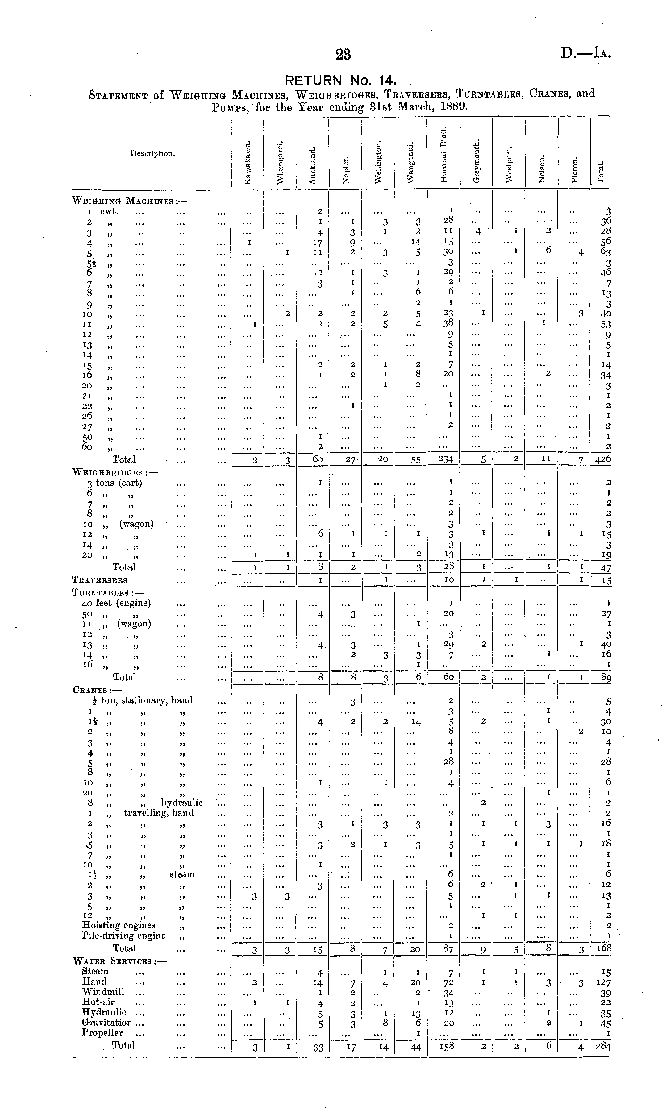 RETURN No. 14. Statement of Weighing Machines, Weighbridges, Traversers, Turntables, Cranes, and Pumps, for the Year ending 31st March, 1889.