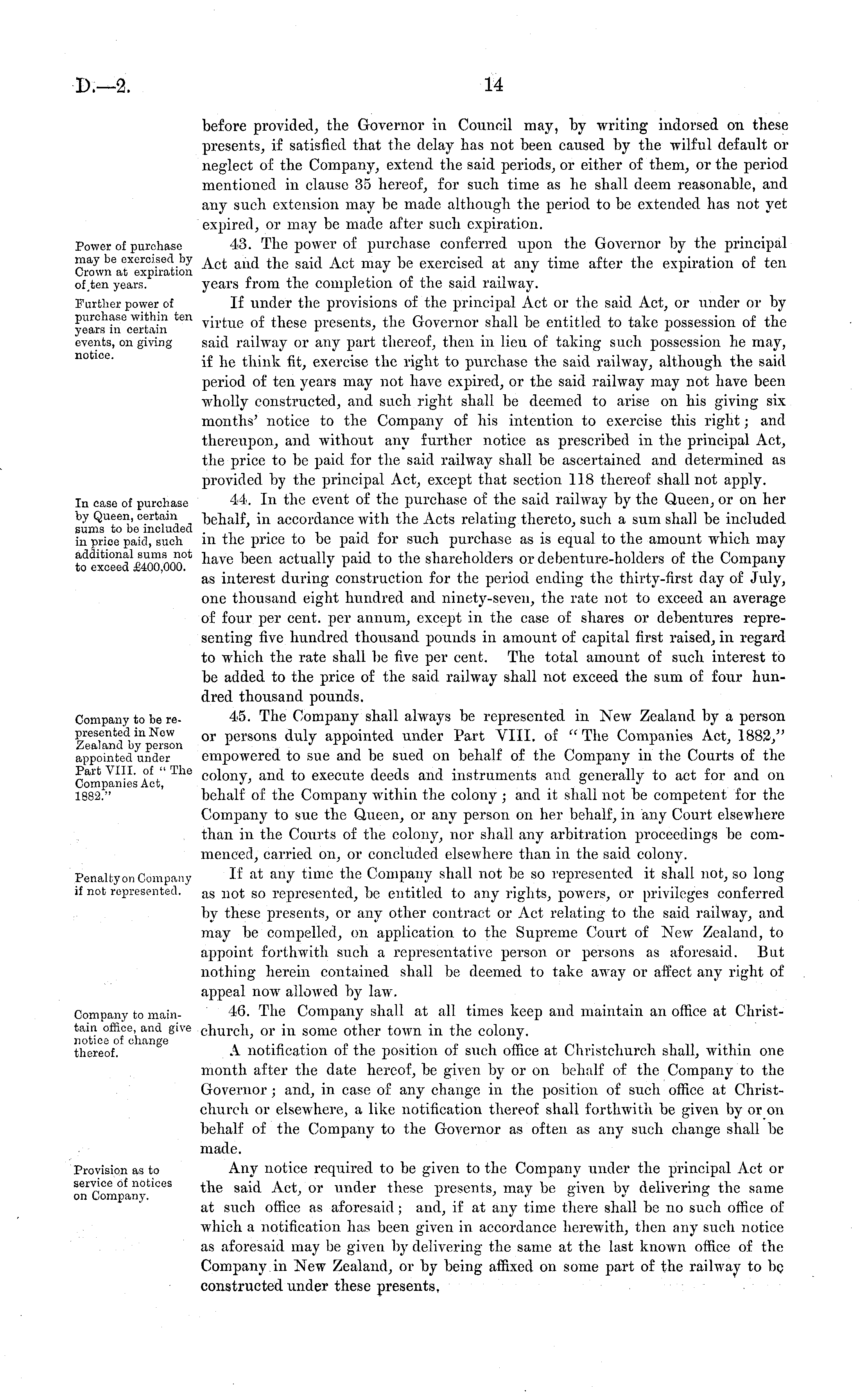 before provided, the Governor in Council may, by writing indorsed on these presents, if satisfied that the delay has not been caused by the wilful default or neglect of the Company, extend the said periods, or either of them, or the period mentioned in clause 35 hereof, for such time as he shall deem reasonable, and any such extension may be made although the period to be extended has not yet expired, or may be made after such expiration. 43. The power of purchase conferred upon the Governor by the principal Act and the said Act may be exercised at any time after the expiration of ten years from the completion of the said railway. If under the provisions of the principal Act or the said Act, or under or by virtue of these presents, the Governor shall be entitled to take possession of the said railway or any part thereof, then in lieu of taking such possession he may, if he think fit, exercise the right to purchase the said railway, although the said period of ten years may not have expired, or the said railway may not have been wholly constructed, and such right shall be deemed to arise on his giving six months' notice to the Company of his intention to exercise this right; and thereupon, and without any further notice as prescribed in the principal Act, the price to be paid for the said railway shall be ascertained and determined as provided by the principal Act, except that section 118 thereof shall not apply. 44. In the event of the purchase of the said railway by the Queen, or on her behalf, in accordance with the Acts relating thereto, such a sum shall be included in the price to be paid for such purchase as is equal to the amount which may have been actually paid to the shareholders or debenture-holders of the Company as interest during construction for the period ending the thirty-first day of July, one thousand eight hundred and ninety-seven, the rate not to exceed an average of four per cent, per annum, except in the case of shares or debentures representing five hundred thousand pounds in amount of capital first raised, in regard to which the rate shall be five per cent. The total amount of such interest to be added to the price of the said railway shall not exceed the sum of four hundred thousand pounds. 45. The Company shall always be represented in New Zealand by a person or persons duly appointed under Part VIII. of "The Companies Act, 1882," empowered to sue and be sued on behalf of the Company in the Courts of the colony, and to execute deeds and instruments and generally to act for and on behalf of the Company within the colony ; and it shall not be competent for the Company to sue the Queen, or any person on her behalf, in any Court elsewhere than in the Courts of the colony, nor shall any arbitration proceedings be commenced, carried on, or concluded elsewhere than in the said colony. If at any time the Company shall not be so represented it shall not, so long as not so represented, be entitled to any rights, powers, or privileges conferred by these presents, or any other contract or Act relating to the said railway, and may be compelled, on application to the Supreme Court of New Zealand, to appoint forthwith such a representative person or persons as aforesaid. But nothing herein contained shall be deemed to take away or affect any right of appeal now allowed by law. 46. The Company shall at all times keep and maintain an office at Christchurch, or in some other town in the colony. A notification of the position of such office at Christchurch shall, within one month after the date hereof, be given by or on behalf of the Company to the Governor; and, in case of any change in the position of such office at Christchurch or elsewhere, a like notification thereof shall forthwith be given by or on behalf of the Company to the Governor as often as any such change shall be made. Any notice required to be given to the Company under the principal Act or the said Act, or under these presents, may be given by delivering the same at such office as aforesaid; and, if at any time there shall be no such office of which a notification has been given in accordance herewith, then any such notice as aforesaid may be given by delivering the same at the last known office of the; Company in New Zealand, or by being affixed on some part of the railway to be constructed under these presents.