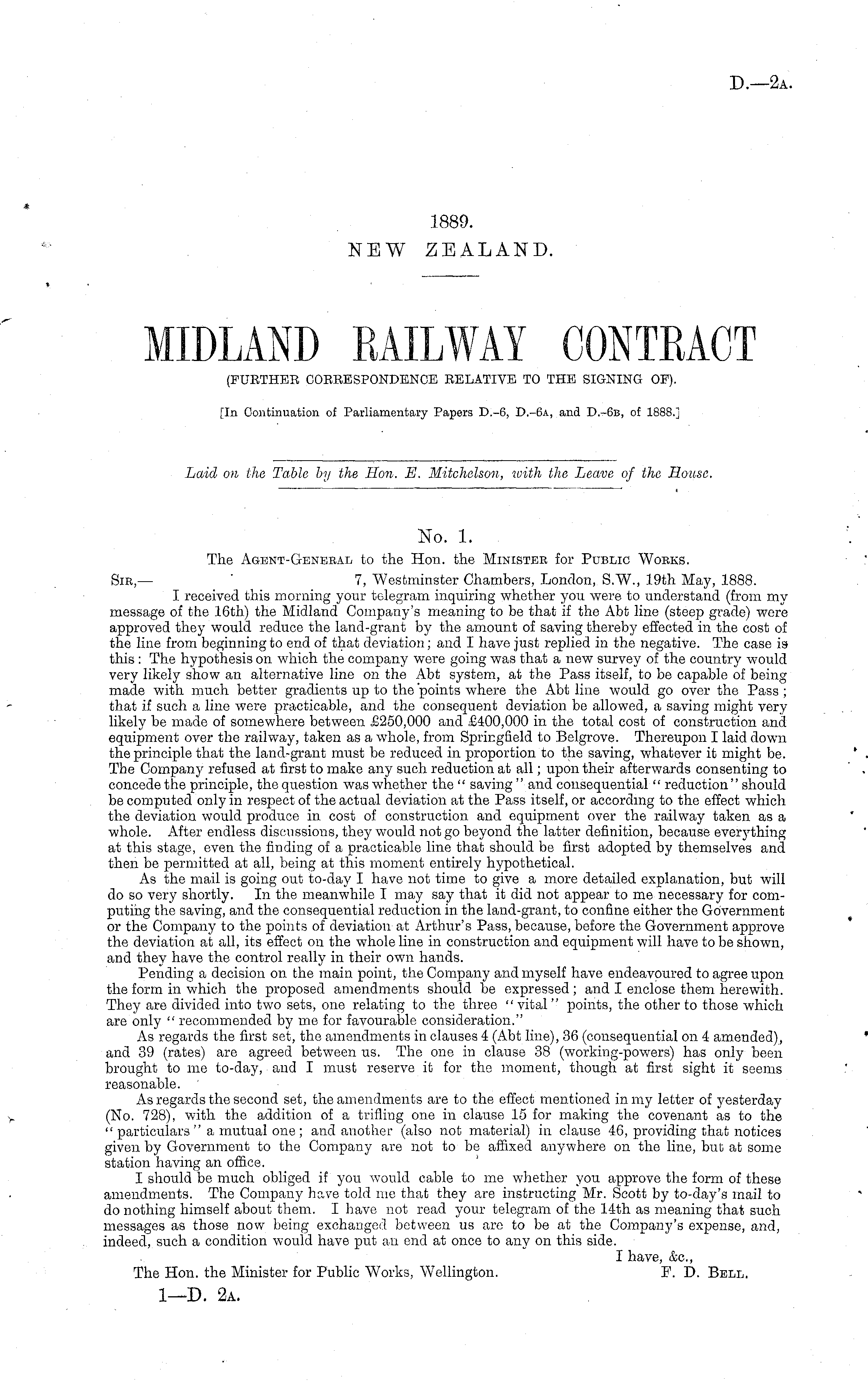 No. 1. The Agent-General to the Hon. the Minister for Public Works. Sir,— ' 7, Westminster Chambers, London, S.W., 19th May, 1888. I received this morning your telegram inquiring whether you were to understand (from my message of the 16th) the Midland Company's meaning to be that if the Abt line (steep grade) were approved they would reduce the land-grant by the amount of saving thereby effected in the cost of the line from beginning to end of that deviation; and I have just replied in the negative. The case is this : The hypothesis on which the company were going was that a new survey of the country would very likely show an alternative line on the Abt system, at the Pass itself, to be capable of being made with much better gradients up to the 'points where the Abt line would go over the Pass ; that if such a line were practicable, and the consequent deviation be allowed, a saving might very likely be made of somewhere between £250,000 and £400,000 in the total cost of construction and equipment over the railway, taken as a whole, from Springfield to Belgrove. Thereupon I laid down the principle that the land-grant must be reduced in proportion to the saving, whatever it might be. The Company refused at first to make any such reduction at all; upon their afterwards consenting to concede the principle, the question was whether the " saving " and consequential " reduction" should be computed only in respect of the actual deviation at the Pass itself, or according to the effect which the deviation would produce in cost of construction and equipment over the railway taken as a whole. After endless discussions, they would not go beyond the latter definition, because everything at this stage, even the finding of a practicable line that should be first adopted by themselves and then be permitted at all, being at this moment entirely hypothetical. As the mail is going out to-day I have not time to give a more detailed explanation, but will do so very shortly. In the meanwhile I may say that it did not appear to me necessary for computing the saving, and the consequential reduction in the land-grant, to confine either the Government or the Company to the points of deviation at Arthur's Pass, because, before the Government approve the deviation at all, its effect on the whole line in construction and equipment will have to be shown, and they have the control really in their own hands. Pending a decision on the main point, the Company and myself have endeavoured to agree upon the form in which the proposed amendments should be expressed ; and I enclose them herewith. They are divided into two sets, one relating to the three "vital" points, the other to those which are only " recommended by mo for favourable consideration." As regards the first set, the amendments in clauses 4 (Abt line), 36 (consequential on 4 amended), and 39 (rates) are agreed between us. The one in clause 38 (working-powers) has only been brought to me to-day, and I must reserve it for the moment, though at first sight it seems reasonable. As regards the second set, the amendments are to the effect mentioned in my letter of yesterday (No. 728), with the addition of a trifling one in clause 15 for making the covenant as to the " particulars " a mutual one ; and another (also not material) in clause 46, providing that notices given by Government to the Company are not to be affixed, anywhere on the line, but at some station having an office. I should be much obliged if you would cable to me whether you approve the form of these amendments. The Company have told me that they are instructing Mr. Scott by to-day's mail to do nothing himself about them. I have not read your telegram of the 14th as meaning that such messages as those now being exchange:! between us are to be at the Company's expense, and, indeed, such a condition would have put an end at once to any on this side. I have, &c., The Hon. the Minister for Public Works, Wellington. F. D. Bell.