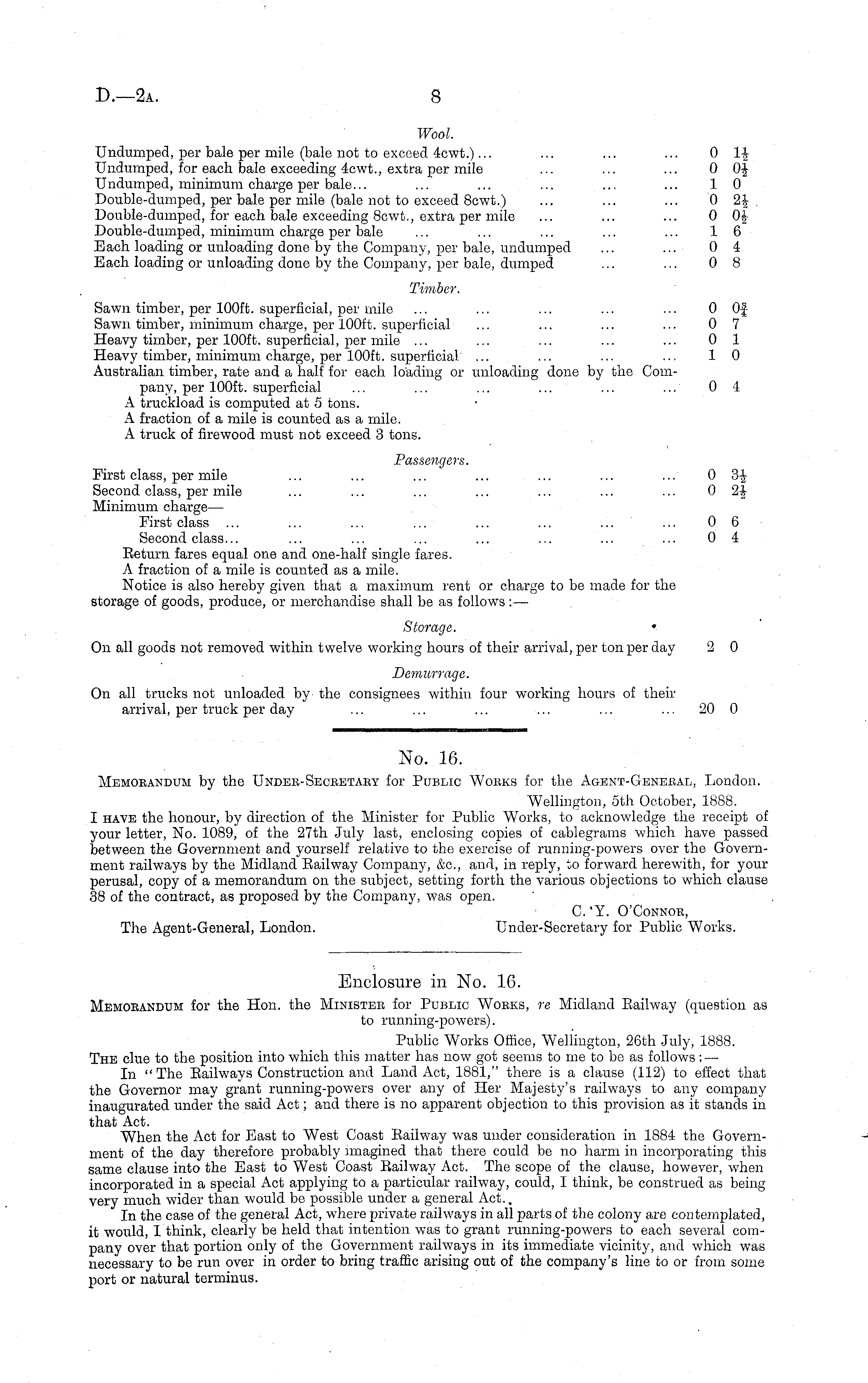 Wool. Undumped, per bale per mile (bale not to exceed 4cwt.)... ... ... ... 0 H Undumped, for each bale exceeding 4cwt., extra per mile ... ... ... 0 OJ Undumped, minimum charge per bale... ... ... ... ... ... 10 Double-dumped, per bale per mile (bale not to exceed Bcwt.) ... ... ... 0 2^ Double-dumped, for each bale exceeding Bcwt., extra per mile ... ... ... 0 0| Double-dumped, minimum charge per bale ... ... ... ... ... 16 Each loading or unloading done by the Company, per bale, undumped ... ... 0 4 Each loading or unloading done by the Company, per bale, dumped ... ... 0 8 Timber. Sawn timber, per 100 ft. superficial, per mile ... ... ... ... ... 0 Of Sawn timber, minimum charge, per 100 ft. superficial ... ... ... ... 0 7 Heavy timber, per 100 ft. superficial, per mile ... ... ... ... ... 0 1 Heavy timber, minimum charge, per 100 ft. superficial ... ... ... ... 10 Australian timber, rate and a half for each loading or unloading done by the Company, per 100 ft. superficial ... ... ... ... ... ... 04 A truckload is computed at 5 tons. A fraction of a mile is counted as a mile. A truck of firewood must not exceed 3 tons. Passengers. First class, per mile ... ... ... ... ... ... ... 0 3f Second class, per mile .... ... ... ... ... ... ... 0 2-J-Minimum charge— First class ... ... ... ... ... ... ... ... 0 . Second class... ... ... ... ... ... ... ... 0 4 Return fares equal one and one-half single fares. A fraction of a mile is counted as a mile. Notice is also hereby given that a maximum rent or charge to be made for the storage of goods, produce, or merchandise shall be as follows : — Storage. • On all goods not removed within twelve working hours of their arrival, per ton per day 2 0 Demurrage. On all trucks not unloaded by the consignees within four working hours of thenarrival, per truck per day ... ... ... ... ... ... 20 0 No. 16. Memorandum by the Under-Secretary for Public Works for the Agent-General, London. Wellington, sth October, 1888. I have the honour, by direction of the Minister for Public W T orks, to acknowledge the receipt of your letter, No. 1089, of the 27th July last, enclosing copies of cablegrams which have passed between the Government and yourself relative to the exercise of running-powers over the Government railways by the Midland Railway Company, &c, and, in reply, to forward herewith, for your perusal, copy of a memorandum on the subject, setting forth the various objections to which clause 38 of the contract, as proposed by the Company, Was open. C.'V. O'Connor, The Agent-General, London. Under-Secretary for Public Works. Enclosure in No. 16. Memorandum for the Hon. the Minister for Public Works, re Midland Railway (question as to running-powers). Public Works Office, Wellington, 26th July, 1888. The clue to the position into which this matter has now got seems to me to be as follows: — In "The Railways Construction and Land Act, 1881," there is a clause (112) to effect that the Governor may grant running-powers over any of Her Majesty's railways to any company inaugurated under the said Act; and there is no apparent objection to this provision as it stands in that Act. When the Act for East to West Coast Railway was under consideration in 1884 the Government of the day therefore probably imagined that there could be no harm in incorporating this same clause into the East to West Coast Railway Act. The scope of the clause, however, when incorporated in a special Act applying to a particular railway, could, I think, be construed as being very much wider than would be possible under a general Act., In the case of the general Act, where private railways in all parts of the colony are contemplated, it would, I think, clearly be held that intention was to grant running-powers to each several company over that portion only of the Government railways in its immediate vicinity, and which was necessary to be run over in order to bring traffic arising out of the company's line to or from some port or natural terminus.