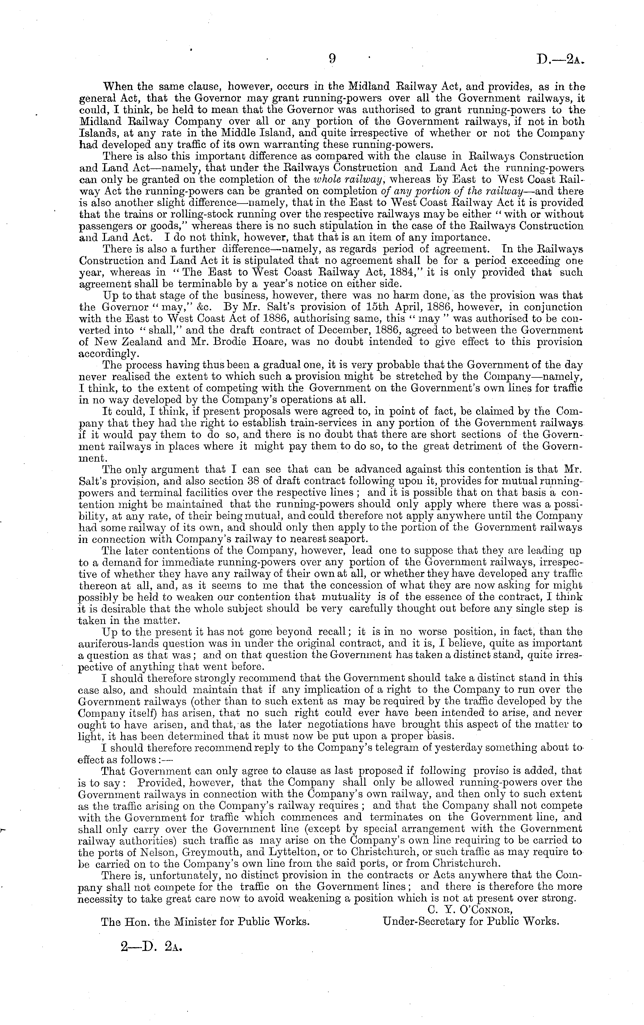 When the same clause, however, occurs in the Midland Railway Act, and provides, as in the general Act, that the Governor may grant running-powers over all the Government railways, it could, I think, be held to mean that the Governor was authorised to grant running-powers to the Midland Railway Company over all or any portion of the Government railways, if not in both Islands, at any rate in the Middle Island, and quite irrespective of whether or not the Company had developed any traffic of its own warranting these running-powers. There is also this important difference as compared with the clause in Railways Construction and Land Act—namely, that under the Railways Construction and Land Act the running-powers can only be granted on the completion of the whole railway, whereas by East to West Coast Railway Act the running-powers can be granted on completion of any portion of the railway —and there is also another slight difference—namely, that in the East to West Coast Railway Act it is provided that the trains or rolling-stock running over the respective railways maybe either " with or without passengers or goods," whereas there is no such stipulation in the case of the Railways Construction and Land Act. Ido not think, however, that that is an item of any importance. There is also a further difference—namely, as regards period of agreement. In the Railways Construction and Land Act it is stipulated that no agreement shall be for a period exceeding one year, whereas in " The East to West Coast Railway Act, 1884," it is only provided that such agreement shall be terminable by a year's notice on either side. Up to that stage of the business, however, there was no harm done, as the provision was that the Governor " may," &c. By Mr. Salt's provision of 15th April, 1886, however, in conjunction with the East to West Coast Act of 1886, authorising same, this " may " was authorised to be converted into " shall," and the draft contract of December, 1886, agreed to between the Government of New Zealand and Mr. Brodie Hoare, was no doubt intended to give effect to this provision accordingly. The process having thus been a gradual one, it is very probable that the Government of the day never realised the extent to which such a provision might be stretched by the Company—namely, I think, to the extent of competing with the Government on the Government's own lines for traffic in no way developed by the Company's operations at all. It could, I think, if present proposals were agreed to, in point of fact, be claimed by the Company that they had the right to establish train-services in any portion of the Government railways if it would pay them to do so, and there is no doubt that there are short sections of the Government railways in places where it might pay them to do so, to the great detriment of the Government. The only argument that I can see that can be advanced against this contention is that Mr. Salt's provision, and also section 38 of draft contract following upon it, provides for mutual runningpowers and terminal facilities over the respective lines ; and it is possible that on that basis a contention might be maintained that the running-powers should only apply where there was a possibility, at any rate, of their being mutual, and could therefore not apply anywhere until the Company had some railway of its own, and should only then apply to the portion of the Government railways in connection with Company's railway to nearest seaport. The later contentions of the Company, however, lead one to suppose that they are leading up to a demand for immediate running-powers over any portion of the Government railways, irrespective of whether they have any railway of their own at all, or whether they have developed any traffic thereon at all, and, as it seems to me that the concession of what they are now asking for might possibly be held to weaken our contention that mutuality is of the essence of the contract, I think it is desirable that the whole subject should be very carefully thought out before any single step is taken in the matter. Up to the present it has not gone beyond recall; it is in no worse position, in fact, than the auriferous-lands question was in under the original contract, and it is, I believe, quite as important a question as that was ; and on that question the Government has taken a distinct stand, quite irrespective of anything that went before. I should therefore strongly recommend that the Government should take a distinct stand in this case also, and should maintain that if any implication of a right to the Company to run over the Government railways (other than to such extent as may be required by the traffic developed by the Company itself) has arisen, that no such right could ever have been intended to arise, and never ought to have arisen, and that, as the later negotiations have brought this aspect of the matter to light, it has been determined that it must now be put upon a proper basis. I should therefore recommend reply to the Company's telegram of yesterday something about toeffect as follows : — That Government can only agree to clause as last proposed if following proviso is added, that is to say : Provided, however, that the Company shall only be allowed running-powers over the Government railways in connection with the Company's own railway, and then only to such extent as the traffic arising on the Company's railway requires ; and that the Company shall not compete with the Government for traffic which commences and terminates on the Government line, and shall only carry over the Government line (except by special arrangement with the Government railway authorities) such traffic as may arise on the Company's own line requiring to be carried to the ports of Nelson, Greymouth, and Lyttelton, or to Christchurch, or such traffic as may require to be carried on to the Company's own line from the said ports, or from Christchurch. There is, unfortunately,