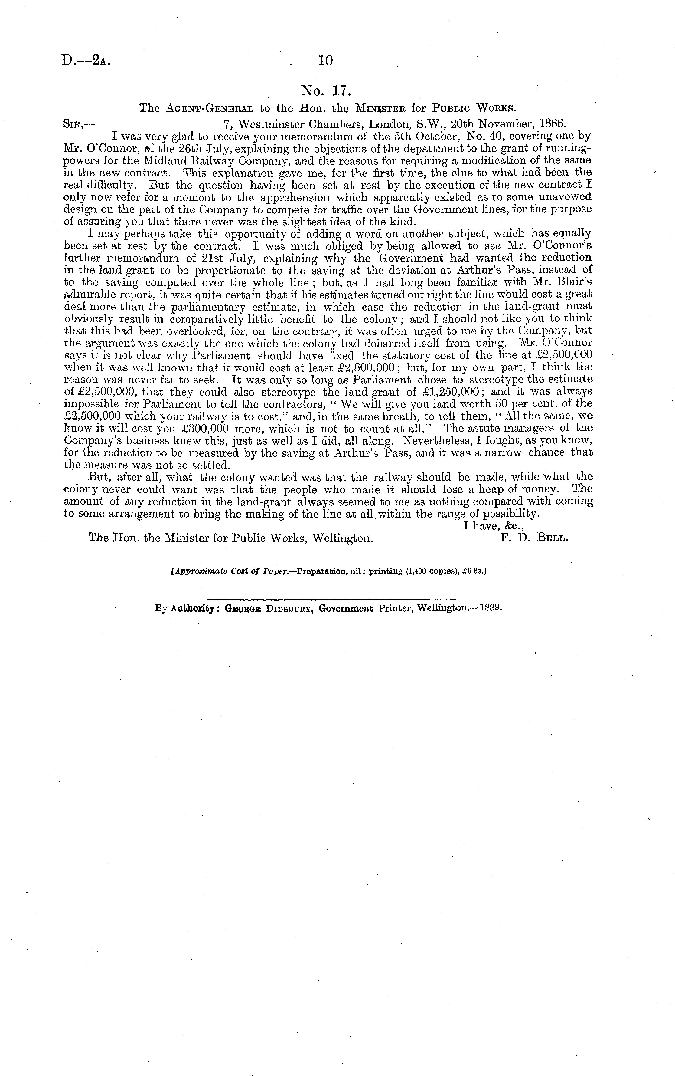 No. 17. The Agent-General to the Hon. the Minister for Public Works. Sir, — 7, Westminster Chambers, London, S.W., 20th November, 1888. I was very glad to receive your memorandum of the sth October, No. 40, covering one by Mr. O'Connor, of the 26th July, explaining the objections of the department to the grant of runningpowers for the Midland Railway Company, and the reasons for requiring a modification of the same in the new contract. This explanation gave me, for the first time, the clue to what had been the real difficulty. But the question having been set at rest by the execution of the new contract I only now refer for a moment to the apprehension which apparently existed as to some unavowed design on the part of the Company to compete for traffic over the Government lines, for the purpose of assuring you that there never was the slightest idea of the kind. I may perhaps take this opportunity of adding a word on another subject, which has equally been set at rest by the contract. I was much obliged by being allowed to see Mr. O'Connor's further memorandum of 21st July, explaining why the Government had wanted the reduction in the land-grant to be proportionate to the saving at the deviation at Arthur's Pass, instead. of to the saving computed over the whole line ; but, as I had long been familiar with Mr. Blair's admirable report, it was quite certain that if his estimates turned out right the line would cost a great deal more than the parliamentary estimate, in which case the reduction in the land-grant must obviously result in comparatively little benefit to the colony; and I should not like you to think that this had been overlooked, for, on tho contrary, it was often urged to me by the Company, but the argument was exactly the one which the colony had debarred itself from using. Mr. O'Connor ■says it is not clear why Parliament should have fixed the statutory cost of the line at £2,500,000 when it was well known that it would cost at least £2,800,000; but, for my own part, I think the reason was never far to seek. It was only so long as Parliament chose to stereotype the estimate of £2,500,000, that they could also stereotype the land-grant of £1,250,000; and it was always impossible for Parliament to tell the contractors, " We will give you land worth 50 per cent, of the £2,500,000 which your railway is to cost," and, in the same breath, to tell them, " All the same, we know it will cost you £300,000 more, which is not to count at all." The astute managers of the Company's business knew this, just as well as I did, all along. Nevertheless, I fought, as you know, for the reduction to be measured by the saving at Arthur's Pass, and it was a narrow chance that the measure was not so settled. But, after all, what the colony wanted was that the railway should be made, while what the -colony never could want was that the people who made it should lose a heap of money. The amount of any reduction in the land-grant always seemed to me as nothing compared with coming to some arrangement to bring the making of the line at all within the range of possibility. I have, &c, The Hon, the Minister for Public Works, Wellington. F. D. Bell. [Approximate Cost of Paper— Preparation, nil; printing (1,100 copies), £0 3s.]