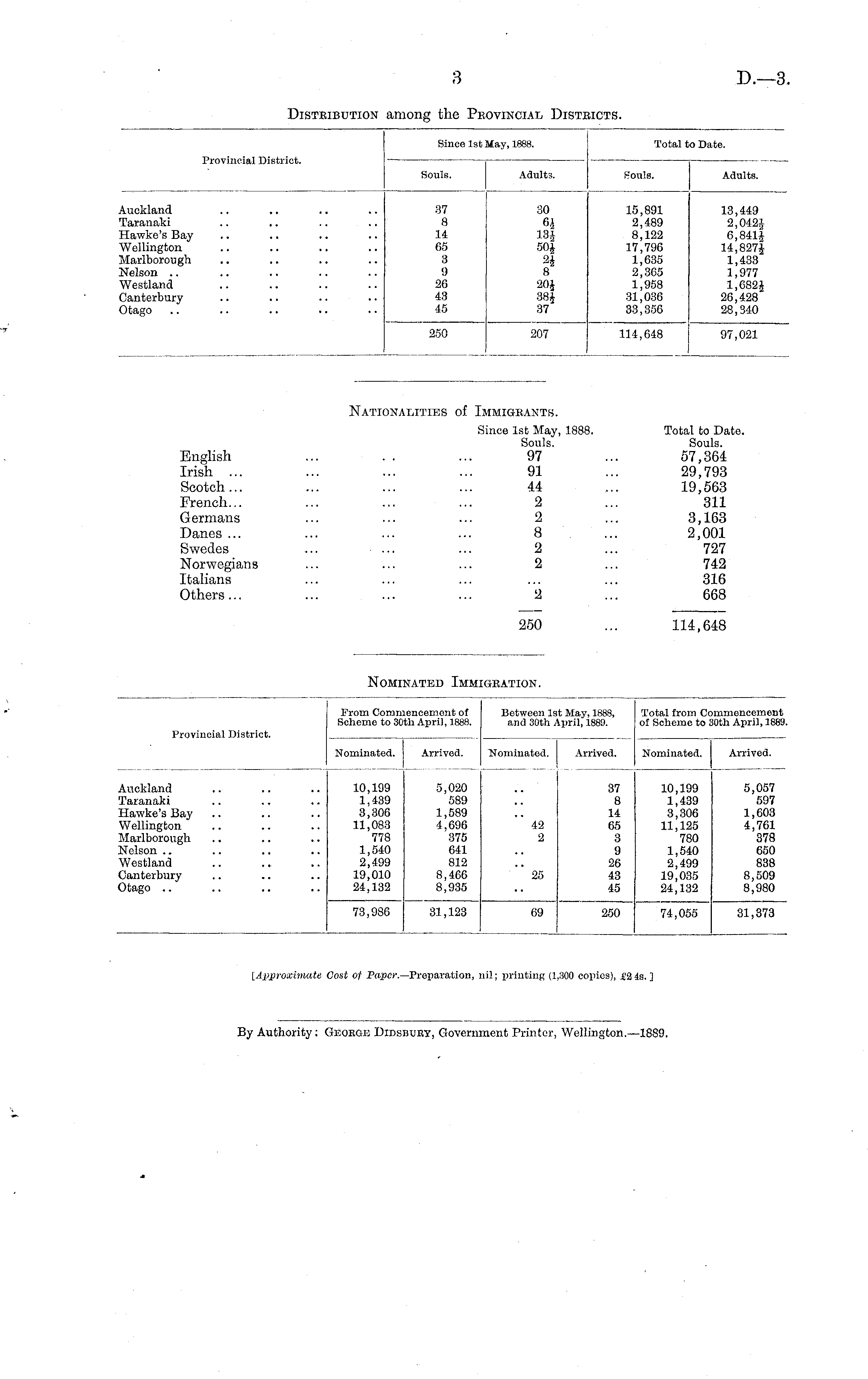 From Corar Scheme to 3( jencemont of )th April, 1888. Between li and 30th it May, 1888, ipril, 1889. Total from Commencement of Scheme to 80th April, 1889. Provincial District. Nominated. Arrived. Nominated. Arrived. Nominated. Arrived. Auckland Paranaki ilawke's Bay Wellington ilarlborough kelson .. iYestiand Canterbury )tago .. 10,199 1,439 3,306 11,083 778 1,540 2,499 19,010 24,132 5,020 589 1,589 4,696 375 641 812 8,466 8,935 42 2 37 8 14 63 3 9 26 43 45 10,199 1,439 3,306 11,125 780 1,540 2,499 19,035 24,132 5,057 597 1,603 4,761 378 650 838 8,509 8,980 25 73,986 31,123 69 250 74,055 31,373