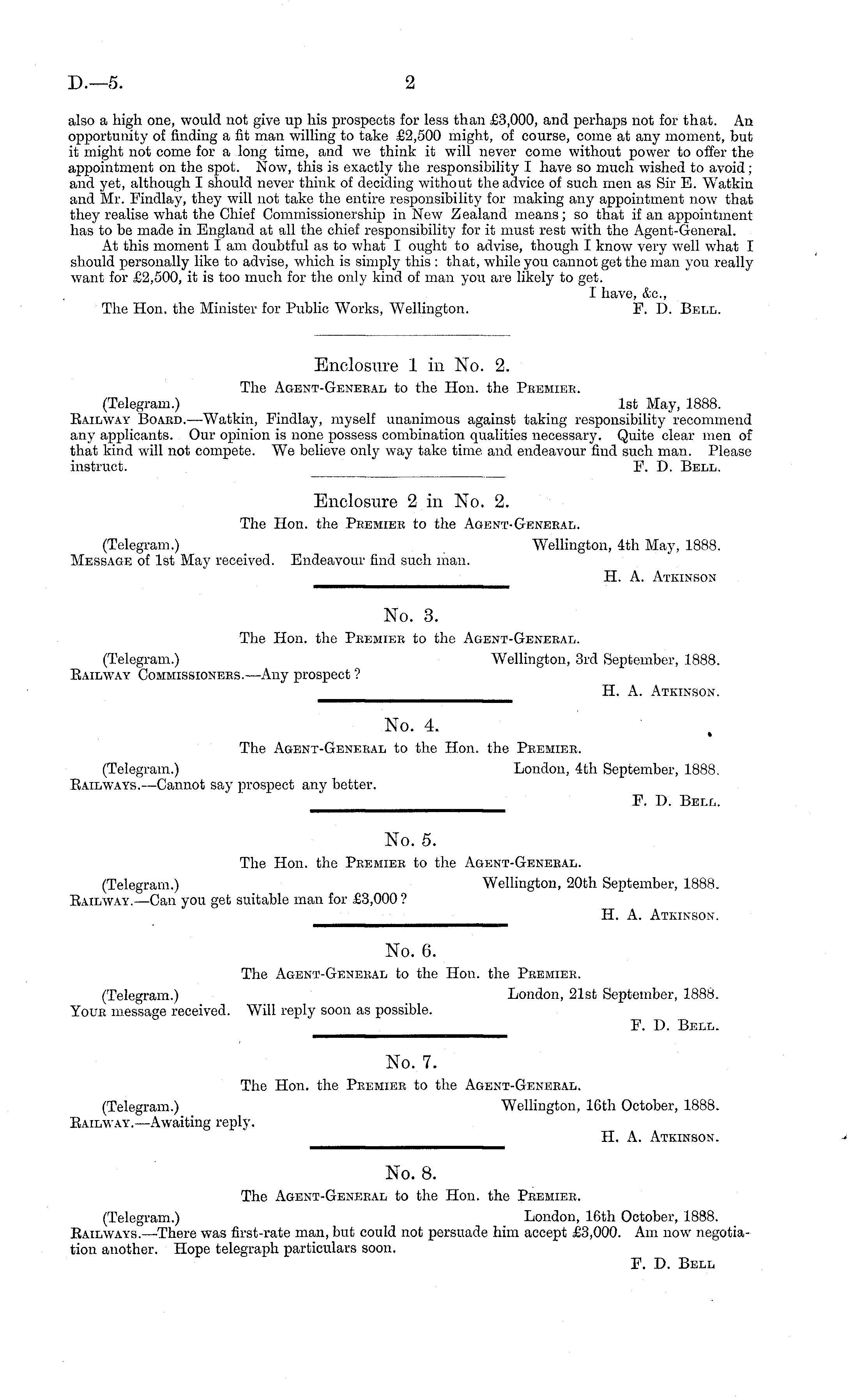 No. 8. The Agent-General to the Hon. the Premier. (Telegram.) London, 16th October, 1888. Bailways.—There was first-rate man, but could not persuade him accept £3,000. Am now negotiation another. Hope telegraph particulars soon. F. D. Bell